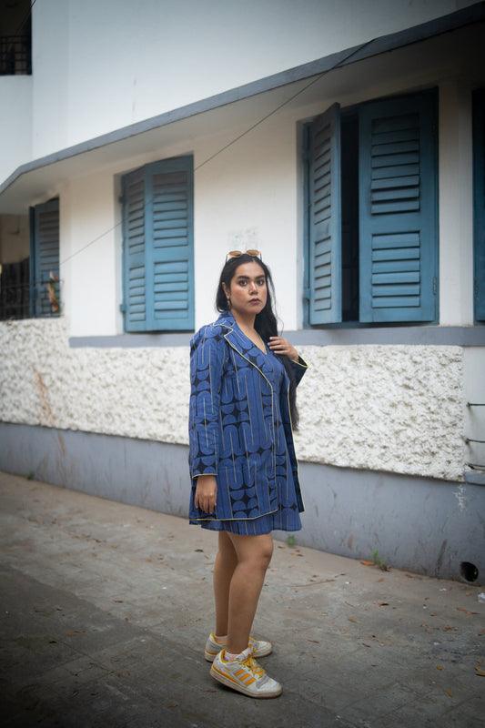 Blue&Black Geometric Printed Jacket and Sleeveless dress (Set of 2)