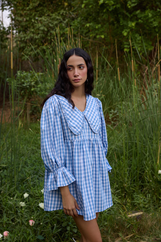 Blue Checked Flared Mini Dress