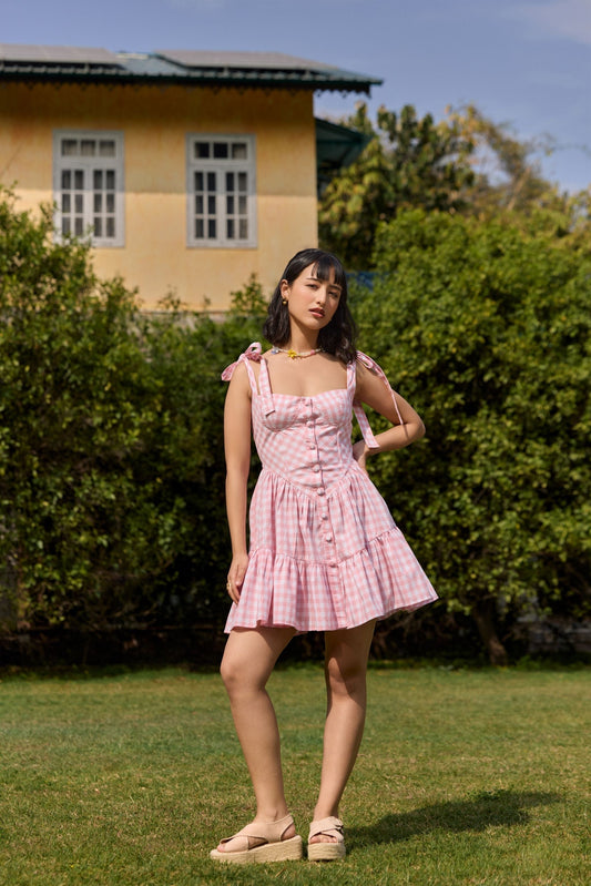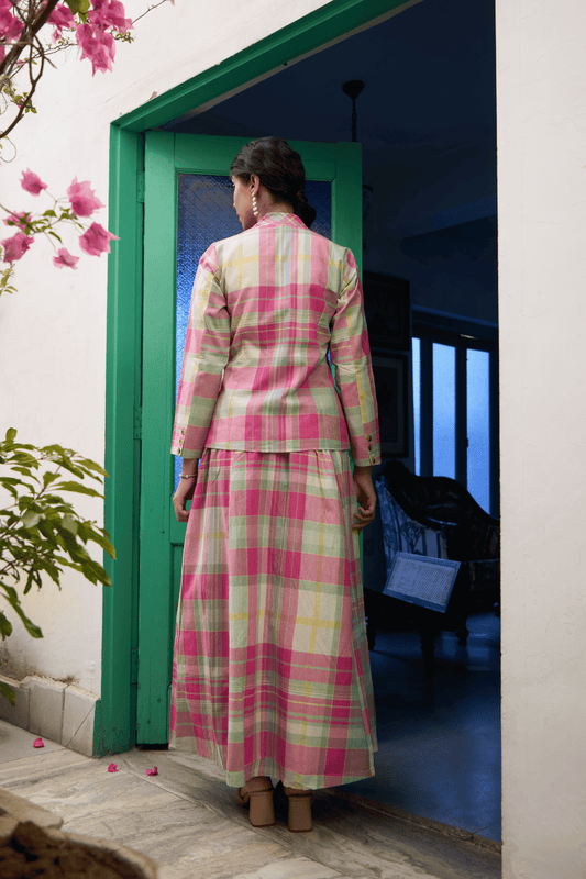 Pink & mint green Madras Cottcon checks Jacket & Skirt