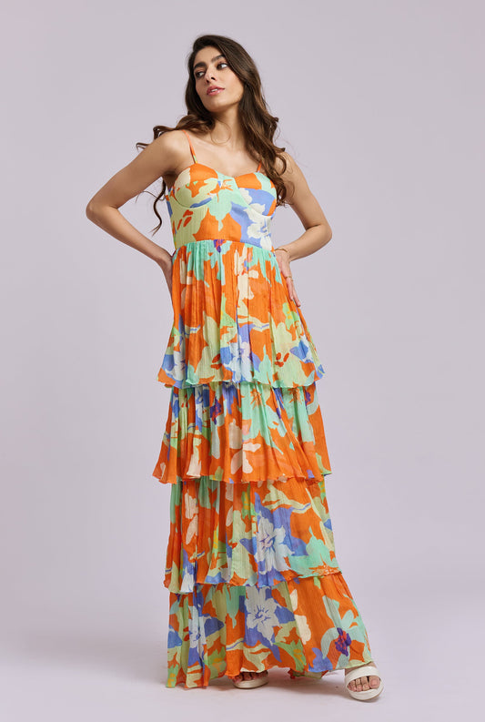 Victoria Strappy Pink Flower Print Pleated And Flowy Maxi Dress