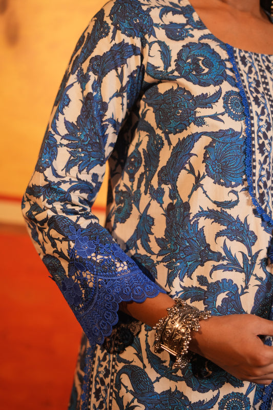 Blue Floral Print Cotton Kurta set with Dupatta
