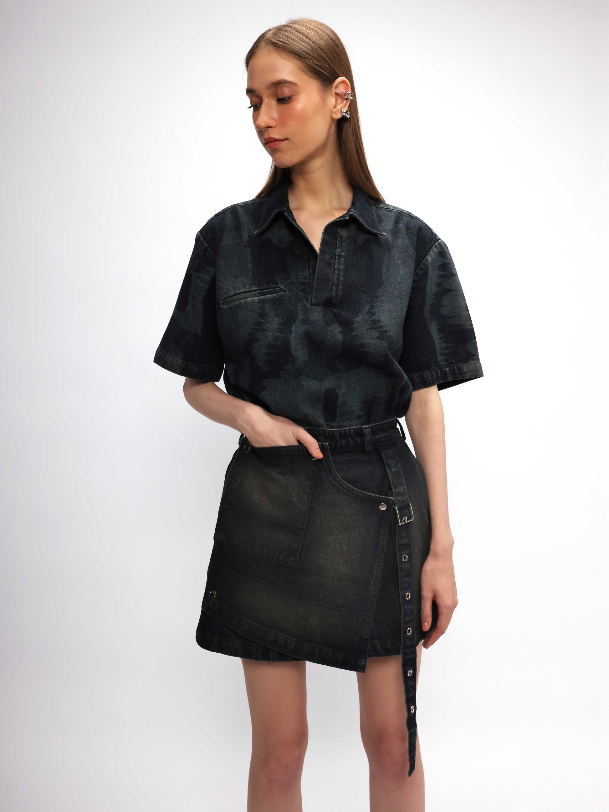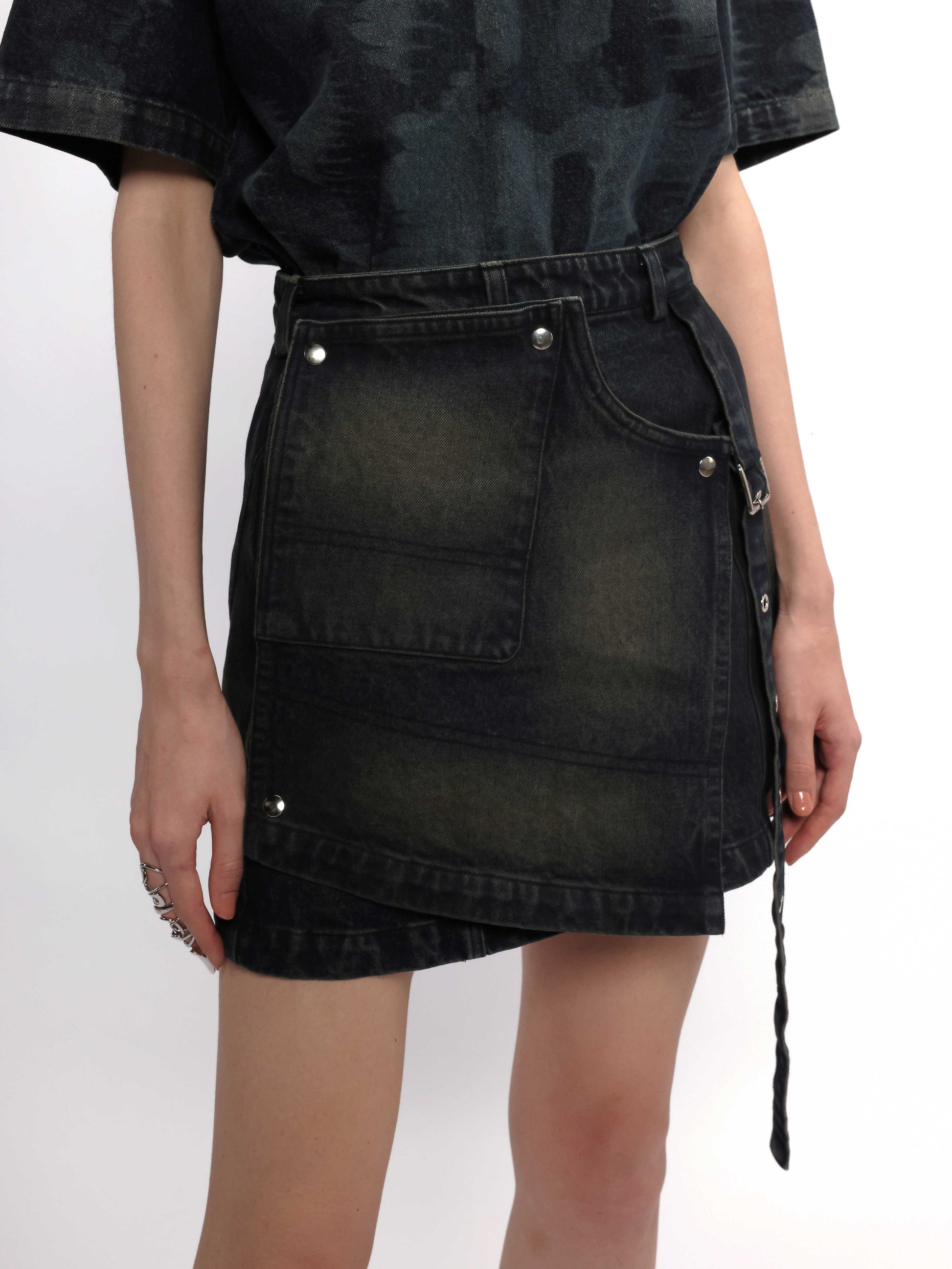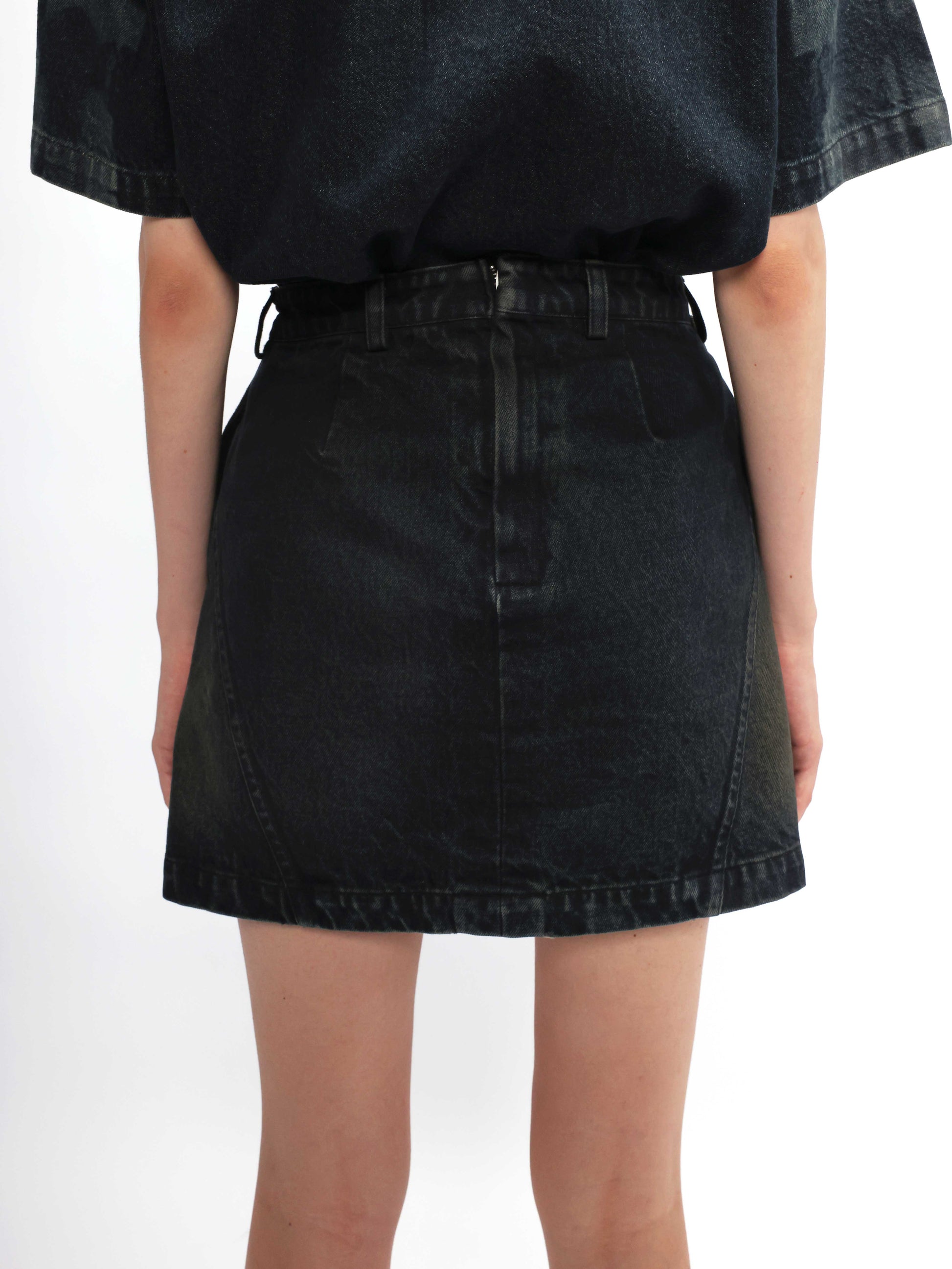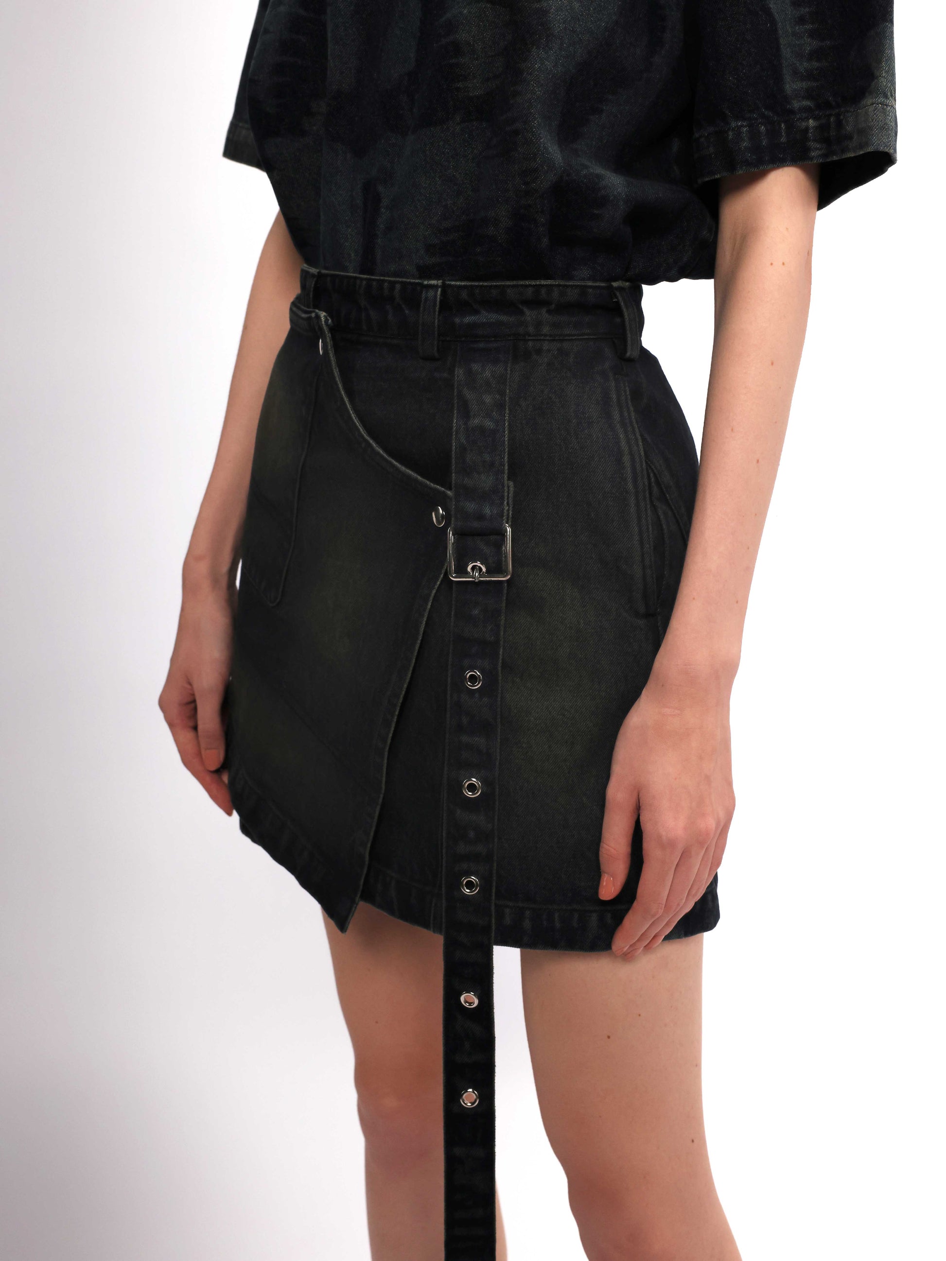Denim mini skirt in signature vintage wash, designed for versatile styling Wear it two ways: with the detachable asymmetrical top layer for a layered look or as a classic mini skirt. This mid-rise design features a princess seam from waist to hem with classic double stitching, a structured back panel for shape, and a removable belt detail. Finished with invisible side pockets and a front patch pocket for added utility, has concealed zip fastening.