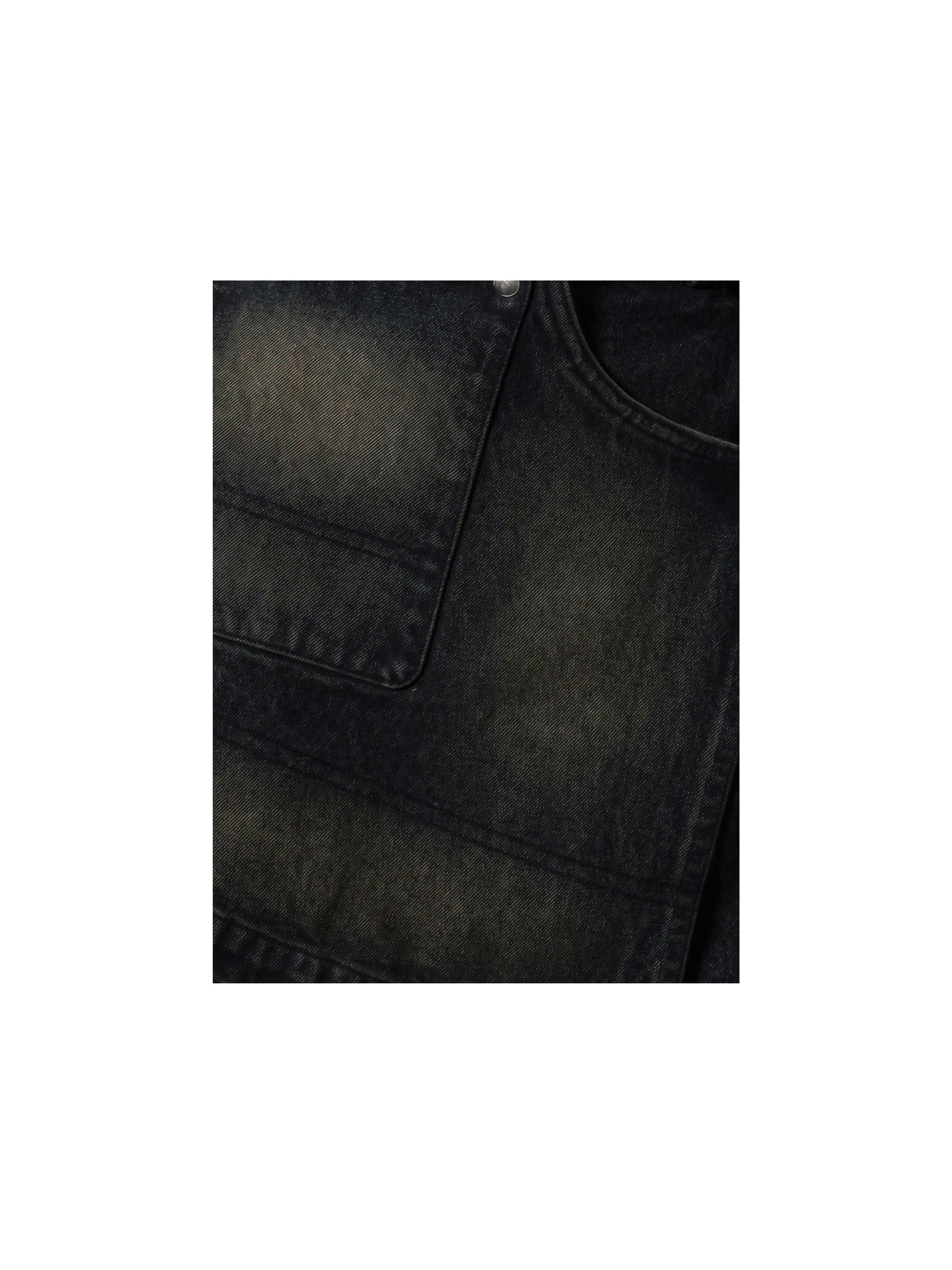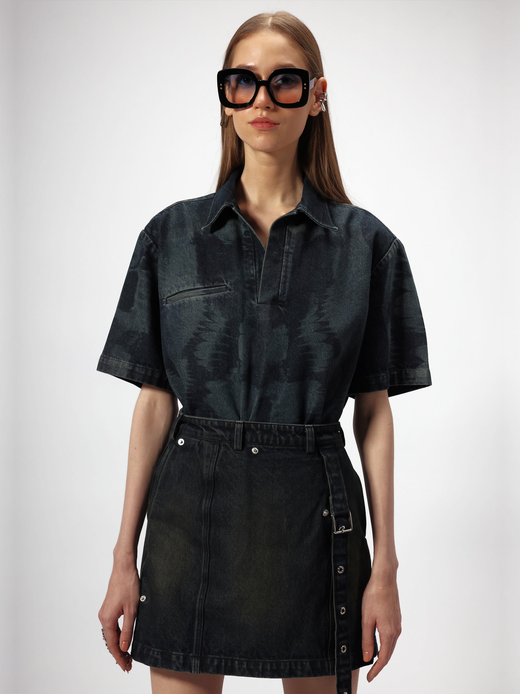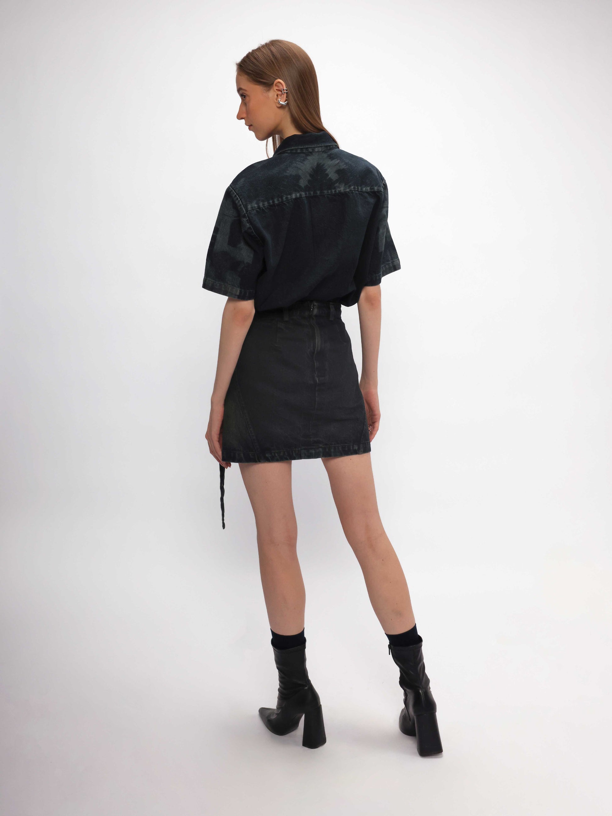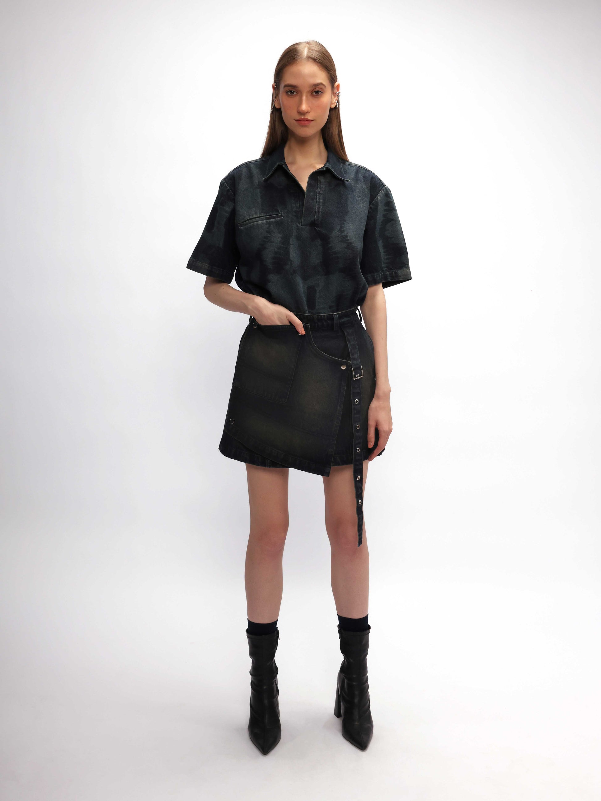 Denim mini skirt in signature vintage wash, designed for versatile styling Wear it two ways: with the detachable asymmetrical top layer for a layered look or as a classic mini skirt. This mid-rise design features a princess seam from waist to hem with classic double stitching, a structured back panel for shape, and a removable belt detail. Finished with invisible side pockets and a front patch pocket for added utility, has concealed zip fastening.
