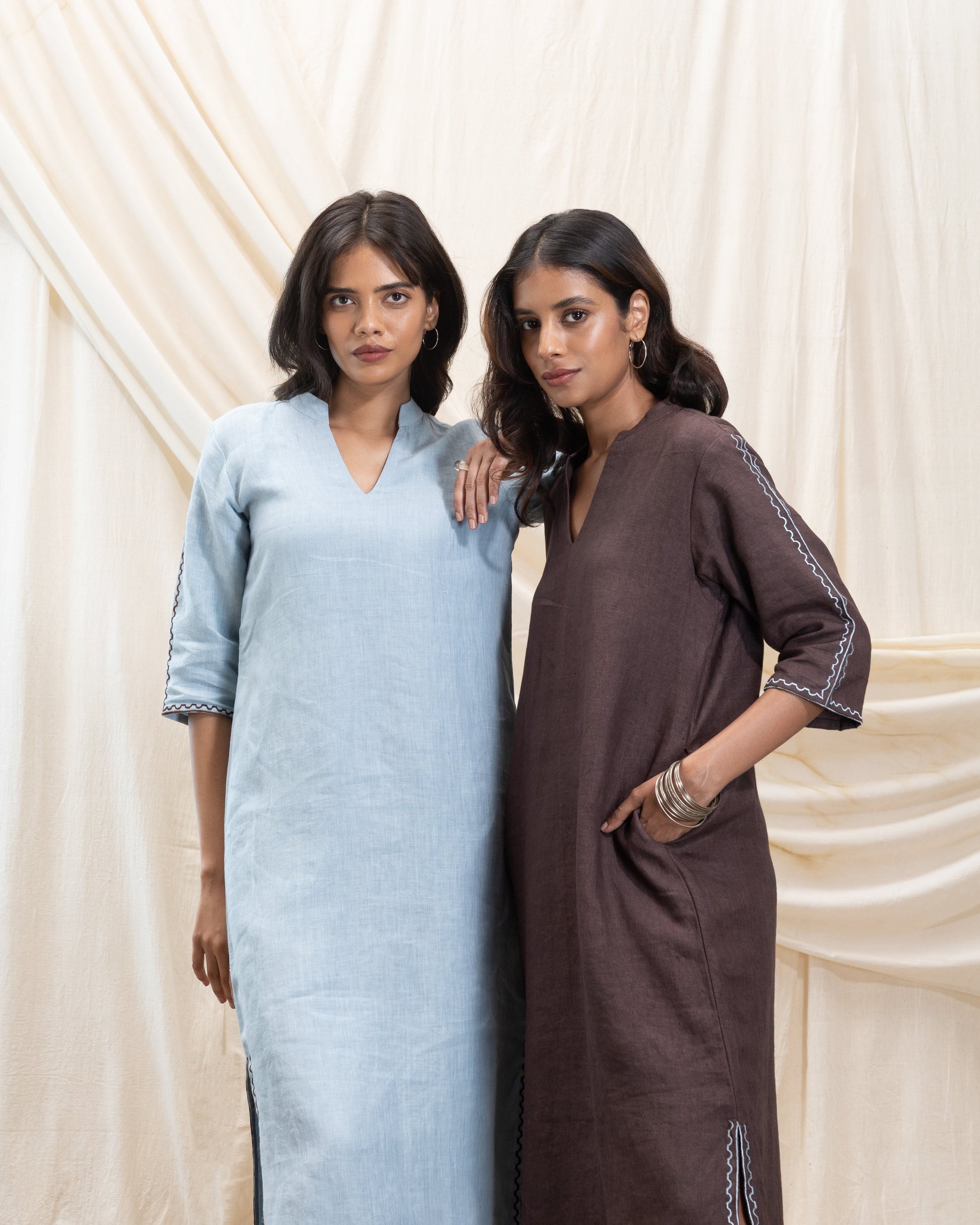 An effortlessly stylish full-length dress designed for comfort and ease. It features practical pockets on both sides and a bold thigh-high slit, beautifully highlighted with our signature line embroidery in a contrasting shade. The 3/4th sleeves, extending till the elbow, are also adorned with delicate line embroidery for a refined touch. A classic mandarin collar adds to its understated elegance, making this piece a perfect blend of simplicity and sophistication.