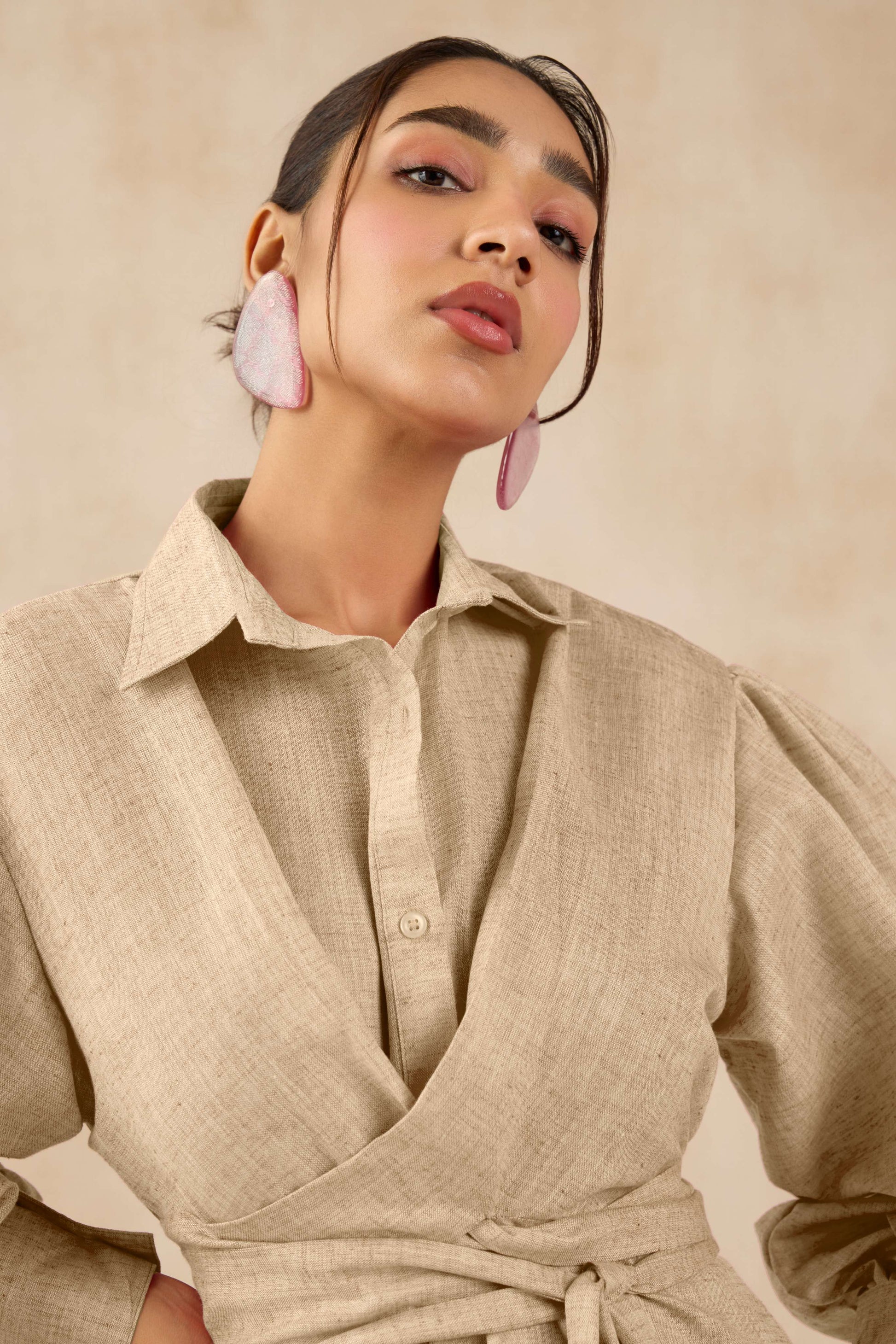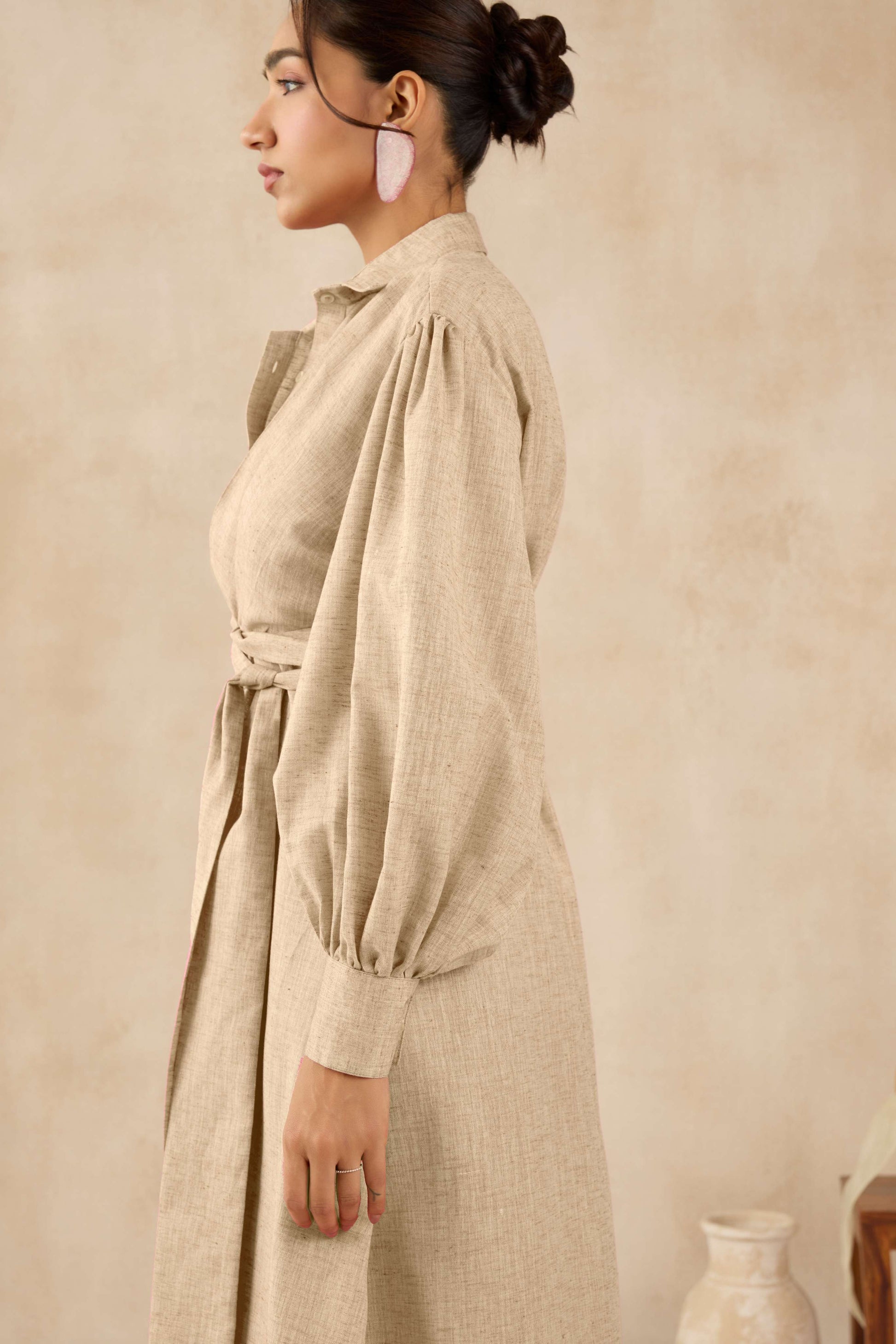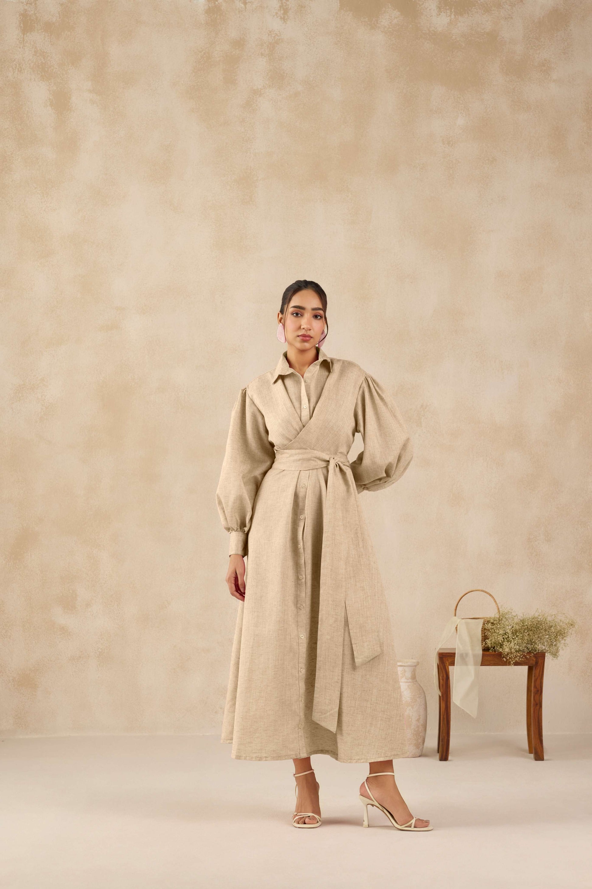 The Dubai Dress is a perfect balance of drama and grace. Designed in a soft Mocha Brown colour, it exudes a refreshing charm. The tailored shirt-style bodice flows into a breezy A-line silhouette, while the voluminous balloon sleeves add a touch of boldness. A wrap-style belt cinches the waist for a flattering fit, making it ideal for both day and evening wear.