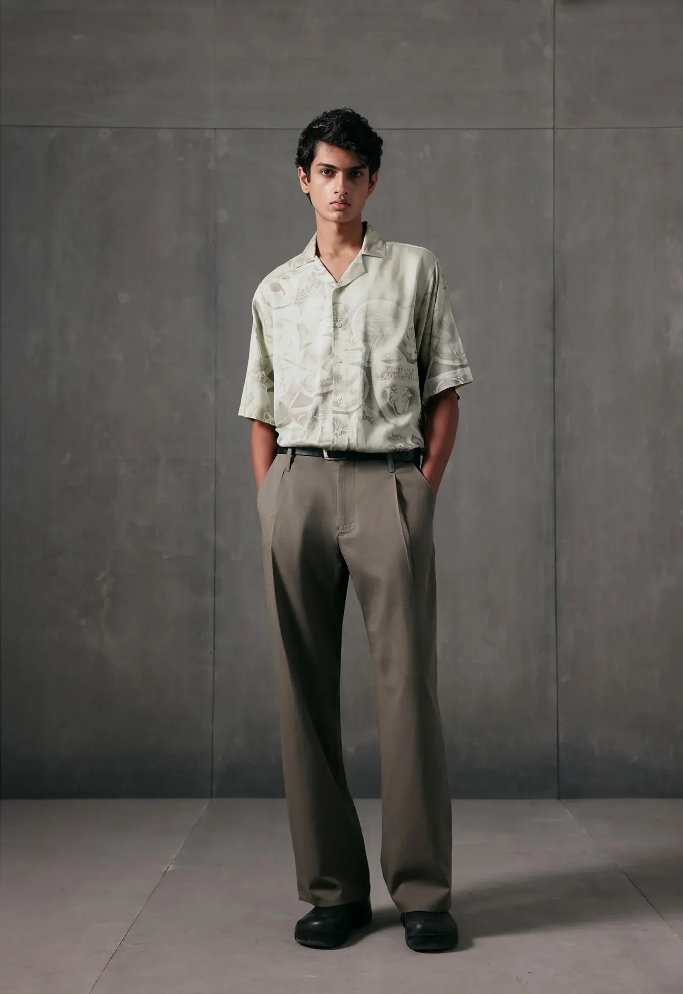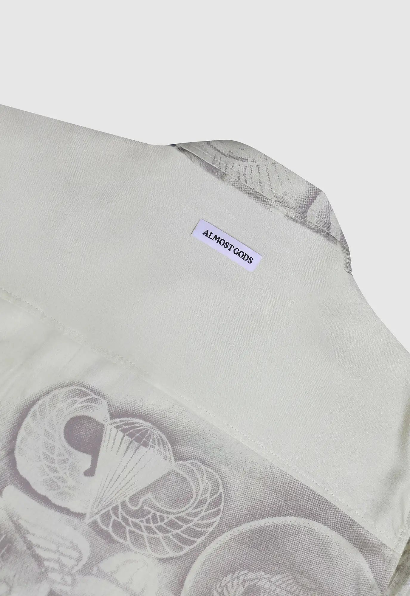 Relaxed-fit cuban collar shirt featuring a fading tapestry of Vietnam War-era badges, rendered in a fading spray-paint effect.