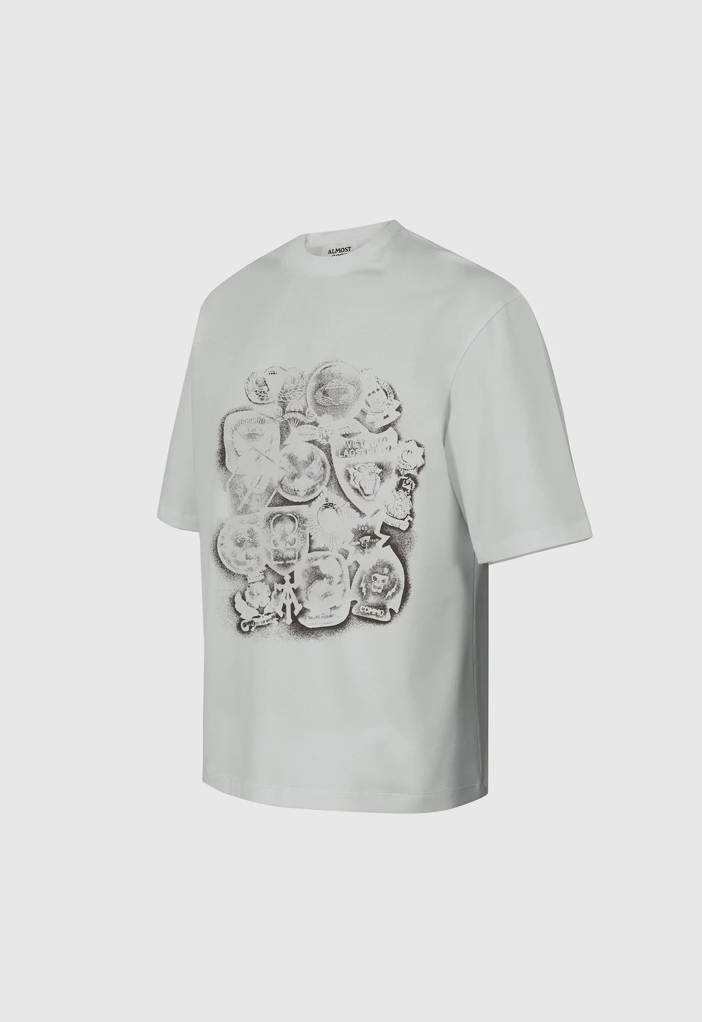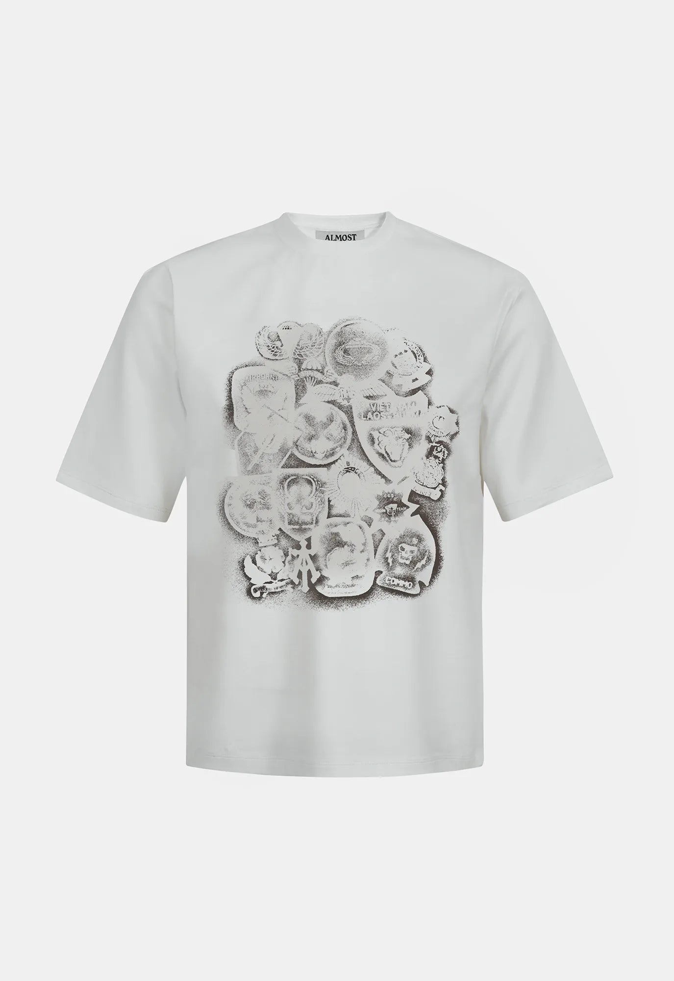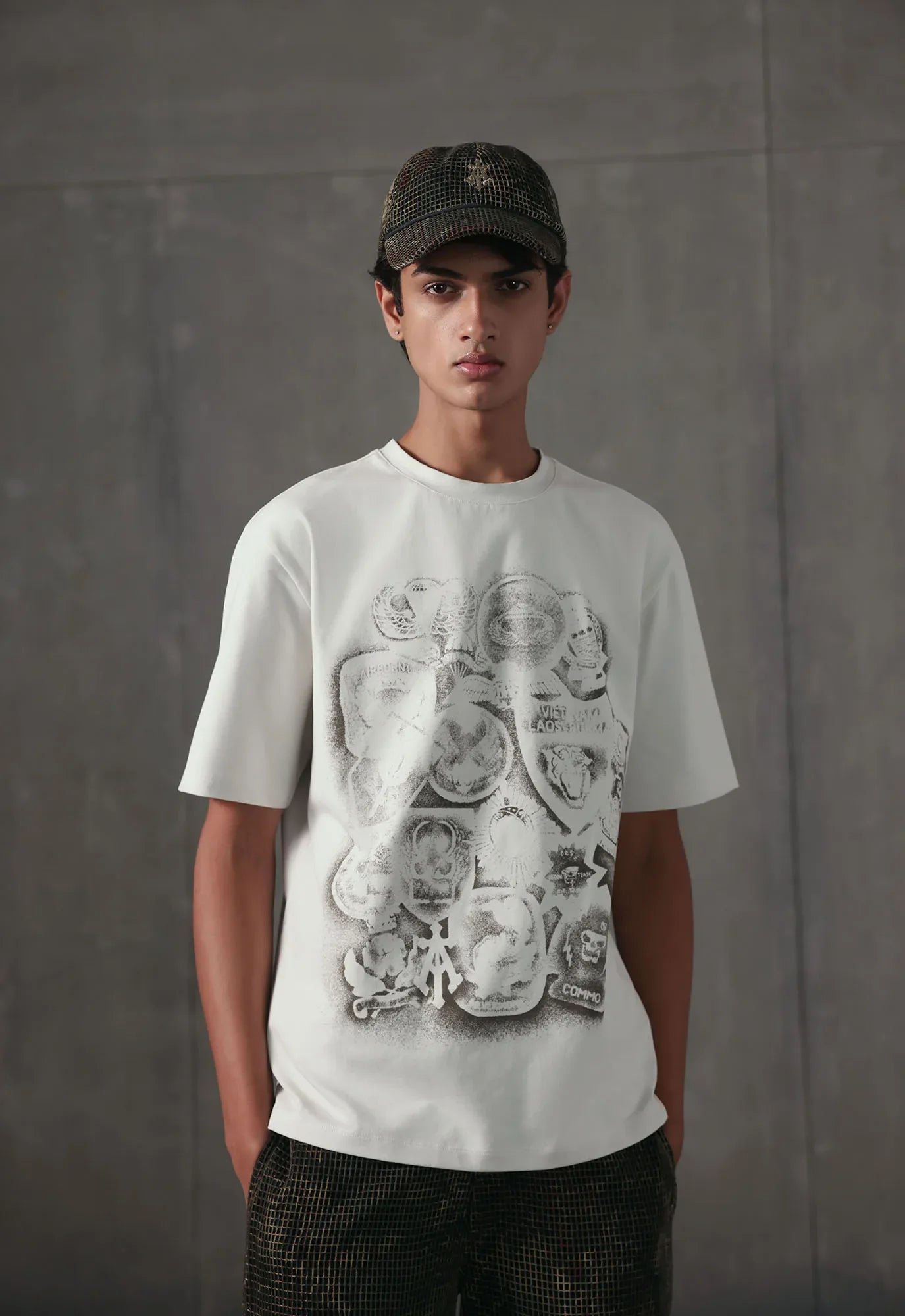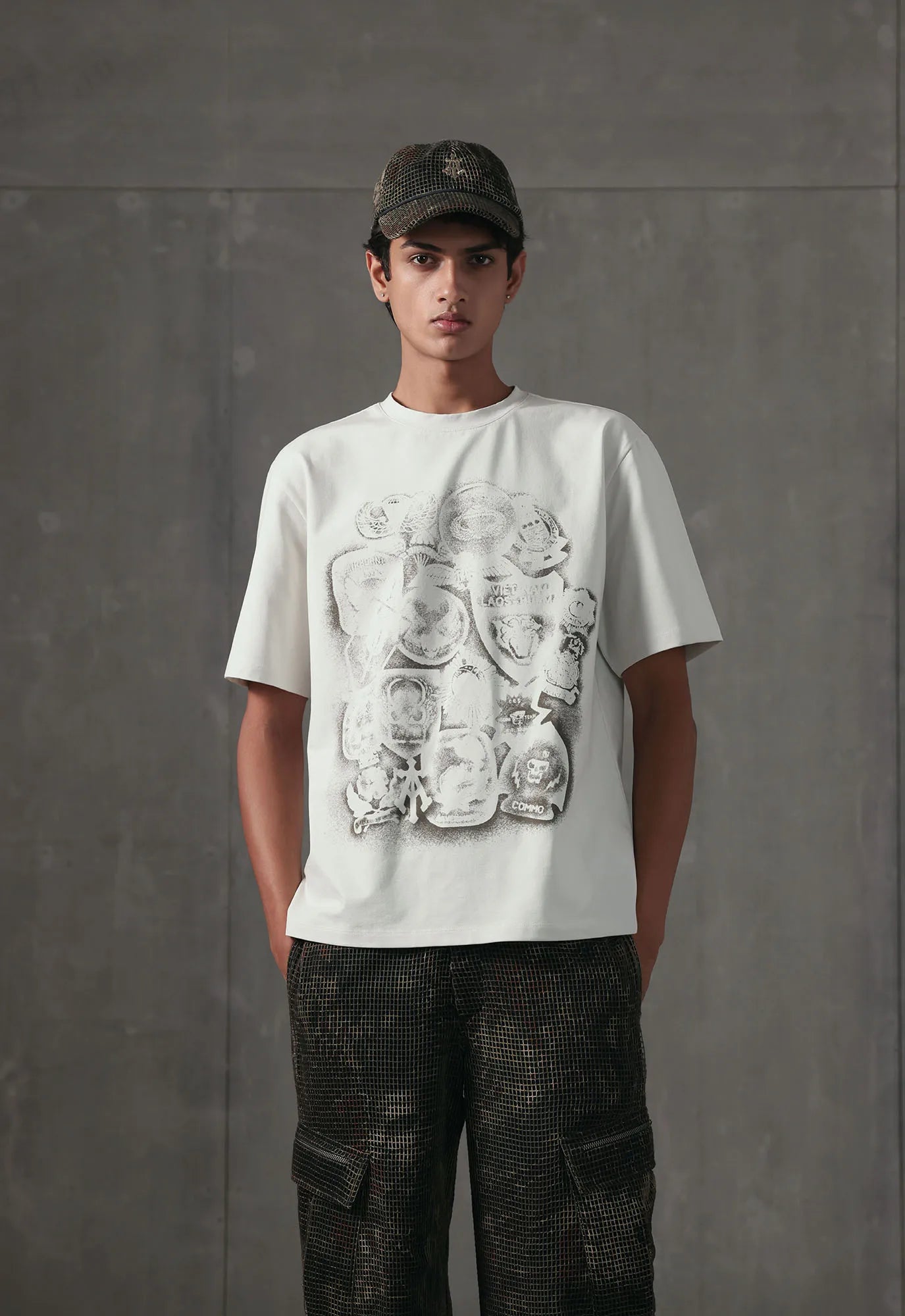 Relaxed-fit tee featuring a fading tapestry of Vietnam War-era badges, rendered in a fading spray-paint effect.