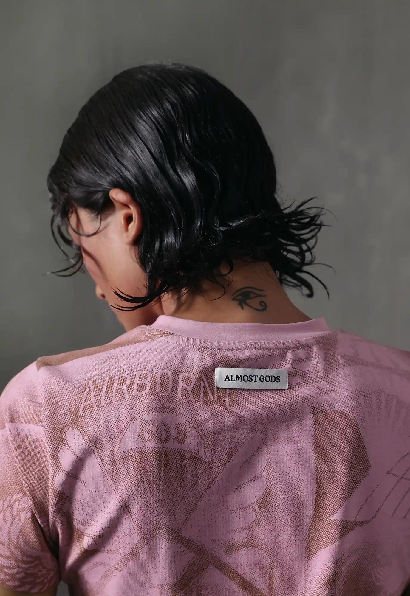 Relaxed-fit tee featuring a fading tapestry of Vietnam War-era badges, rendered in a fading spray-paint effect.