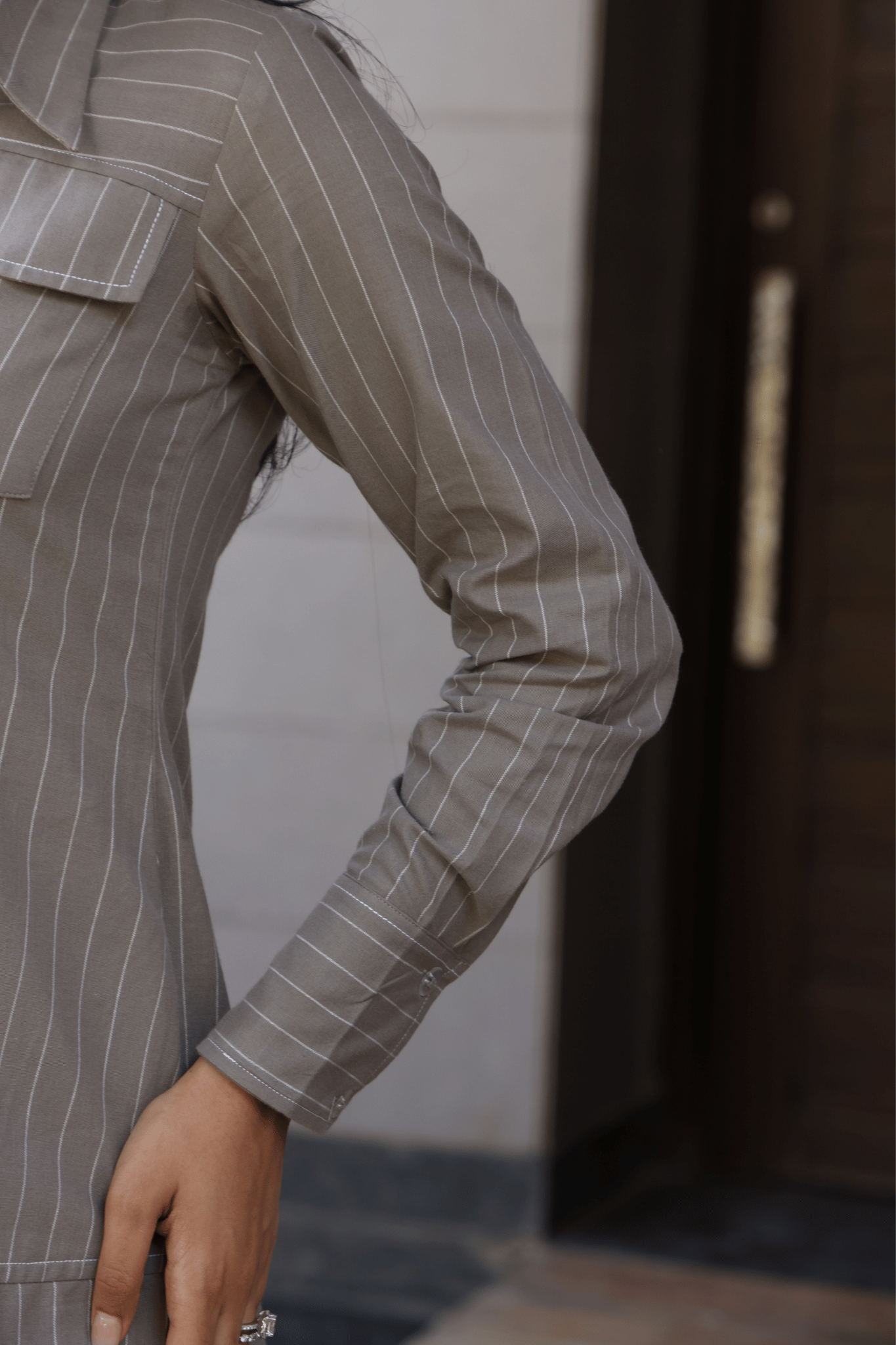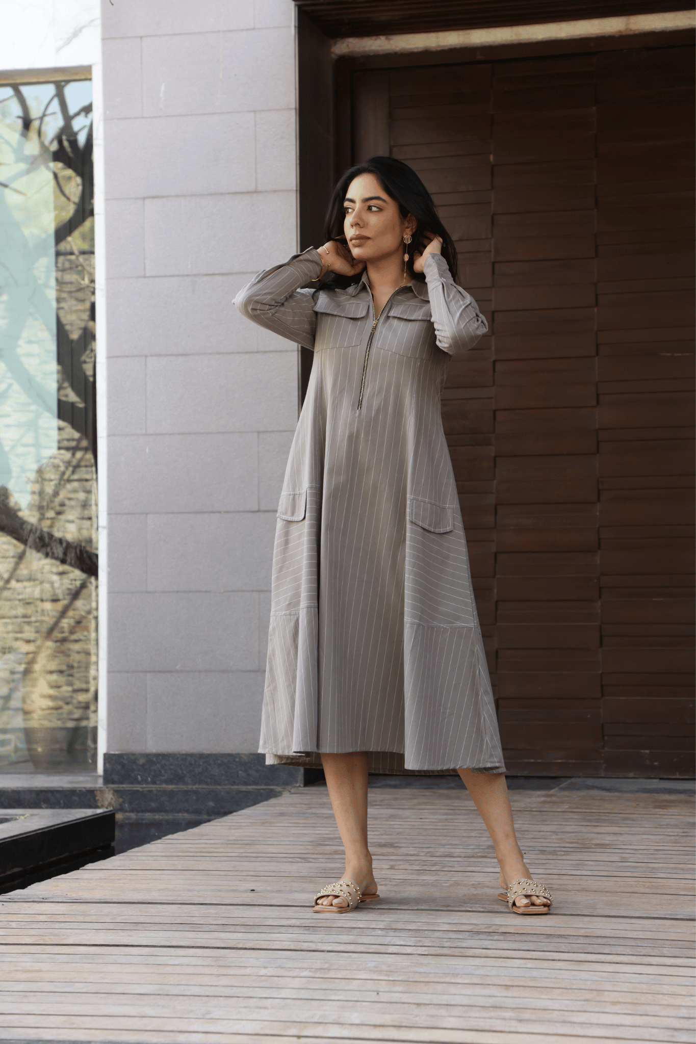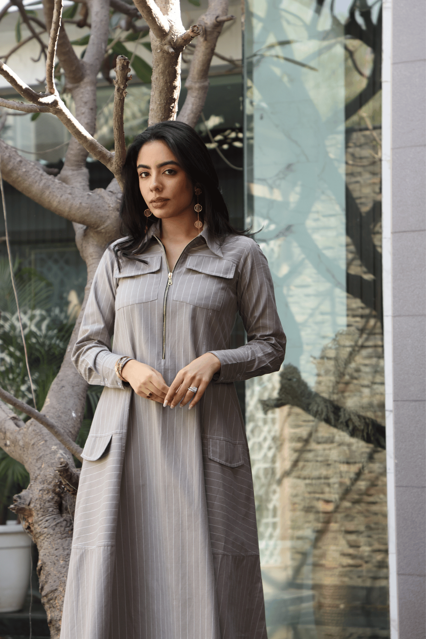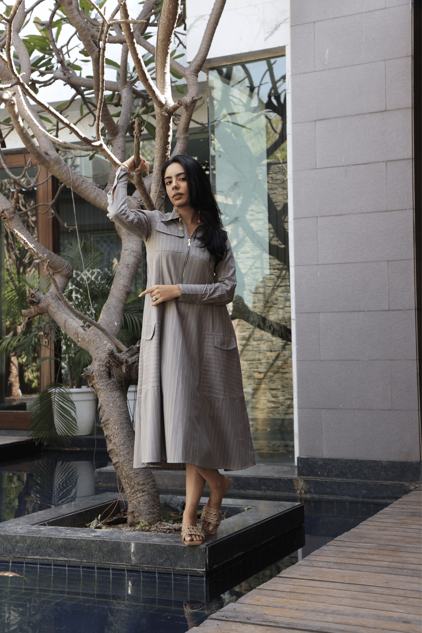 Designed with neutral tones and a tailored collar, Angan offers a polished finish, while the zip front and handy pockets introduce a laid-back, utilitarian twist. The relaxed A-line silhouette flows beautifully, making it perfect for everything from casual lunches to city strolls.