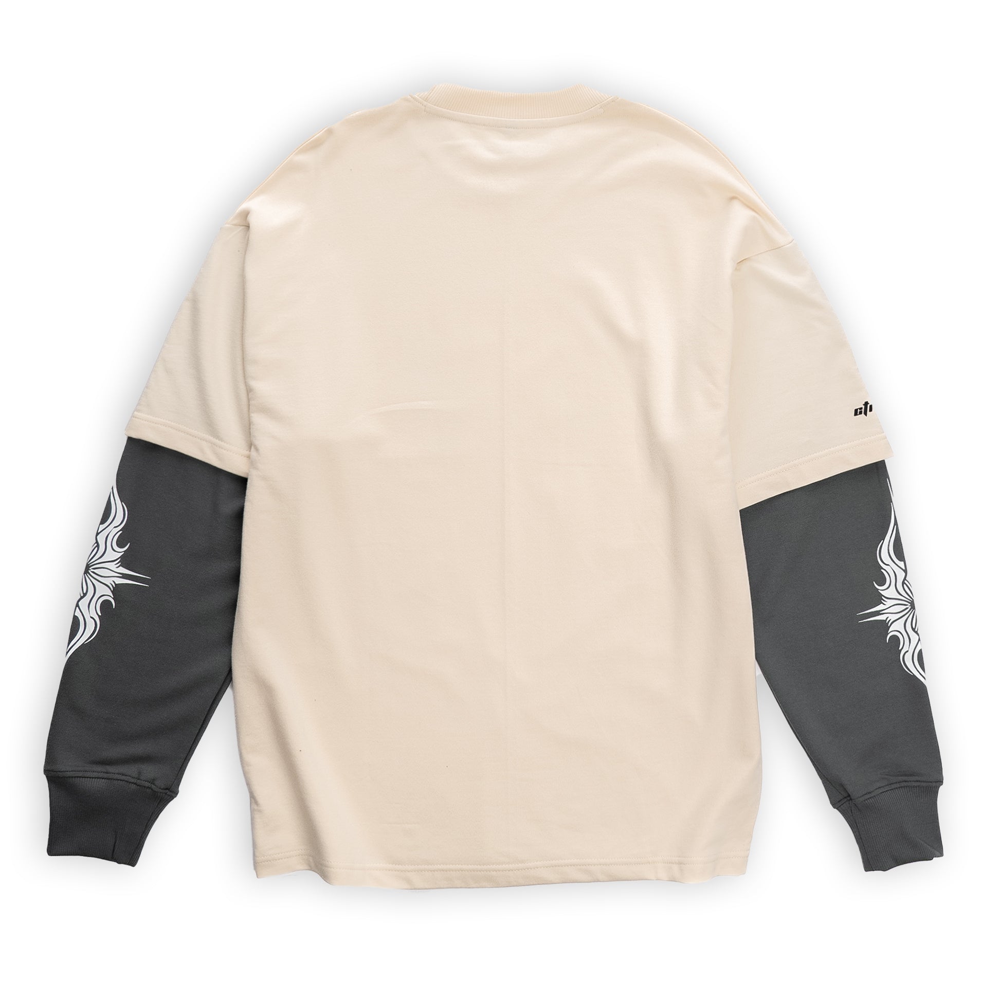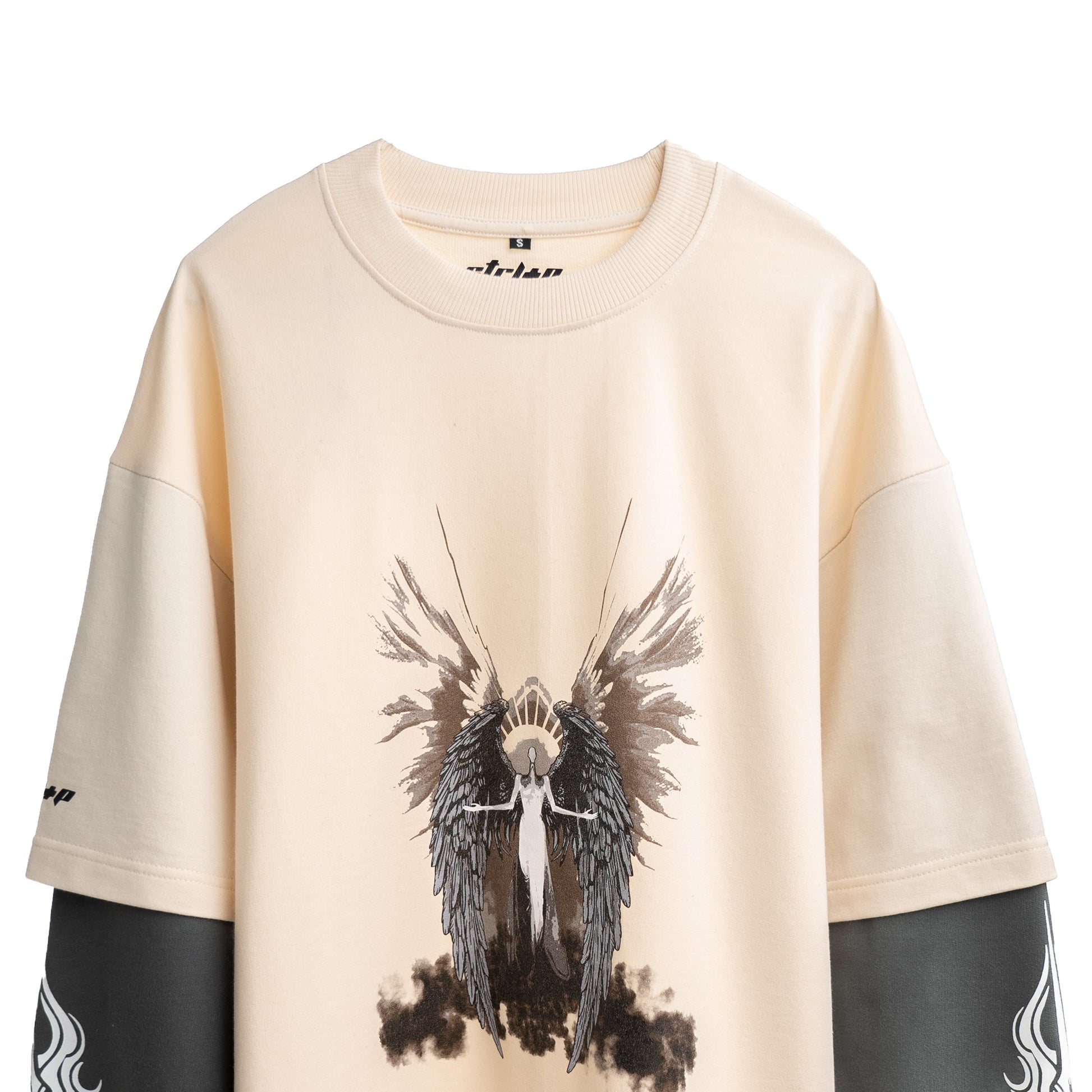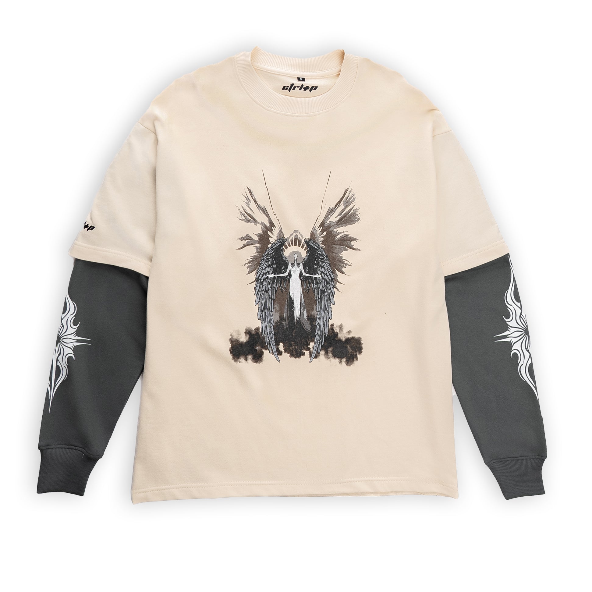 The front showcases a bold digital print featuring a winged angel graphic which represents rising above everything, blending art and fashion seamlessly. The layered long-sleeve look, complete with printed patterns on the sleeves, adds an edgy aesthetic perfect for any streetwear enthusiast.