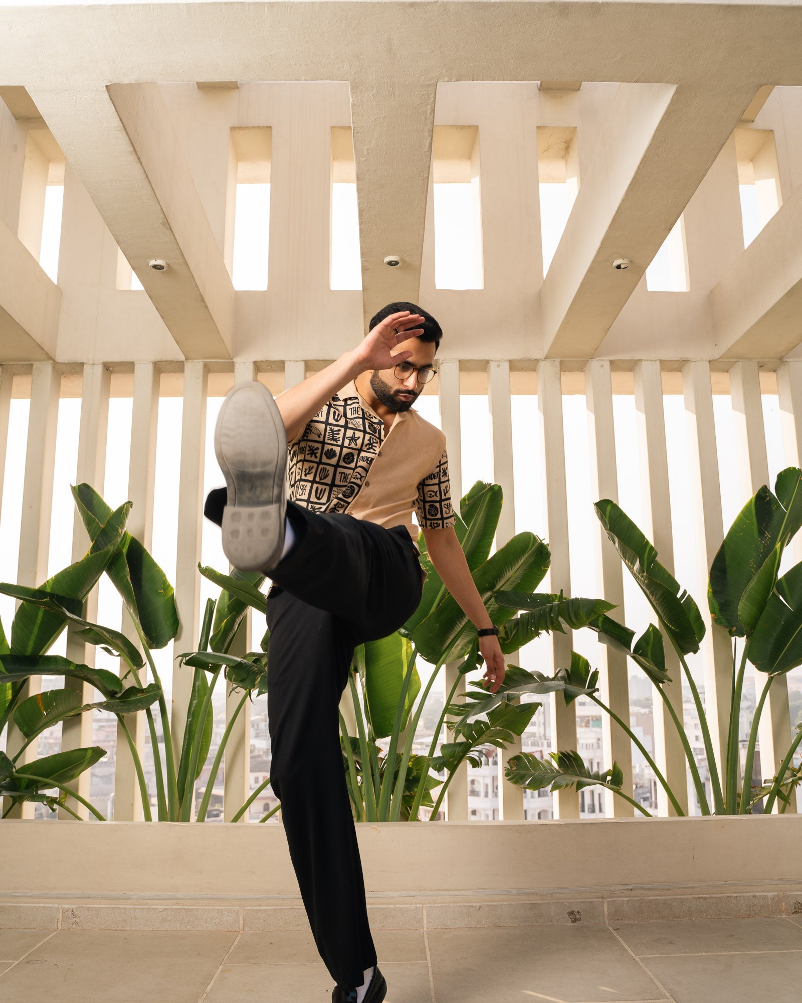 Relaxed fit linen shirt in a Black colorway with geometric prints, perfect for casual outings, beach days, or a relaxed office look.