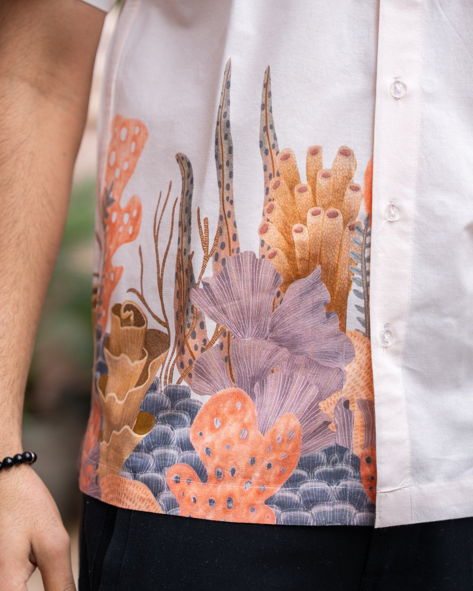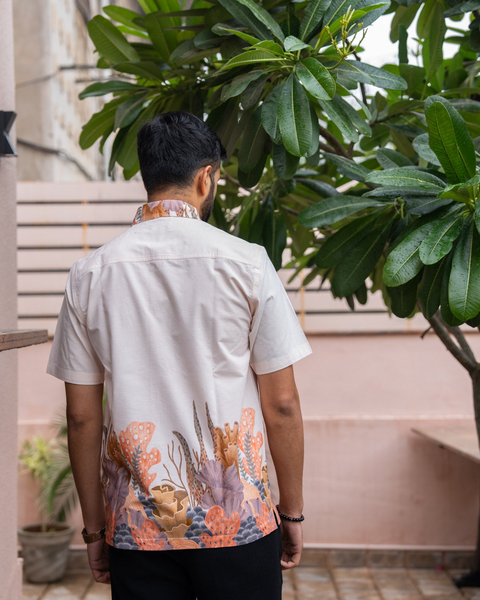 Elegant black linen shirt with floral hem design, ideal for evening gatherings or resort vacations. Style with beige trousers or white linen shorts. Black buttons complement the classy aesthetic.