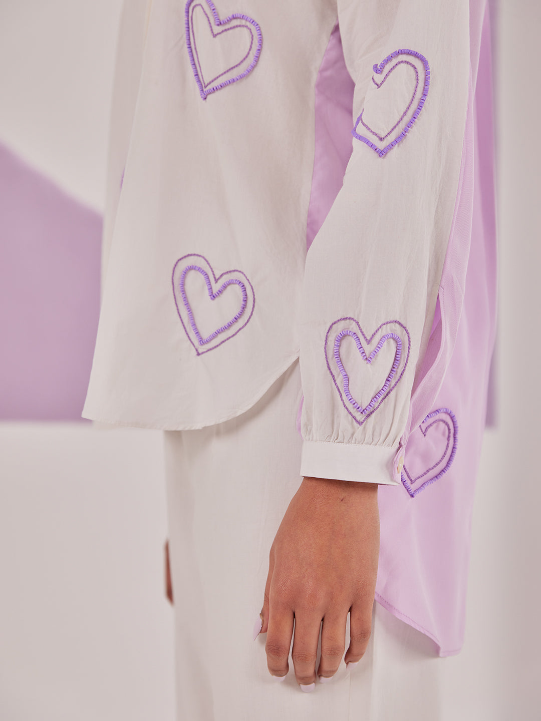 Sport a chic oversized shirt with a half-and-half color block, featuring a unique box pleat at back and delicate hand beaded heart accents, paired with a statement high waist straight pants, featuring a chic color block design.