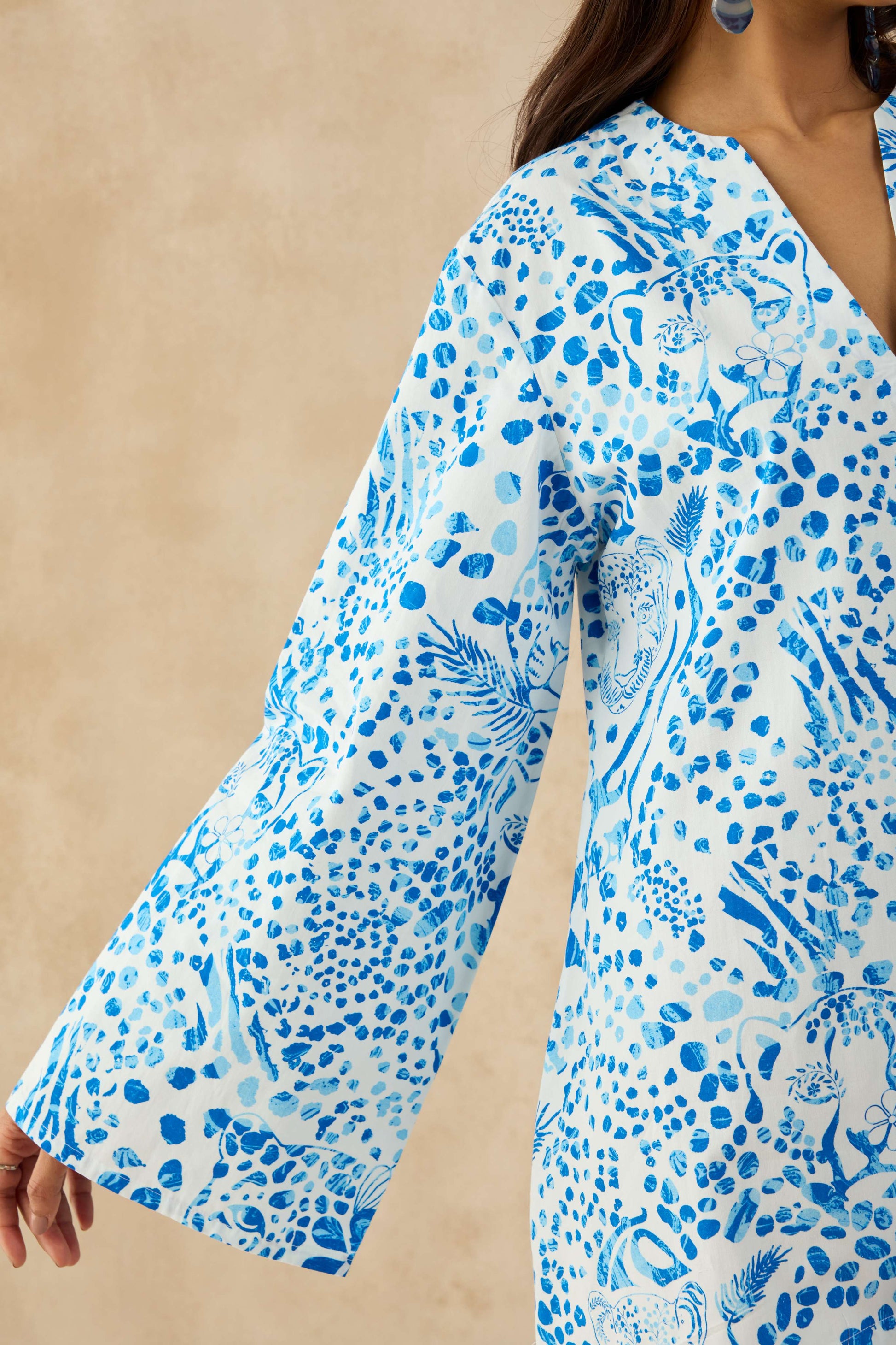 A striking balance of boldness and ease, the Mykonos Dress is a must-have for the modern wardrobe. Its intricate panther print, rendered in a refreshing blue-and-white palette, gives it a distinctive edge, while the sharp V-cut neckline brings a refined touch. Voluminous flared sleeves create striking movement, enhancing the fluid silhouette.