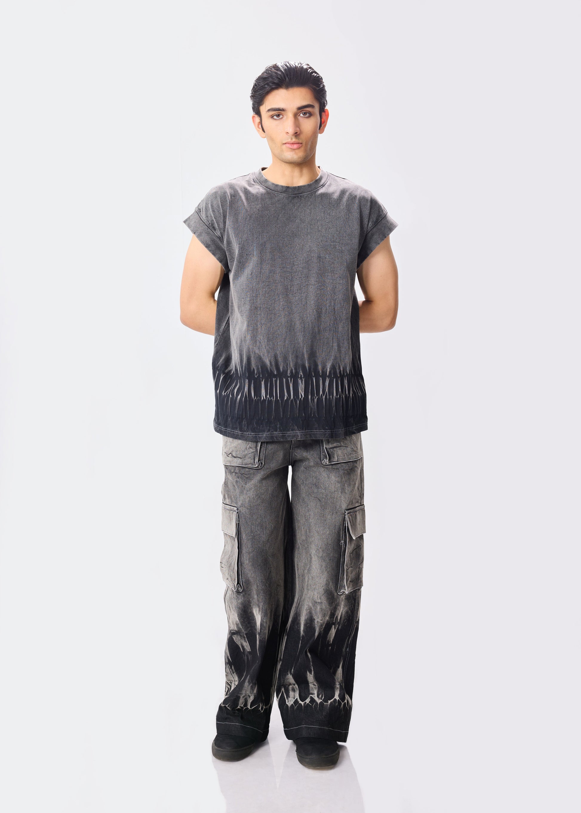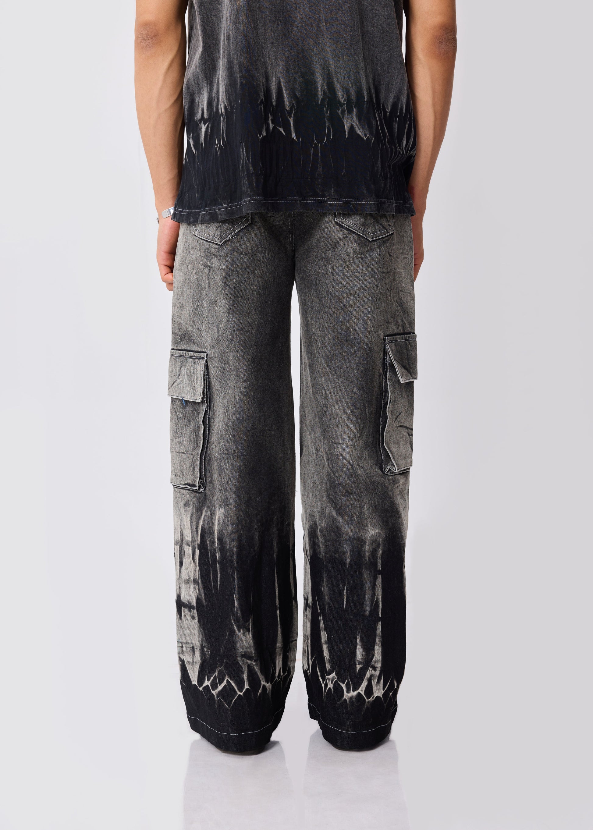 Wide leg cargo pants made in heavy weight 12oz denim fabric, featuring multiple front and back pockets, along with side box pockets.