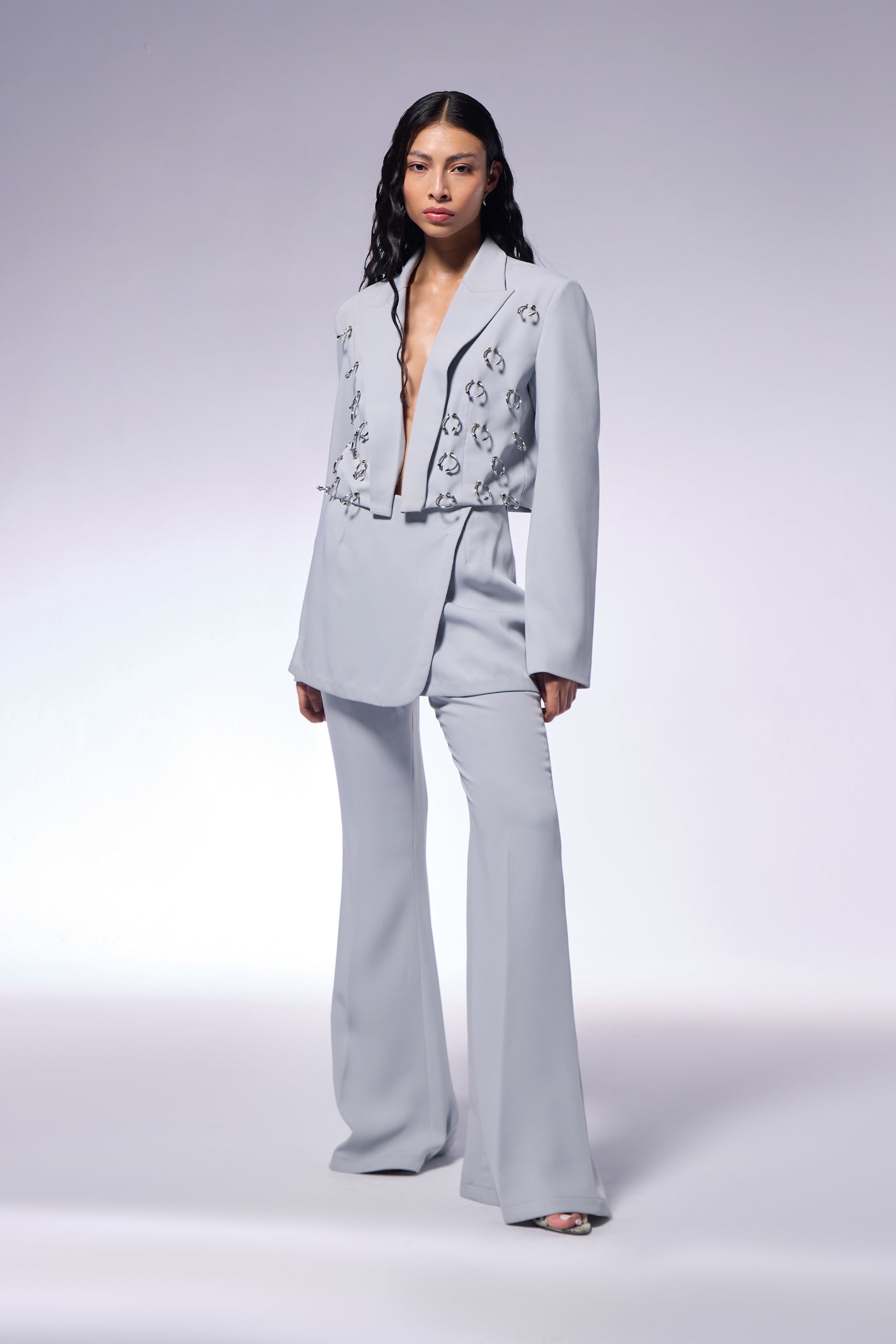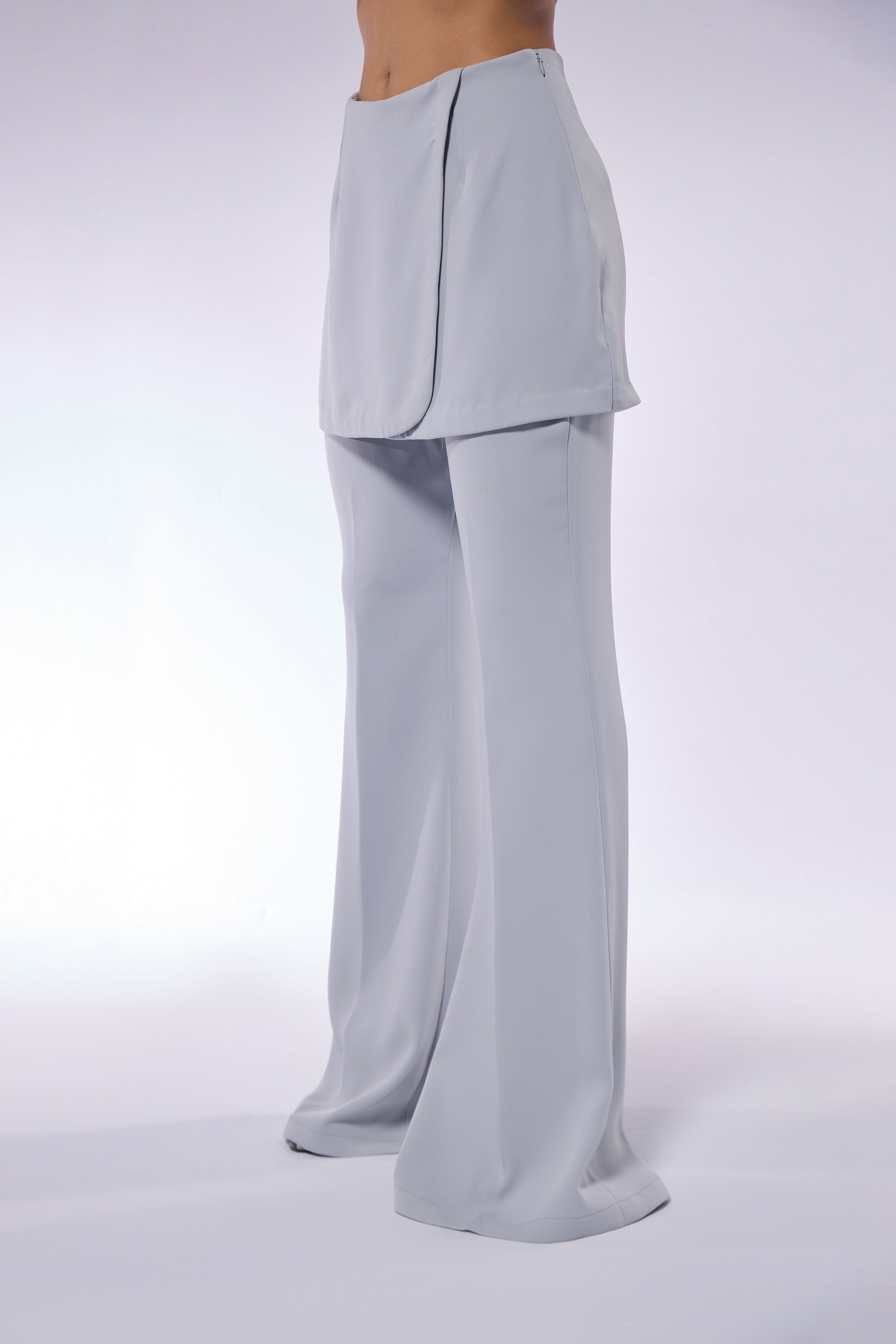 A pair of light grey skouser-style wide-legged pants, offering a sleek and contemporary silhouette.