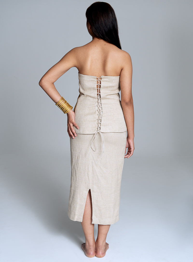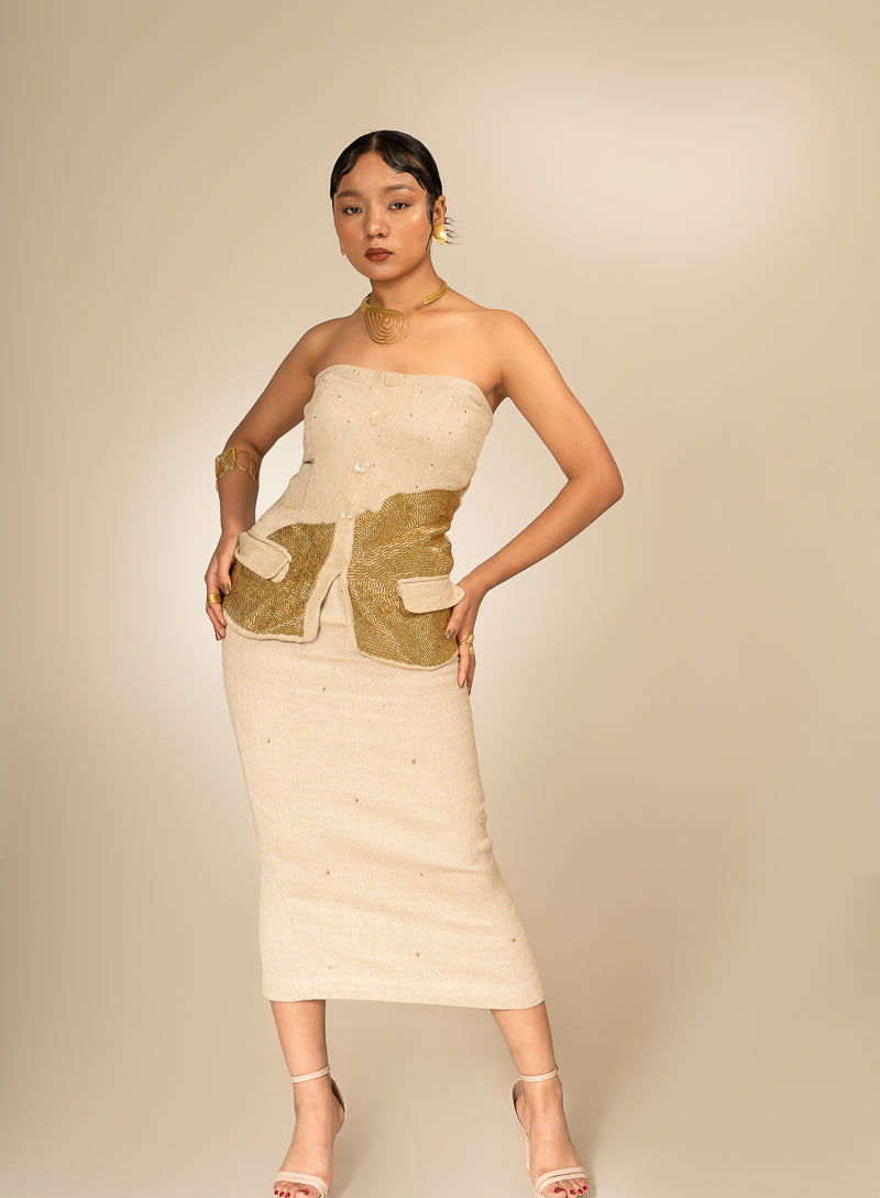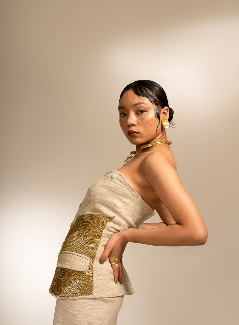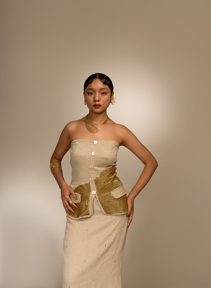 Reflecting the celestial beauty & its mesmerizing formations, this piece encapsulates the mystique of the cosmos. The designer envisions to having a touch of celestial elegance to any attire through this vest. Elevated with golden embellishments this structured vest is set to redefine the agenda of new-age power dressing, giving an unapologetically powerful vibe. Slanted flap pockets is the front & angular hem line lend shaping to the figure. Multiple hooks & eyes closures at the back ensures you get the perfect fit, every time. Style with our matching ORB skirt for a complete desk-to-dinner look!