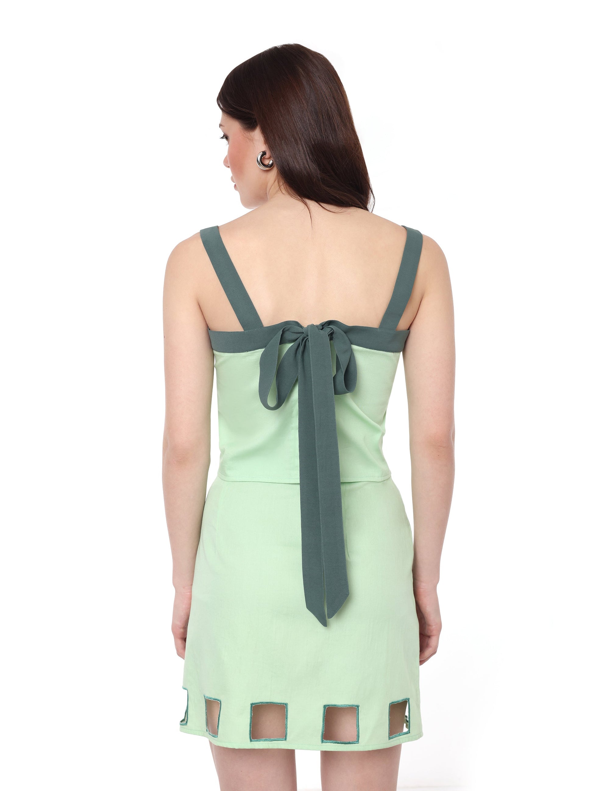 Flaunt your style with our sleeveless crop top, with a square neck, contrast straps, and a chic tie-up detail at the back, and our high waist straight mini skirt, with square cut-outs highlighted by accent stitching.