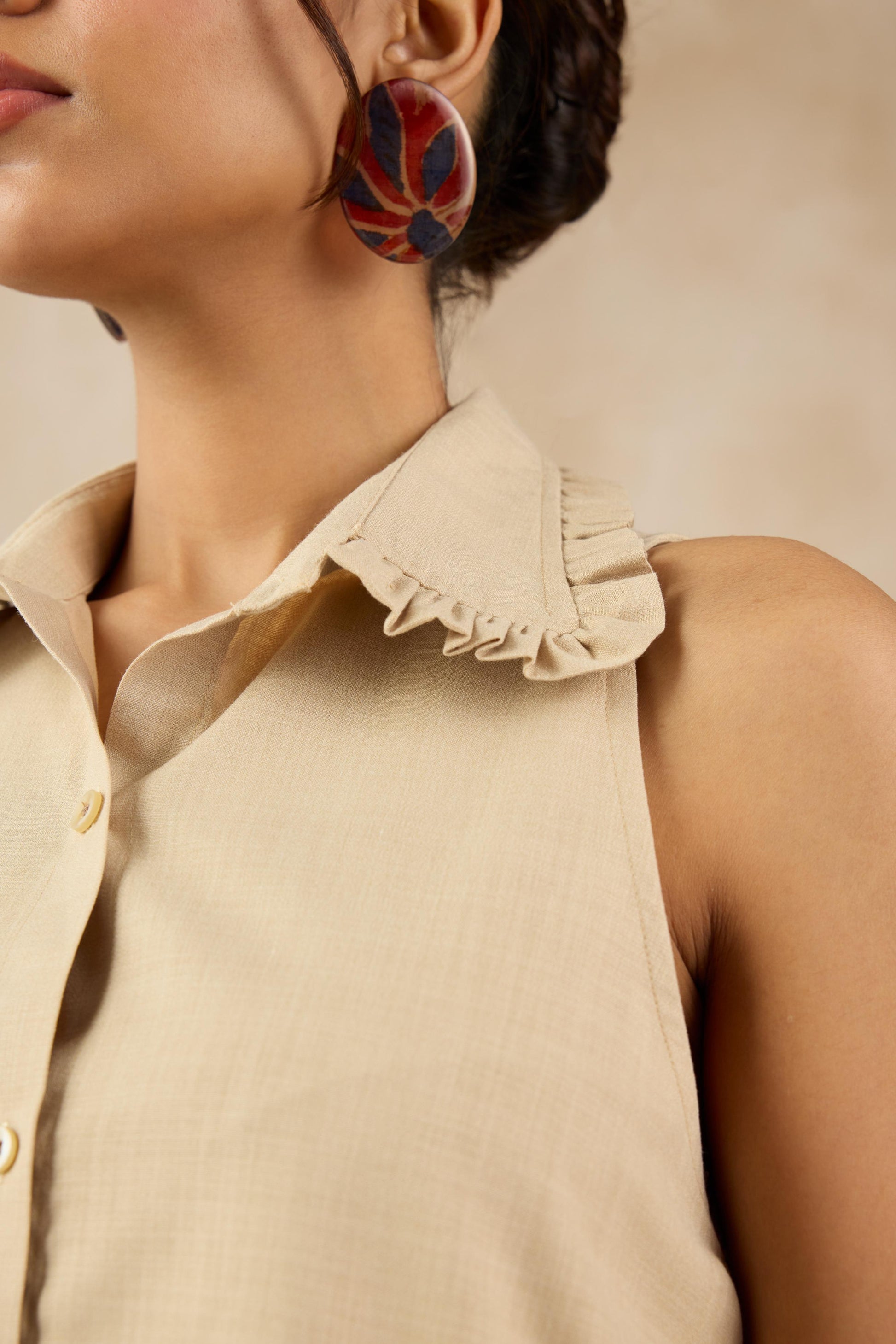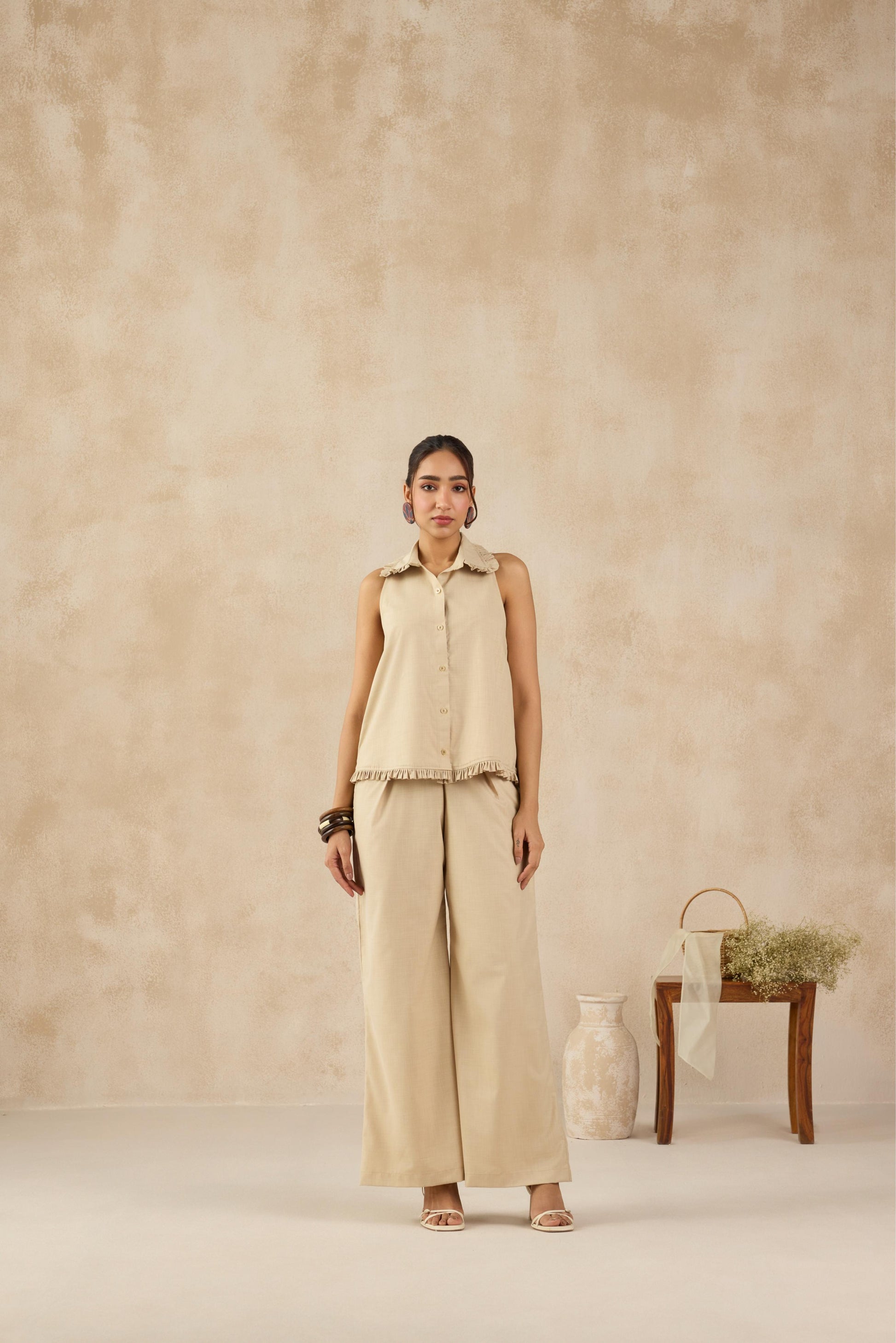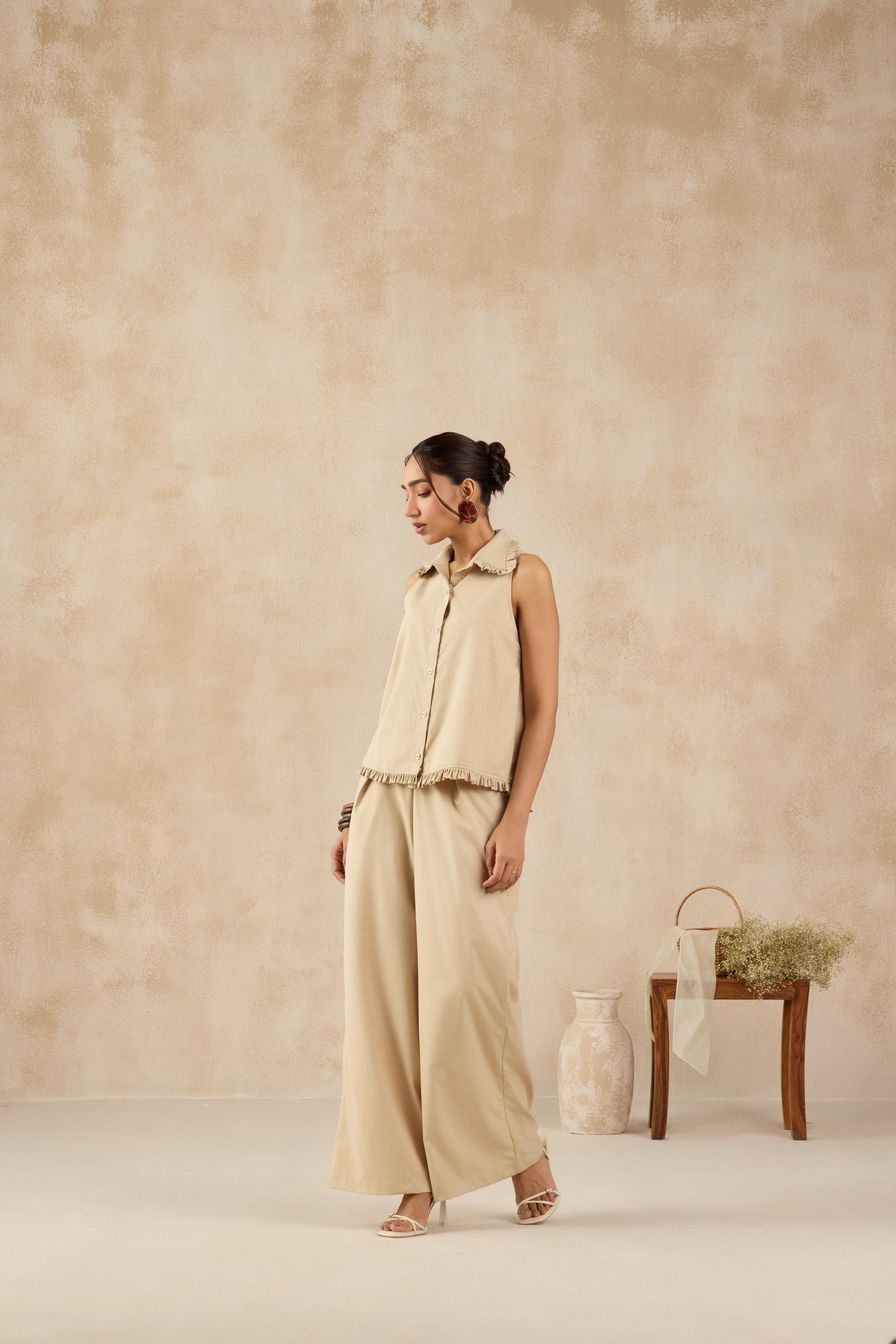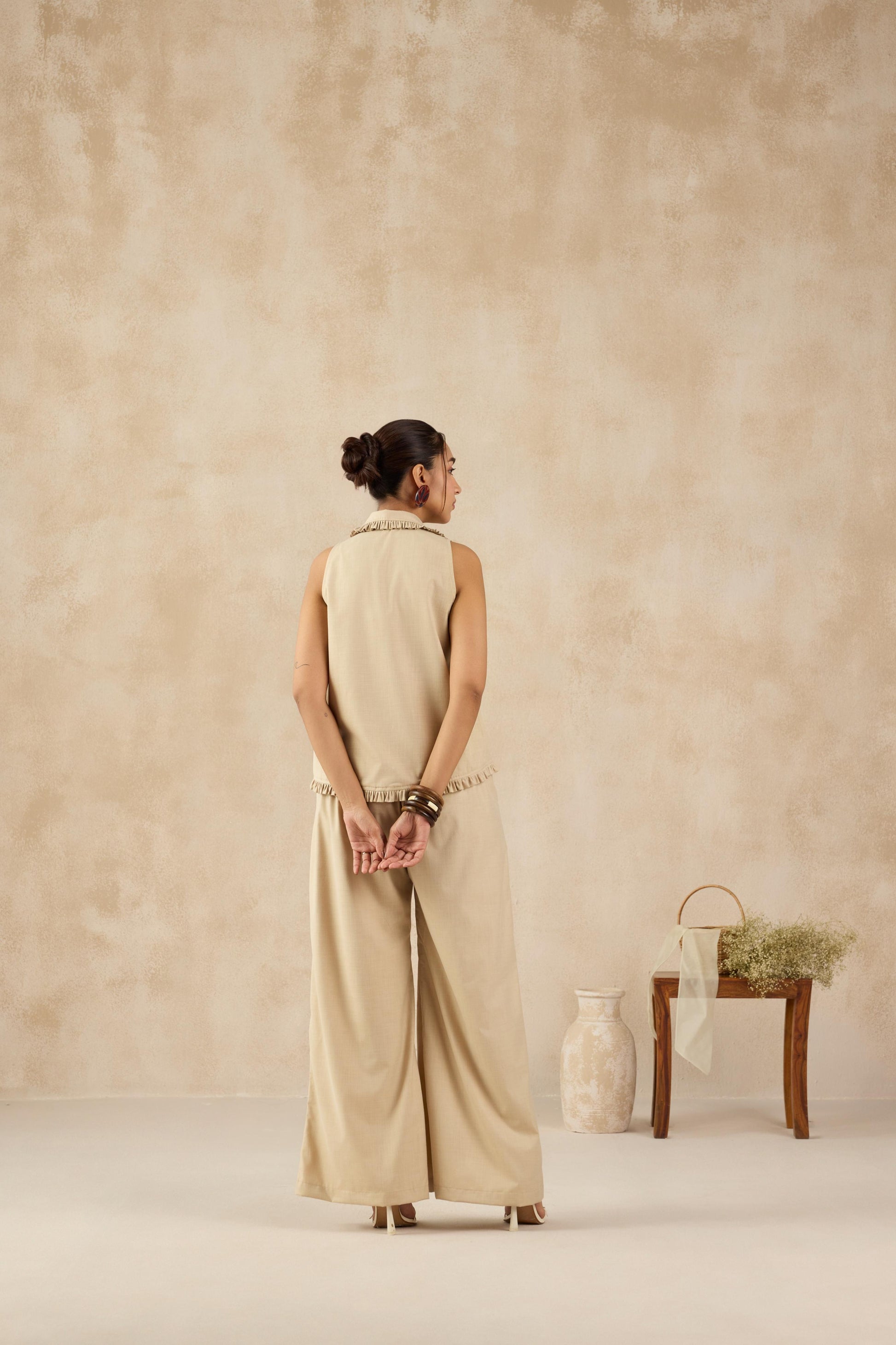 The Sydney Co-ord is the ultimate mix of modern elegance and playful flair. Designed in a rich mocha brown, this co-ord features a chic crop top with delicate frill detailing on the collar and hem, paired with oversized wide-leg pants for a relaxed yet statement look. The muted neutral tone makes it a versatile pick, perfect for both day and night styling.