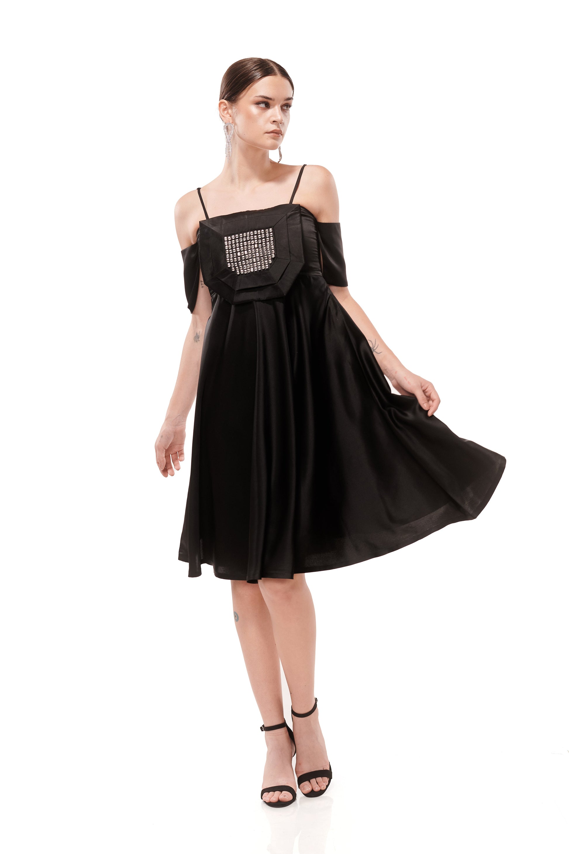 A square neckline, fit and flare dress with a tailor made front, hand embellished with silver jewel stones.