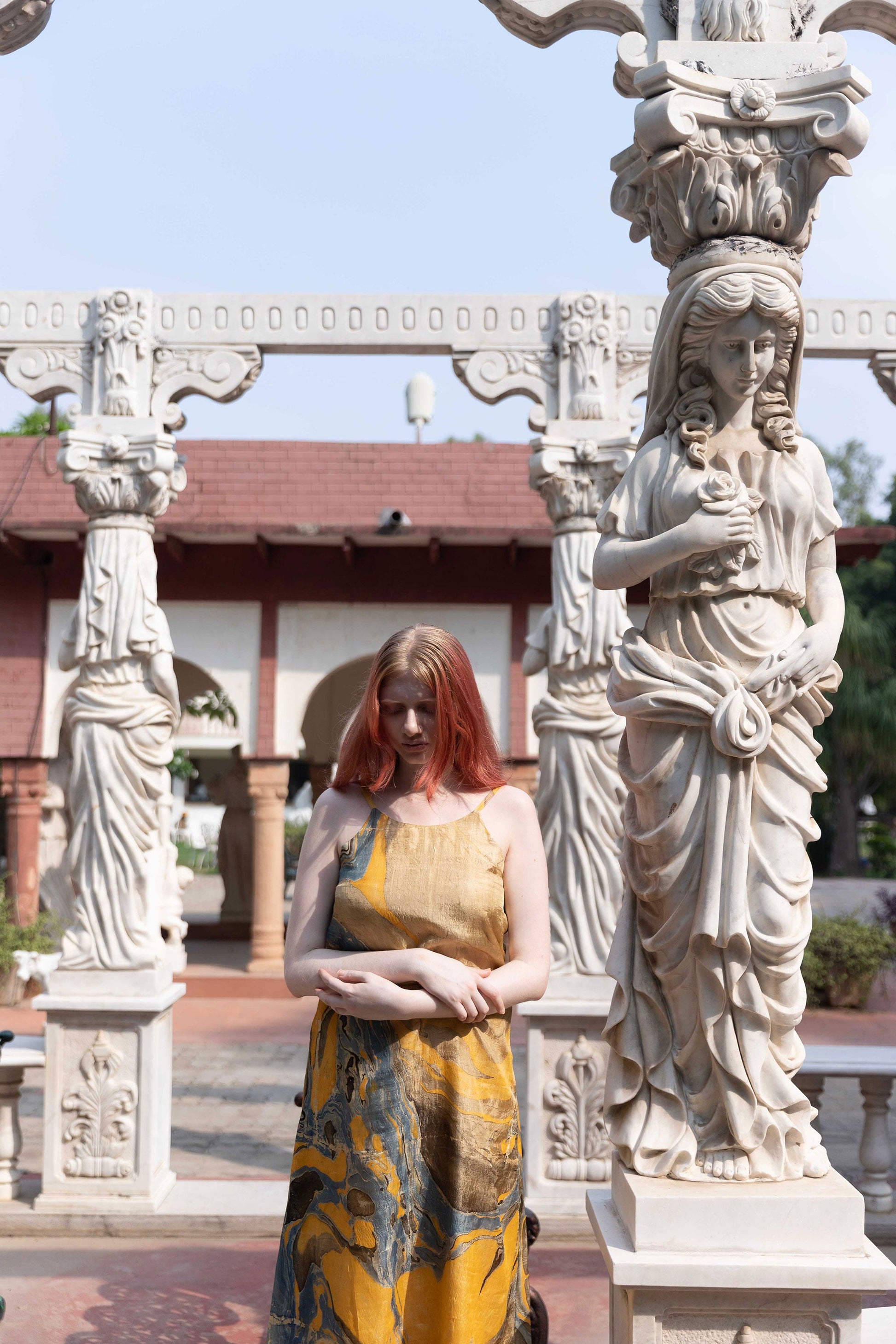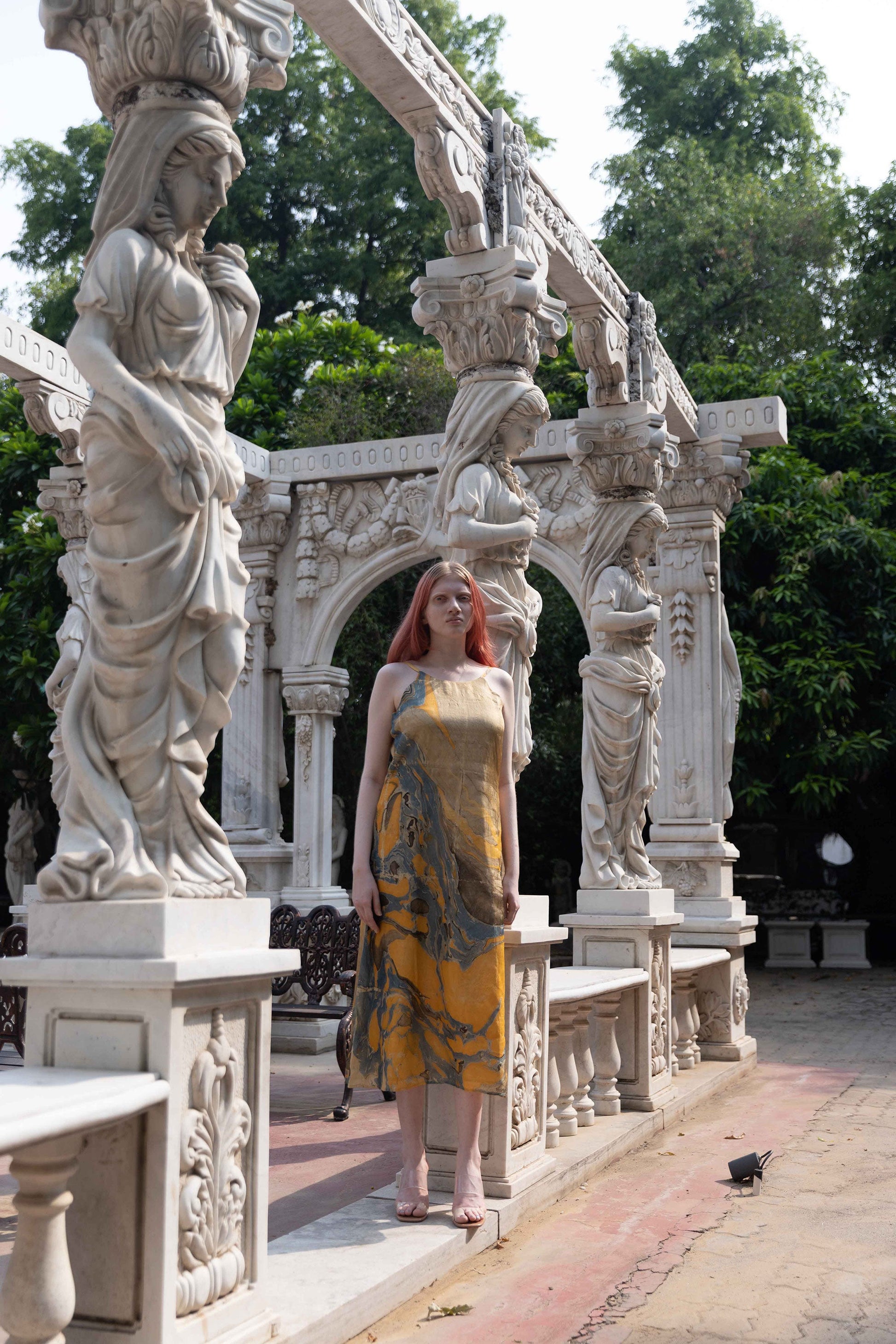 This yellow, sea blue and black marbled slip on dress is handpainted with mineral pigments on recycled banana stem yarn from Madhya Pradesh. The fabric has a subtle lusture making it a vegan alternative to silk. The pigment combinations are poured in a local fresh water pond and the fabrics are dip dyed in it to get the marbled prints. Each fabric is a one-of-a-kind design each and even though the color schemes repeat, two fabrics cannot be same ever. This slip on dress is A-lined with adjustable straps, and closes on the back with a zipper. Hand Wash/Dry Clean recommended.