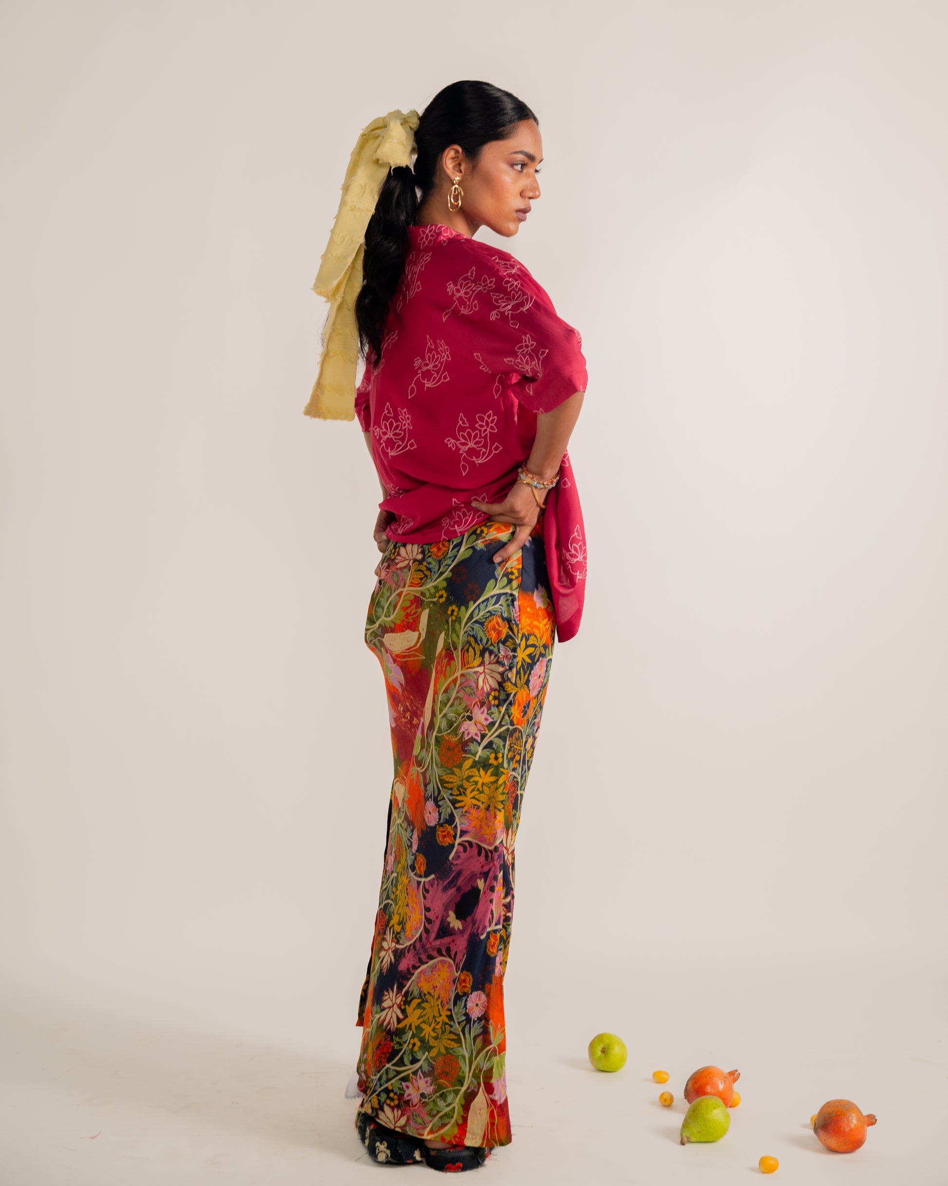 Long mermaid cut skirt with side slit, exudes a vibrant charm and artistic allure. Embrace the beautiful flow of the fabric, making each step a graceful dance.