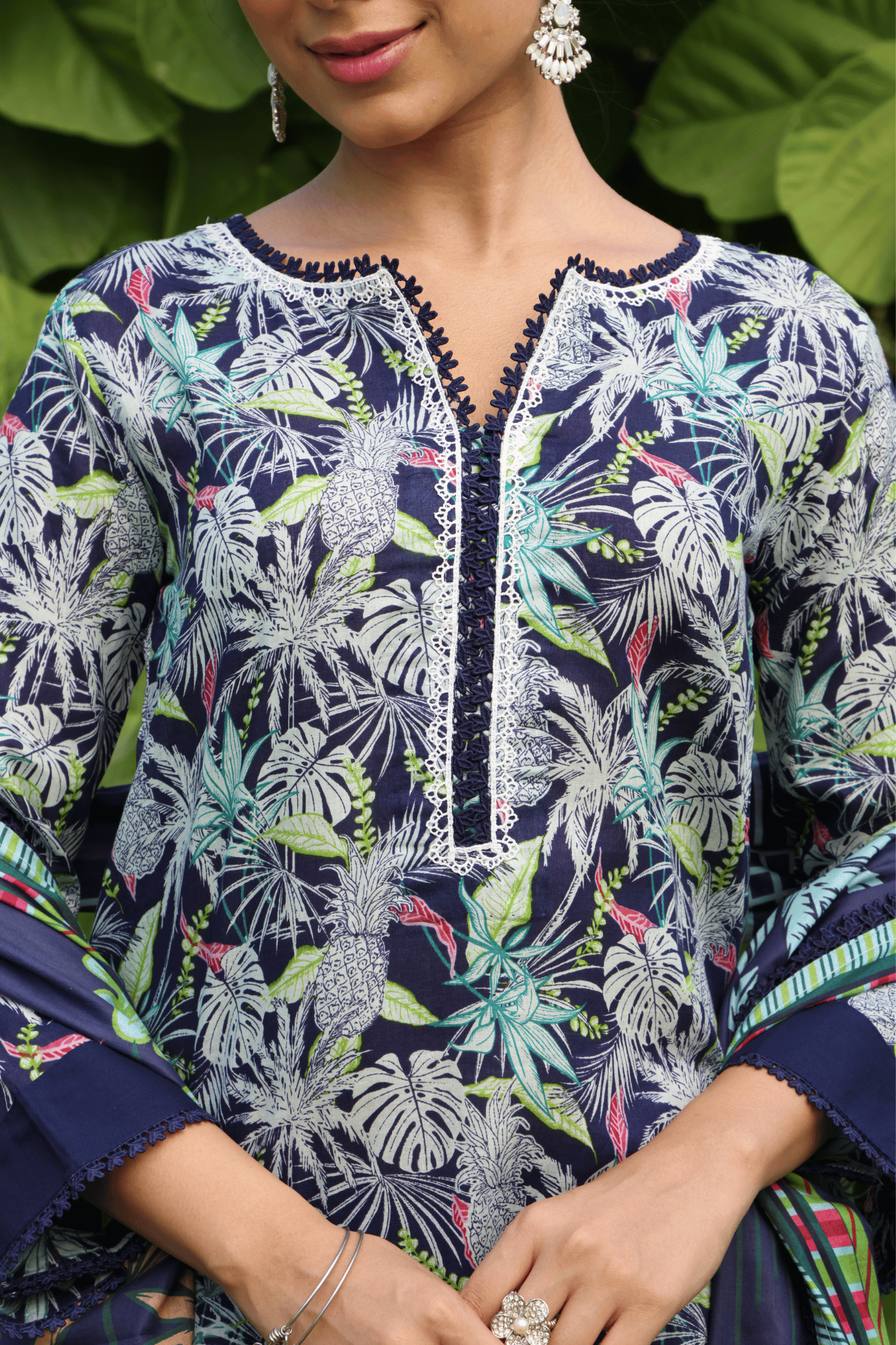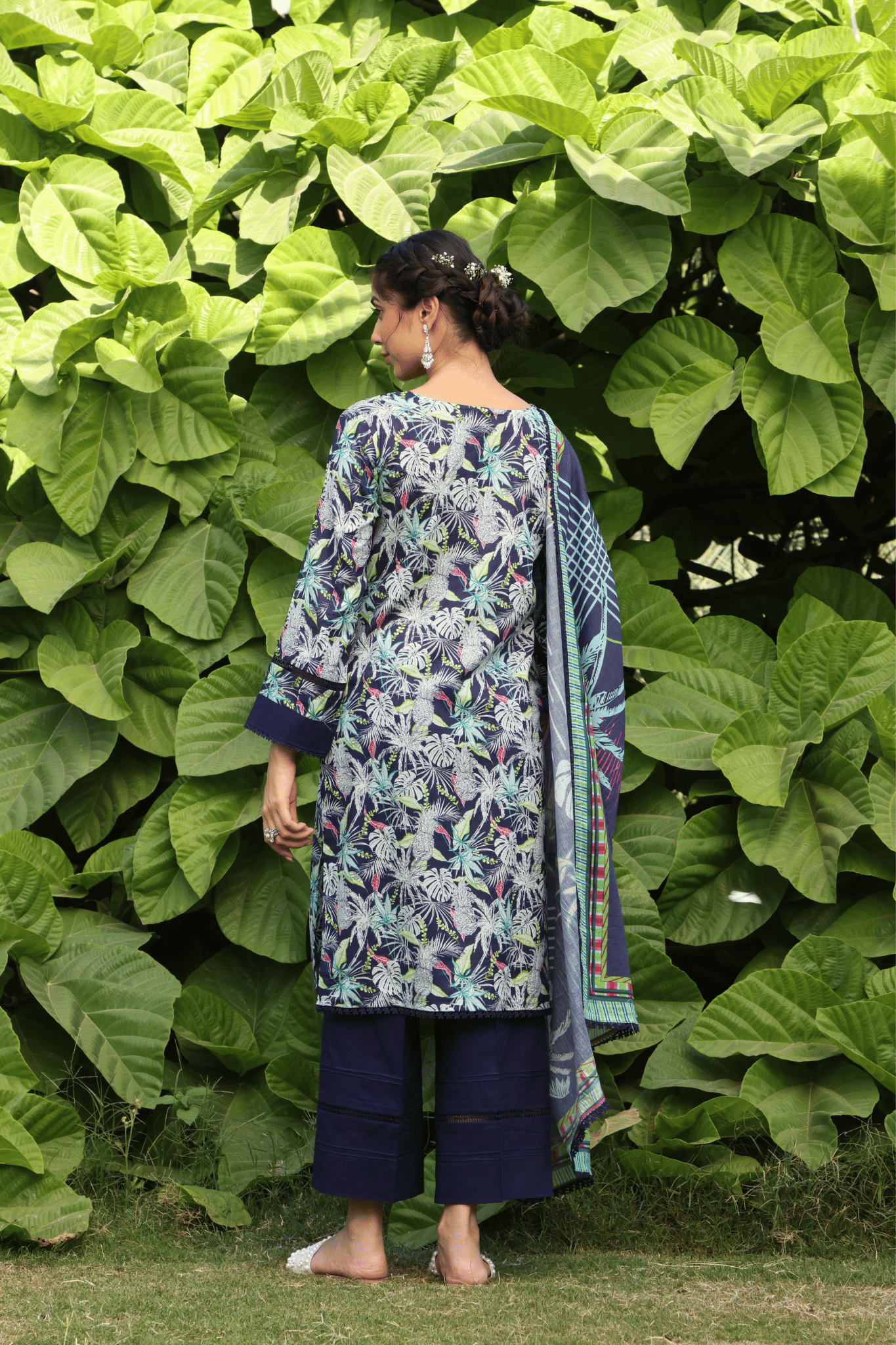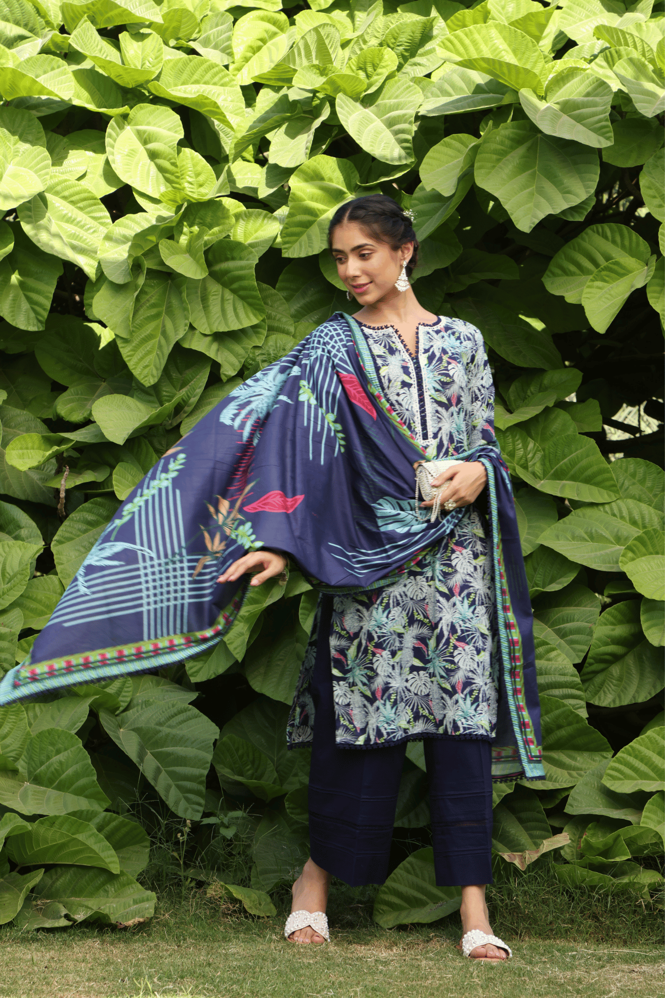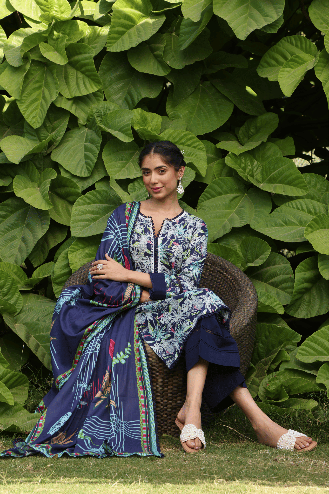 This vibrant three-piece ensemble is designed for sunny days and spirited gatherings.A breezy kurta featuring a vivid floral print on cool, breathable fabric, with delicate detailing along the neckline for a touch of elegance.