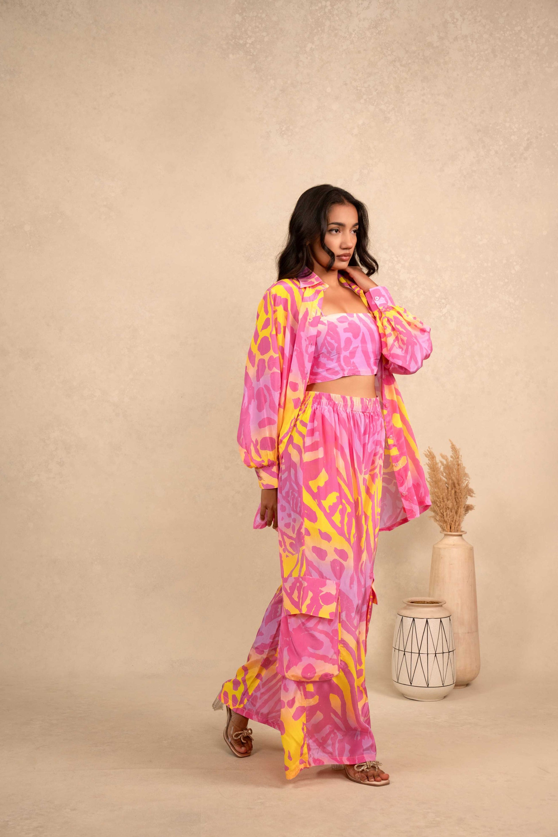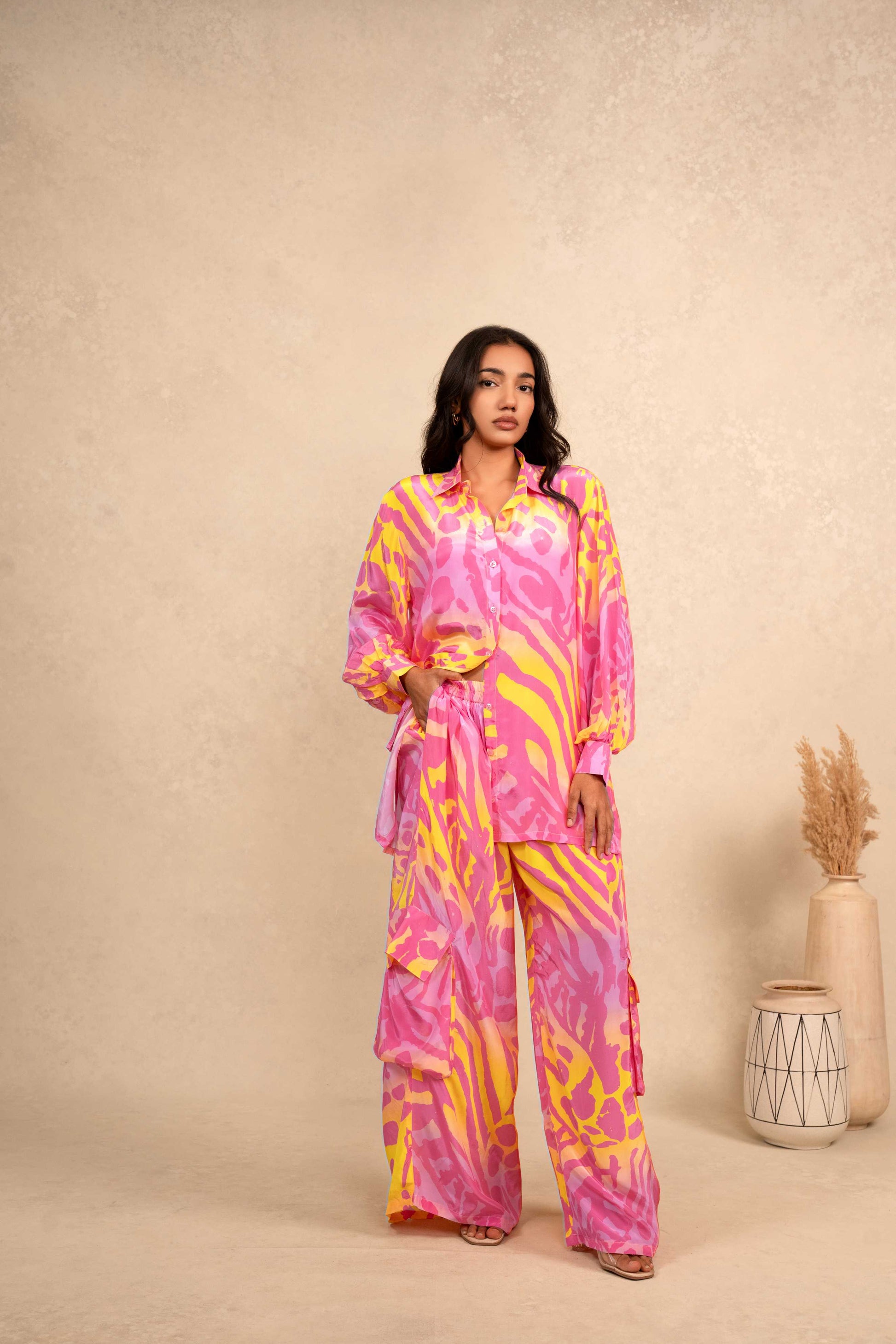 The Best Daywear Co-ord its a refreshing take on easy, all-day dressing. Designed in a soft pink and yellow ombré, it transitions effortlessly from bright daytime outings to golden-hour sundowners.The gradient print flows seamlessly from bright pink to sunset yellow, giving this oversized shirt and cargo pants duo an eye-catching, dreamy aesthetic. Crafted for comfort and impact, this set is all about playful and polished vibe. Fabric: Crepe