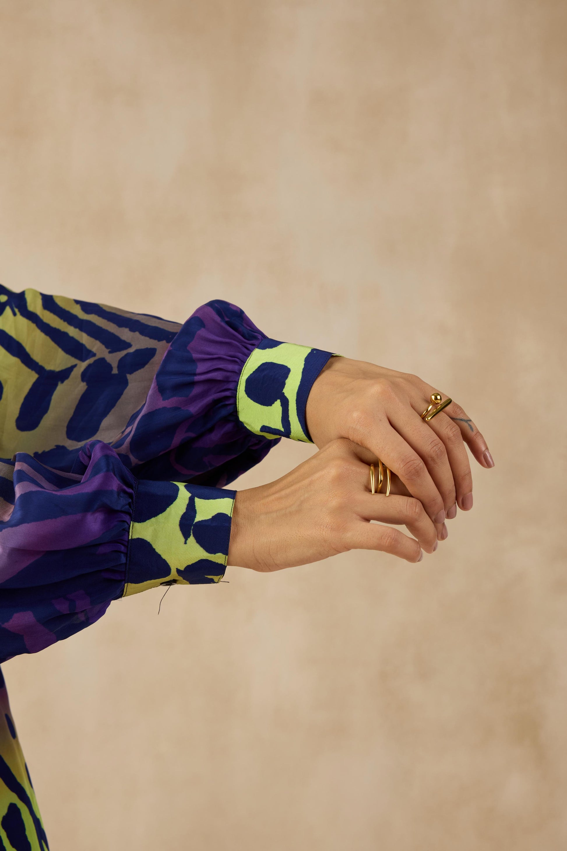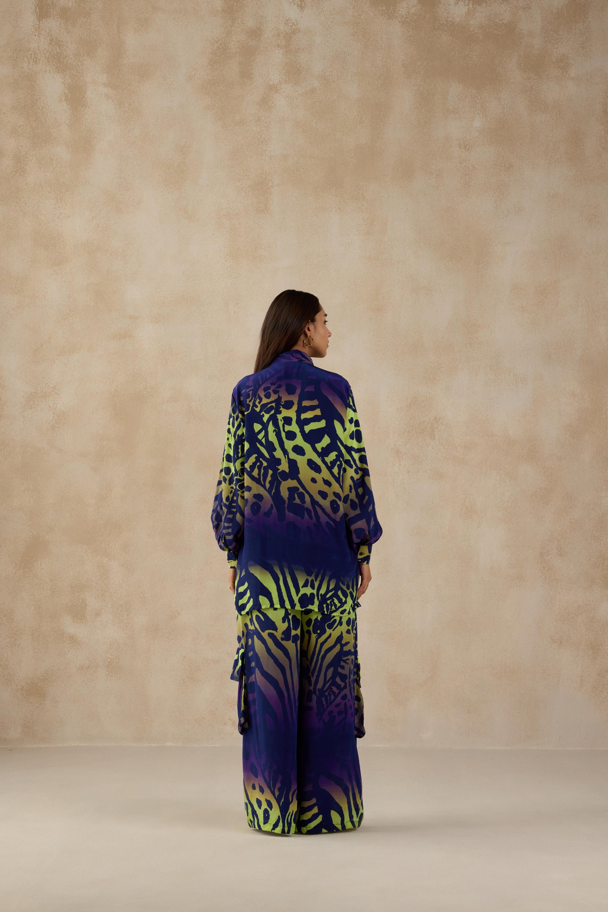 A bold statement piece, the Tulum Shirt blends structured tailoring with fluid movement. Crafted from a breathable, lightweight crepe fabric, it features a striking animal print in electric hues of blue, green, and yellow that embody fierce energy. The oversized fit, full-length sleeves, and classic button-down silhouette make it a versatile piece, perfect for layering or wearing solo. Elevate your street-style game by pairing it with the Tulum Cargo Pants for a power-packed look.