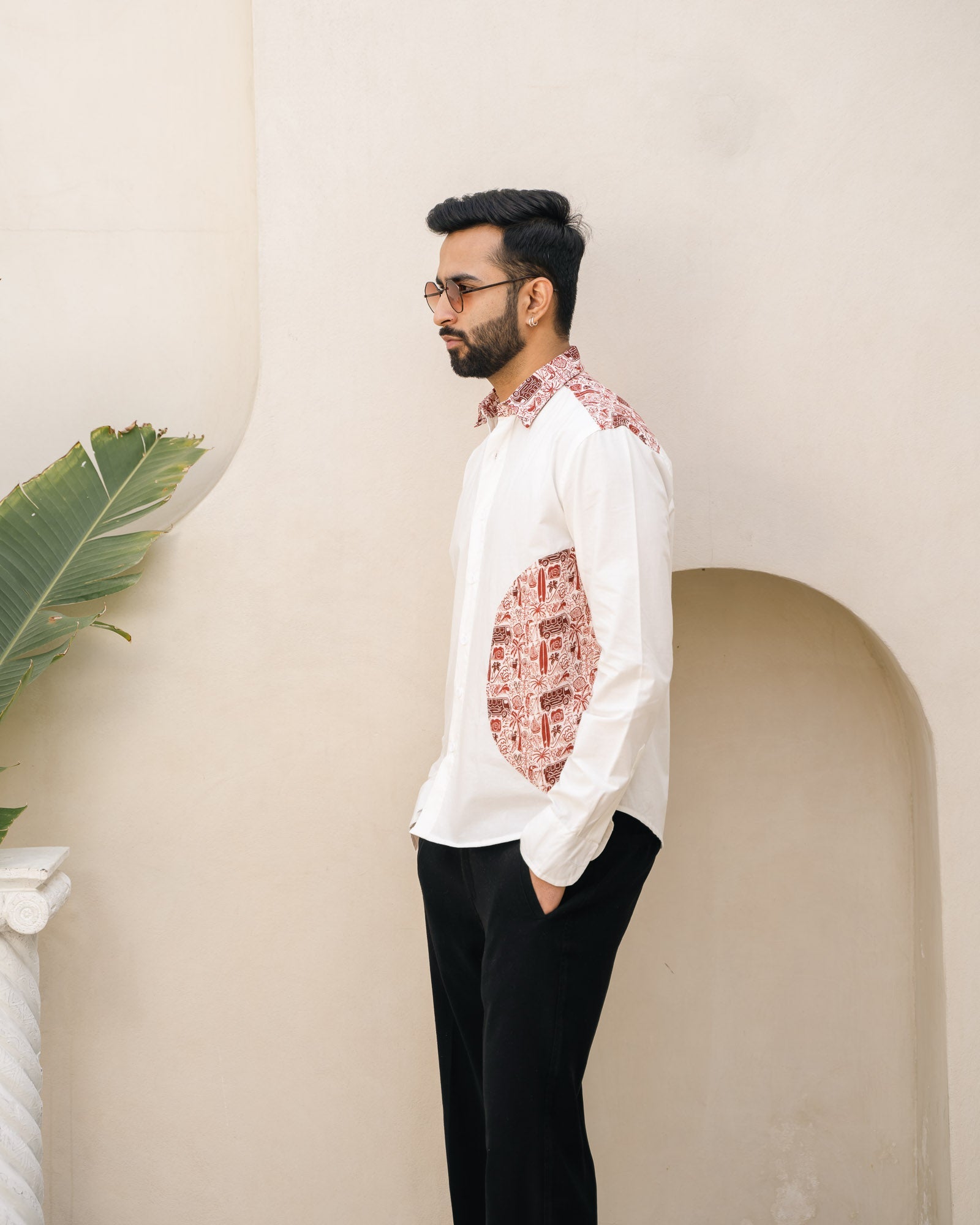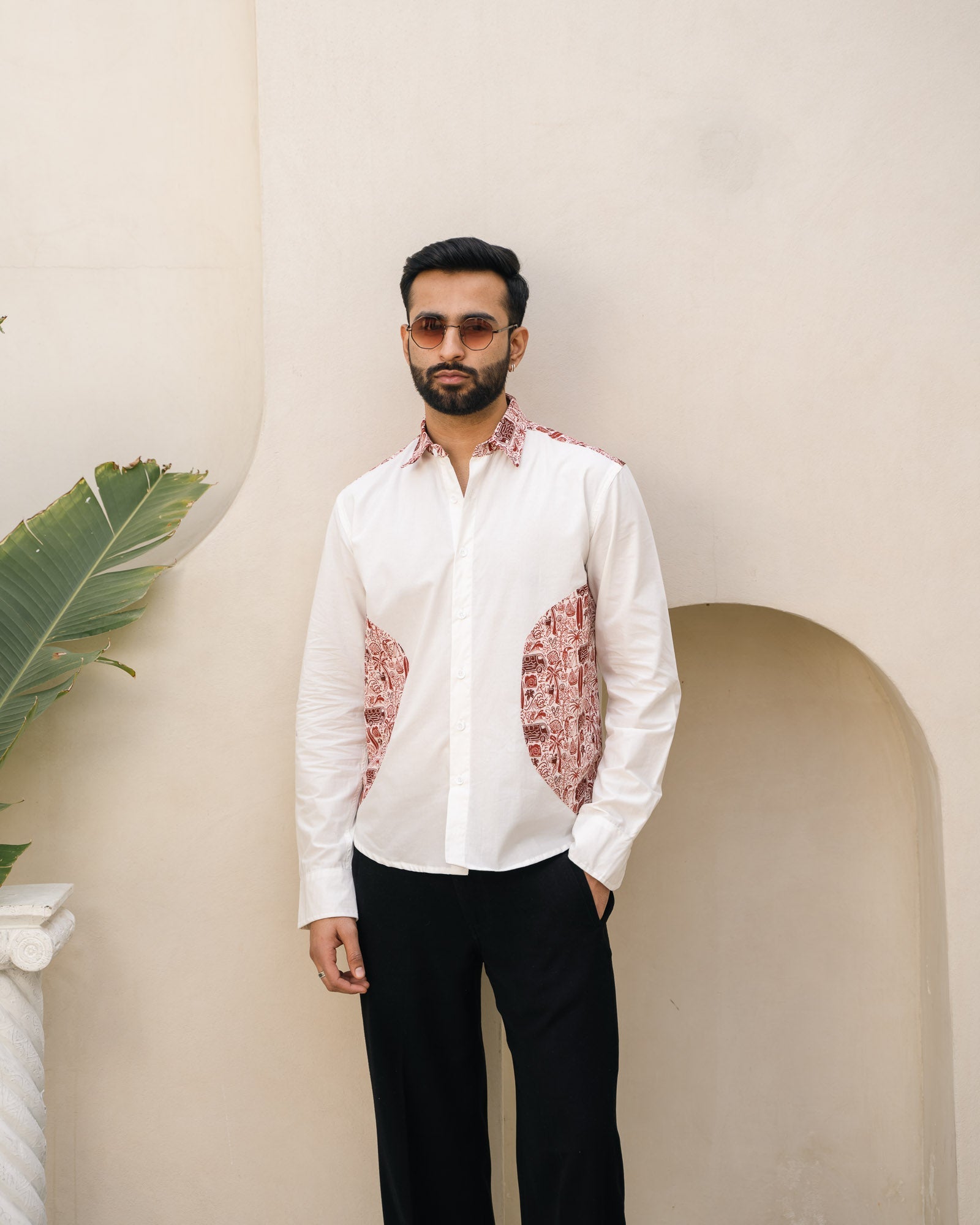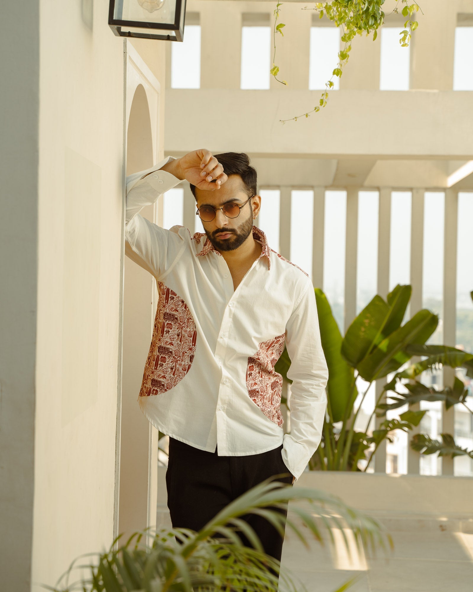 Stylish Men's white shirt with unique red beach-themed print on side panels. Perfect for casual outings, beach vacations, or adding a touch of fun to your everyday look.