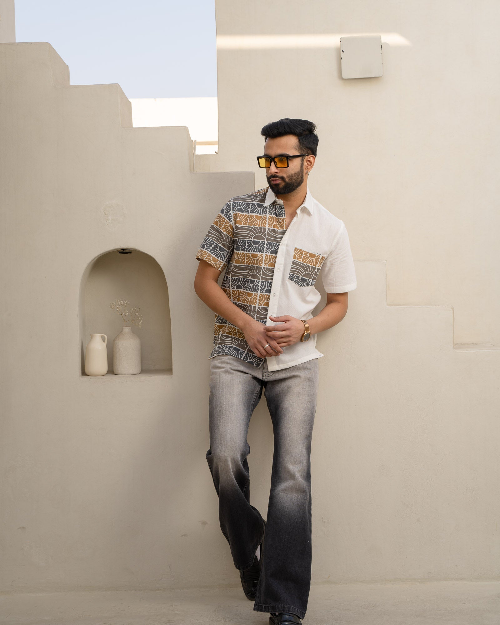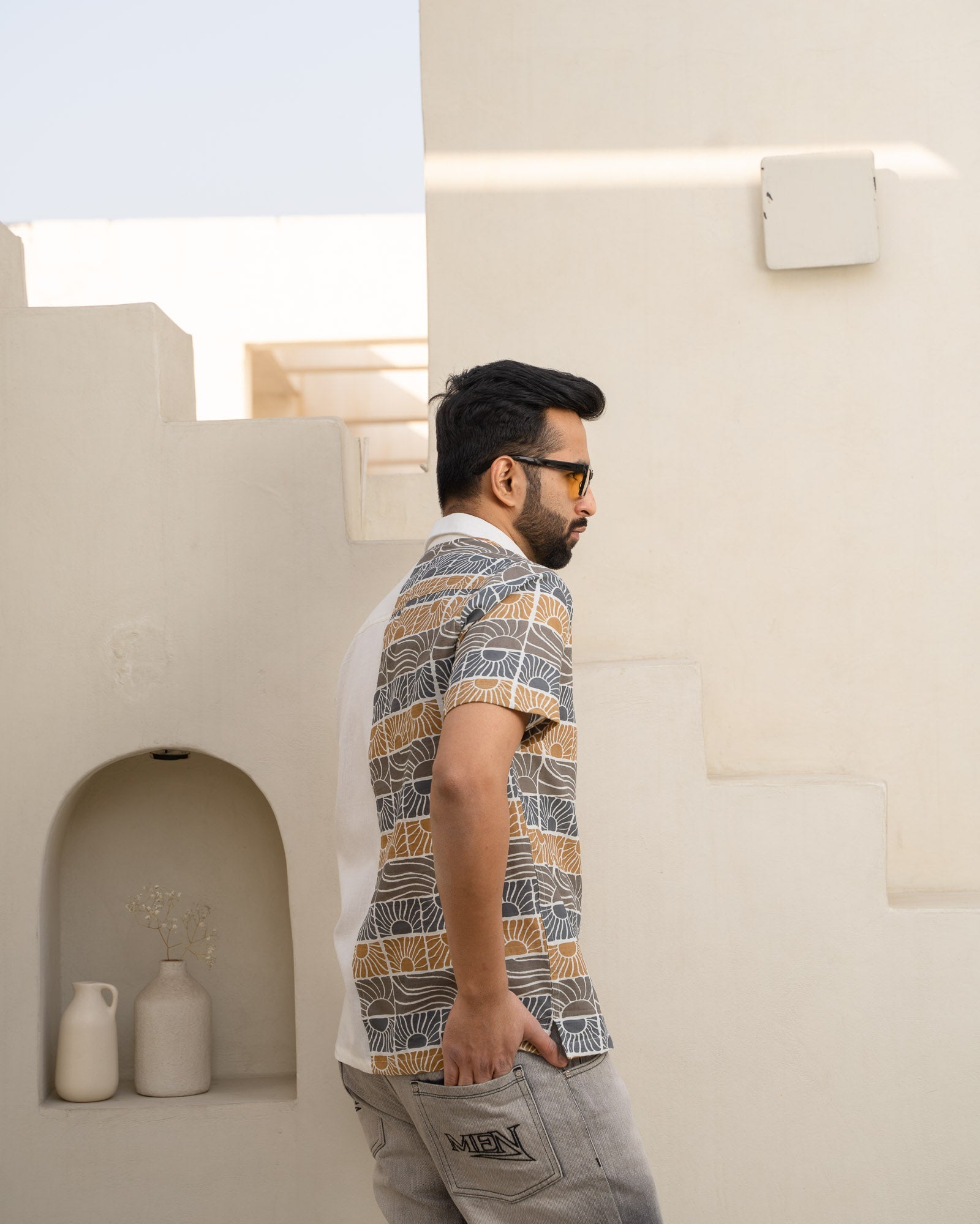 Stylish linen-blended shirt with beige and brown sun patterns, perfect for casual outings or beachwear. Pair with beige chinos or denim for a relaxed summer look.
