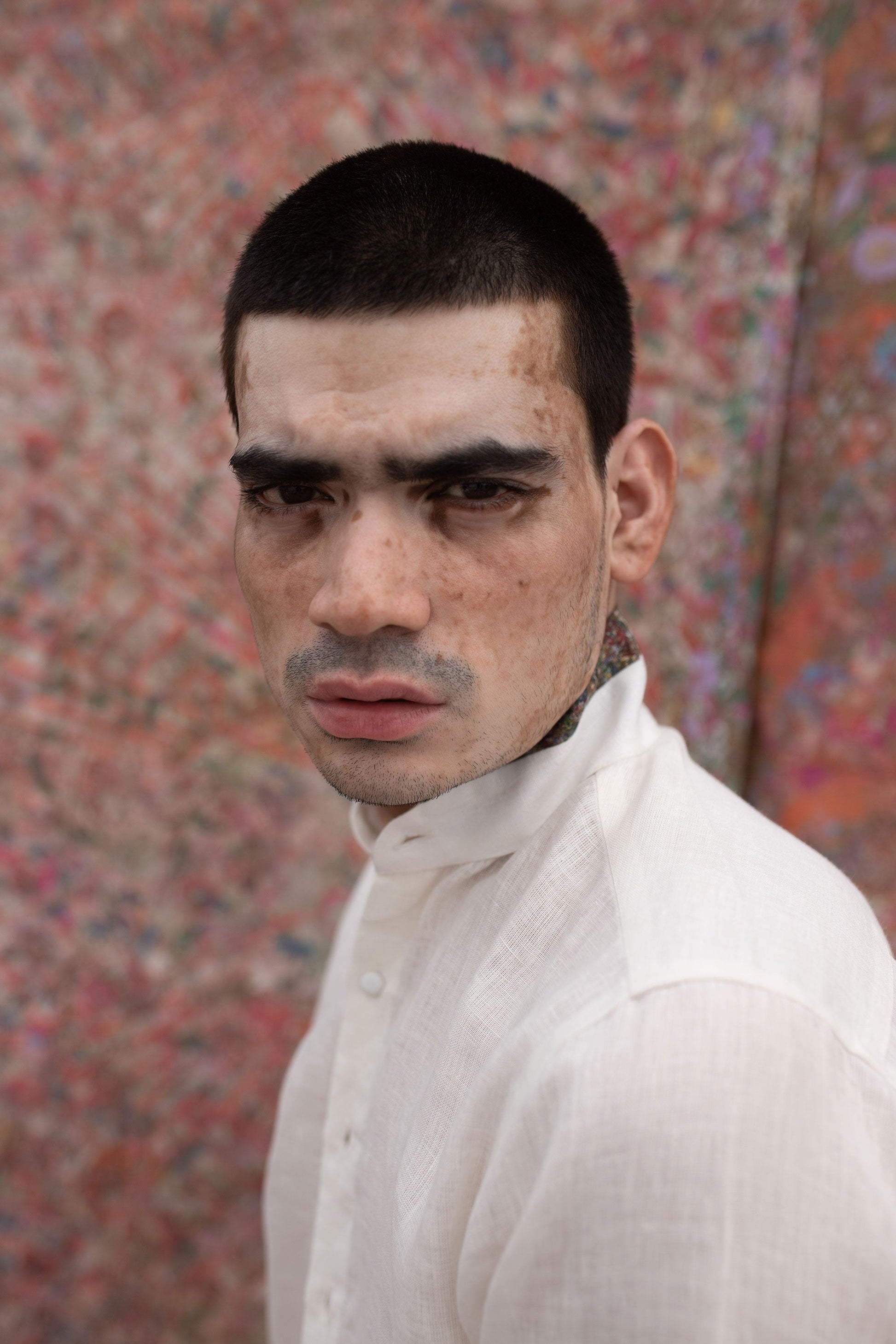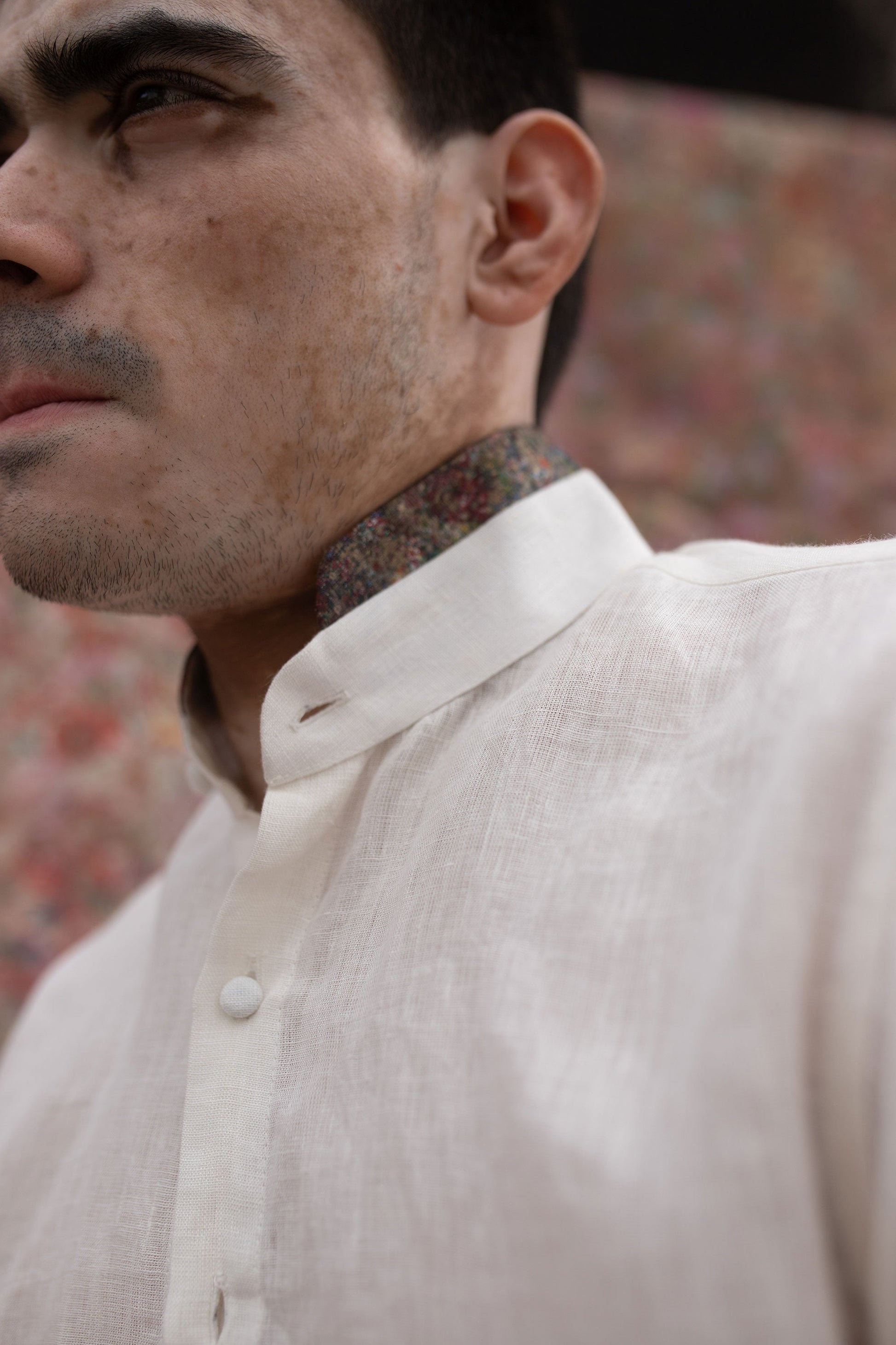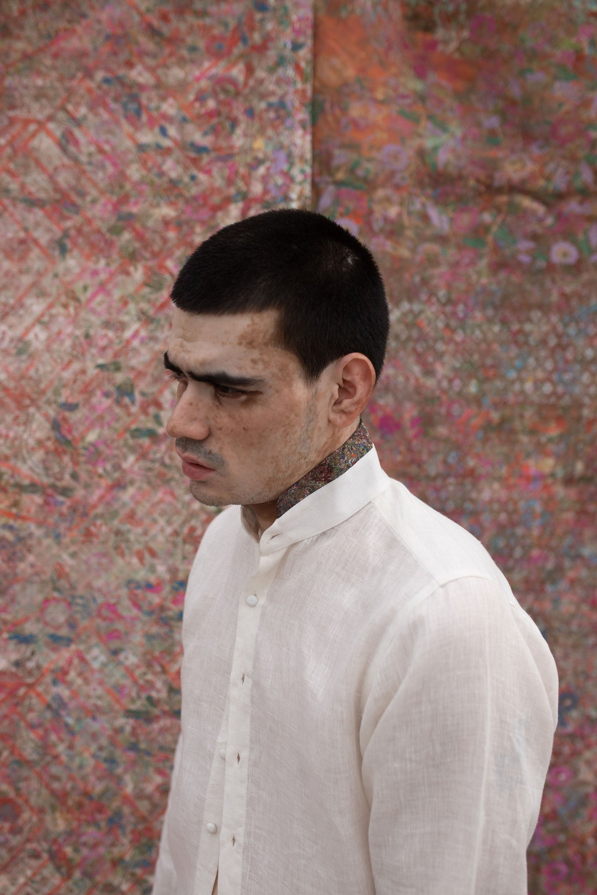 This shirt has a Patina block printed one-of-a-kind fabric collar edge detail.