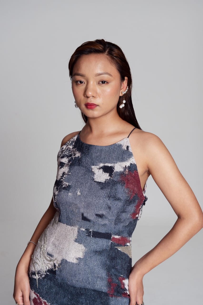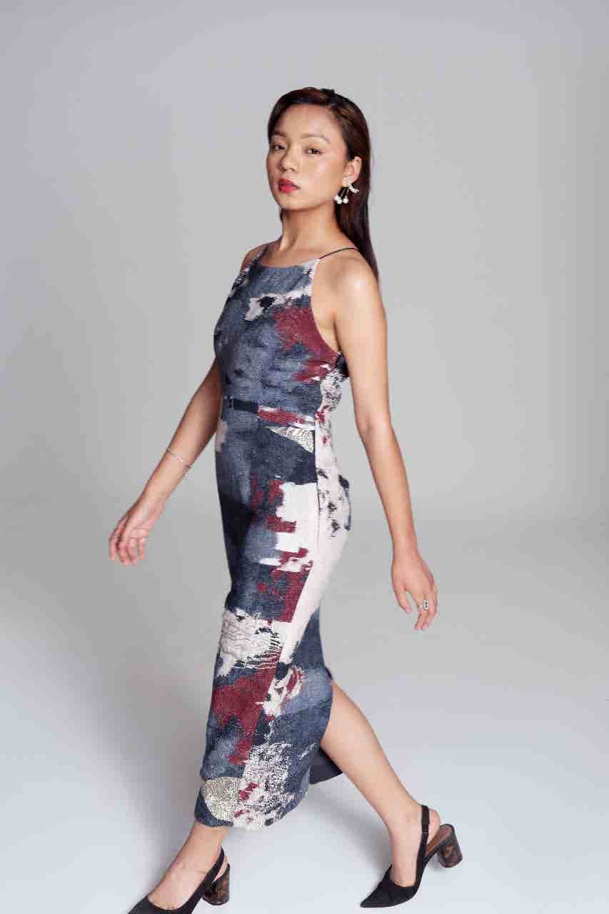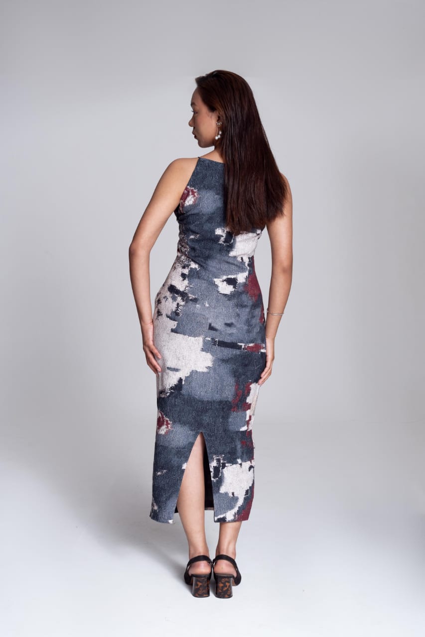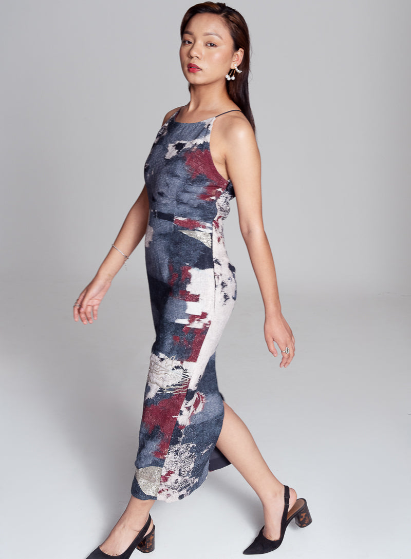 Berry, hazy blue, ivory hand embroidered halter neck, body hugging dress with a variety of formations and the wavy lines of silver to highlight the colors on the dress and add the right amount of glam for you to wear the dress far and wide.