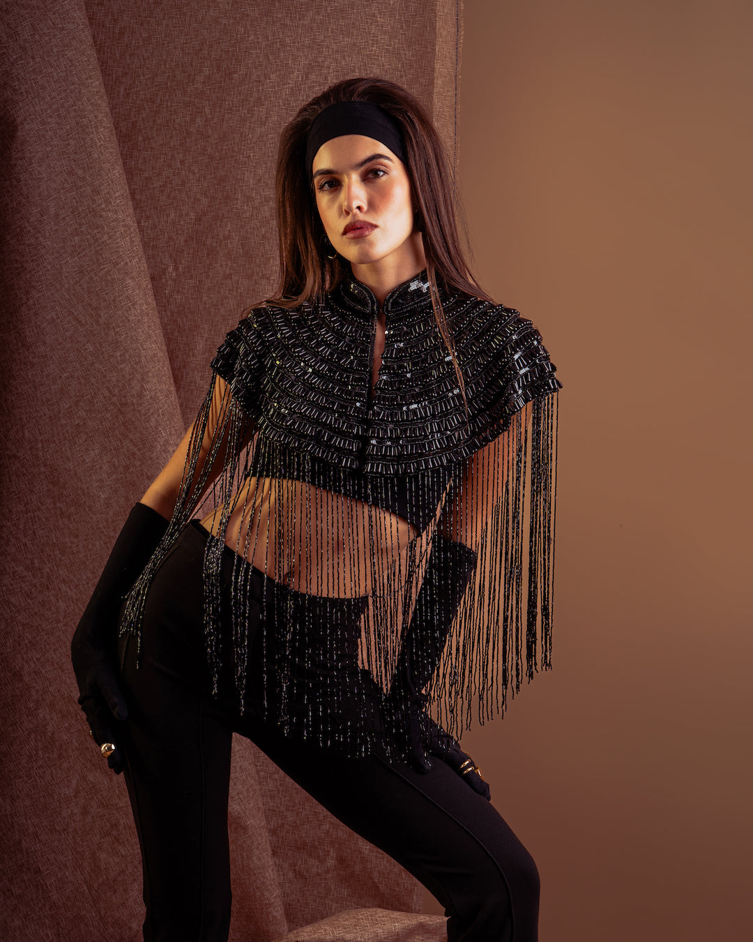 A free size hand crafted cape with delicate bead work & flattering tassles. Can be paired with pants/ dresses for a westernised look & with sarees for a formal Indian look.