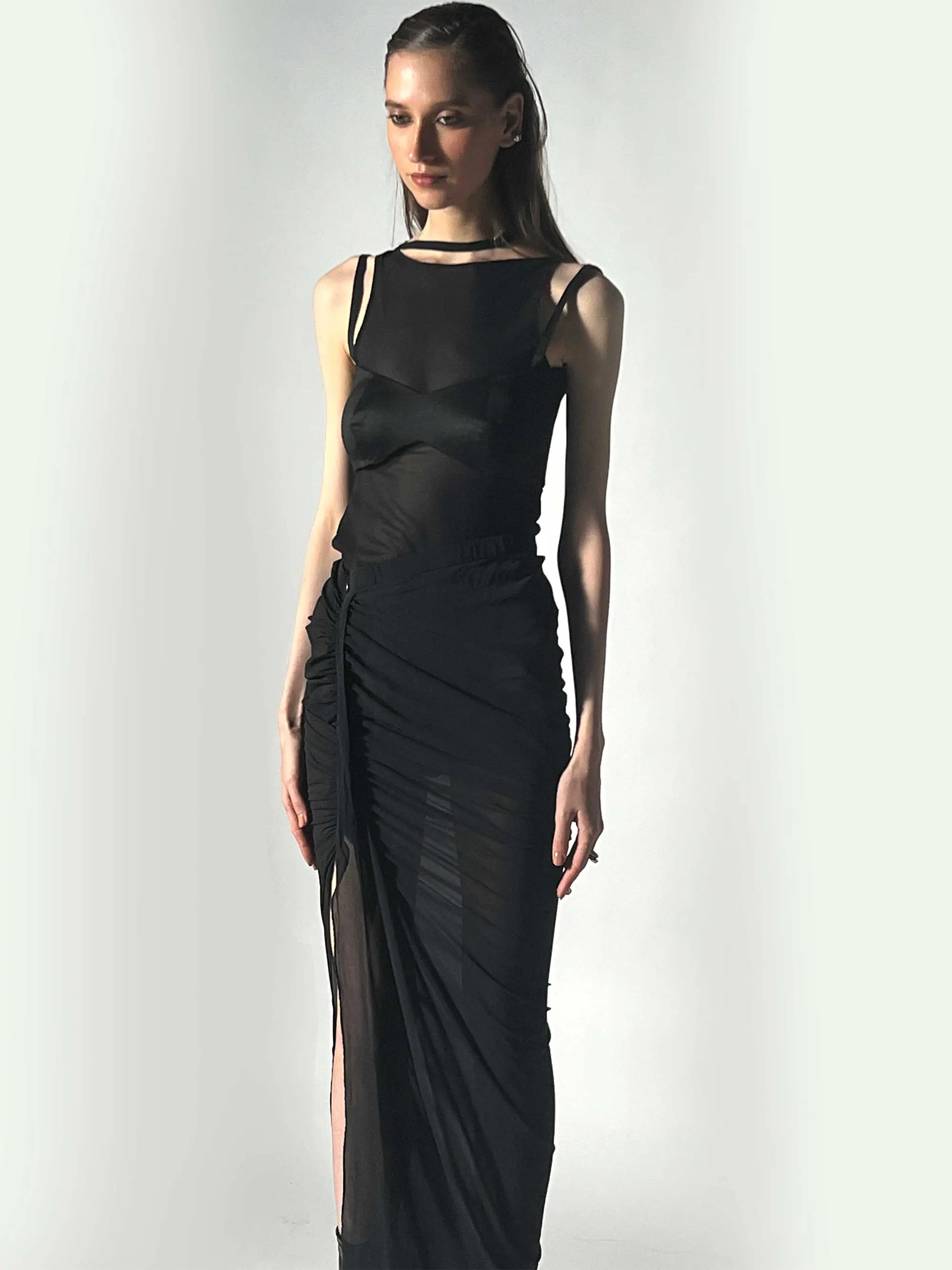 Black bralet top in viscose suiting fabric with adjustable straps and padded cups. Features an inverted V-cut hem and a hook-and-eye closure at the back with extra adjustability.