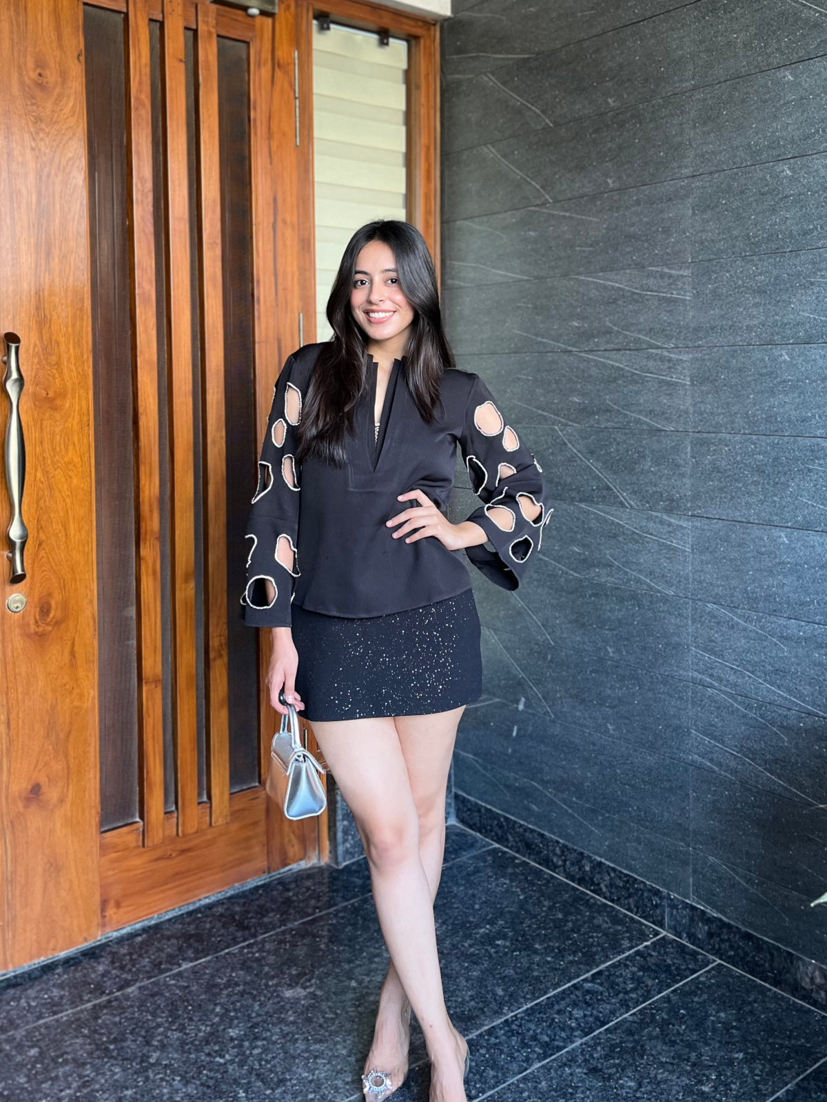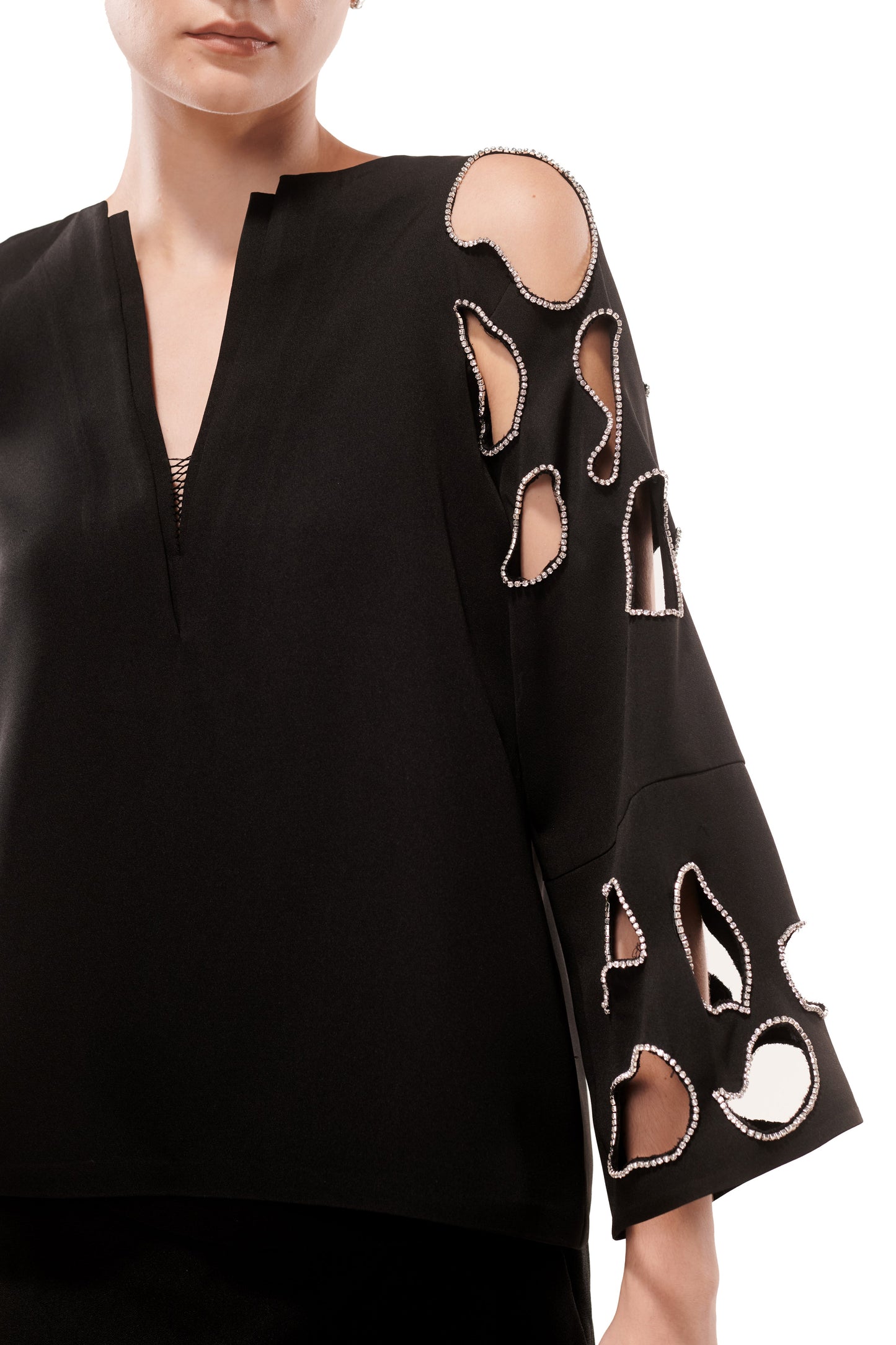 This oversized top features cut outs with hand studded edges at the sleeve and a low double V-neck.