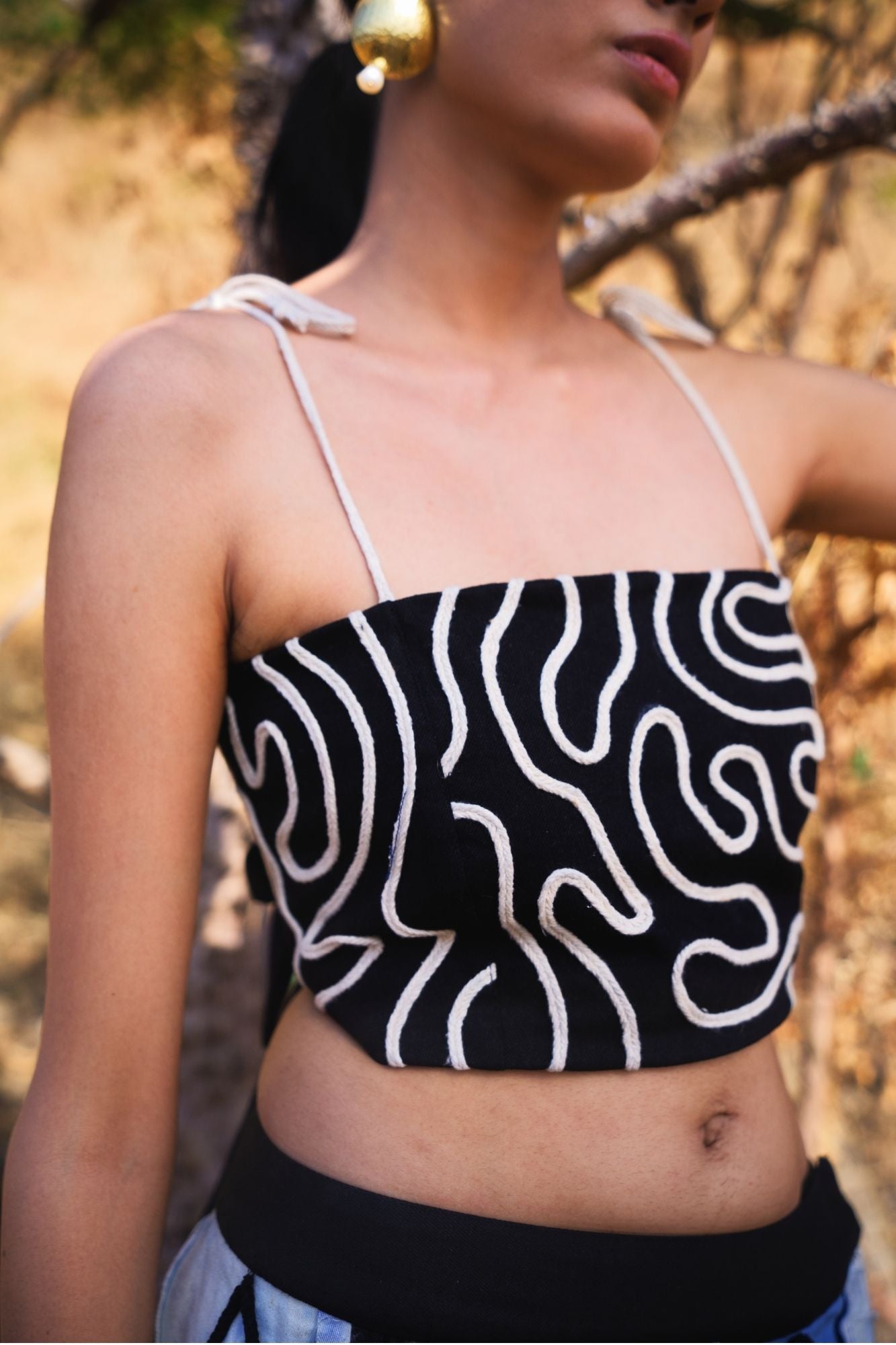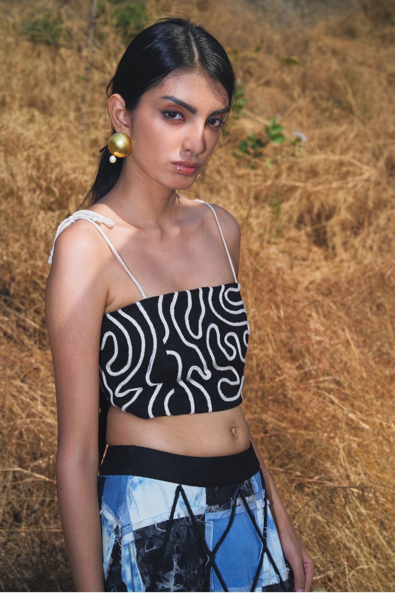 Description – Expertly crafted, our BLACK MAZE TOP features a strappy black denim design with a stunning maze-like pattern created with white hand braided yarn. The back features three ties for a touch of unique style. Elevate your wardrobe with this one-of-a-kind top.