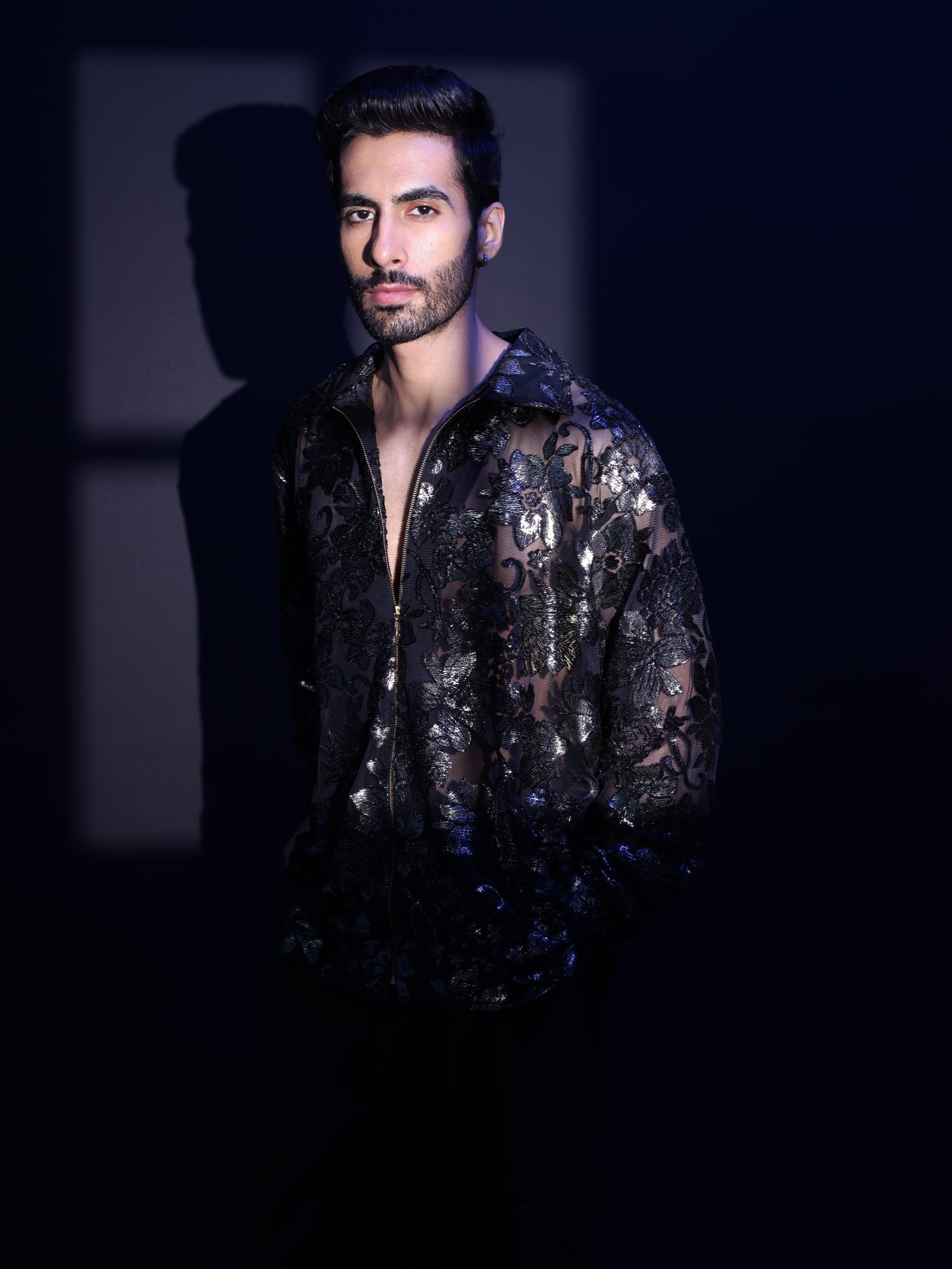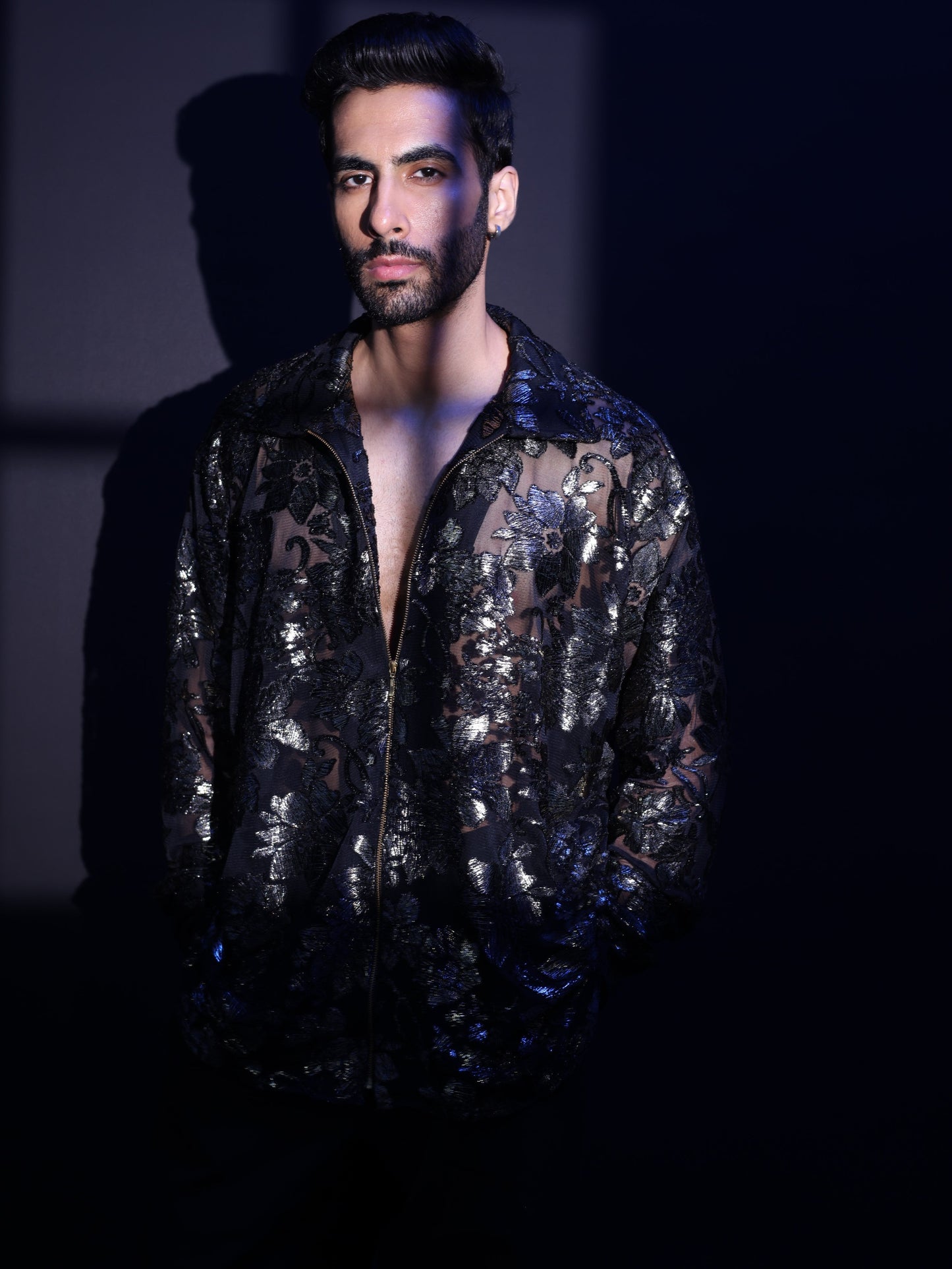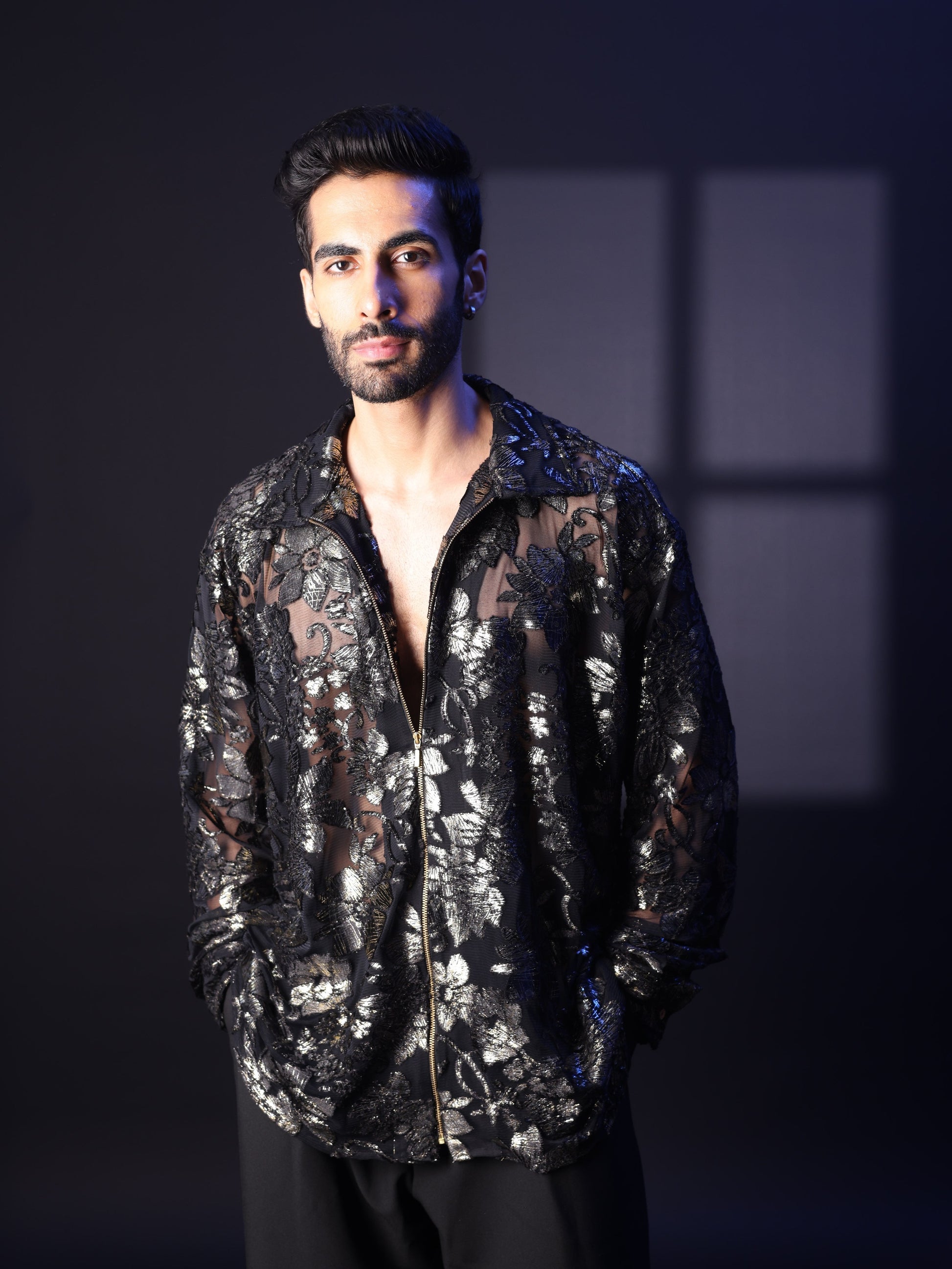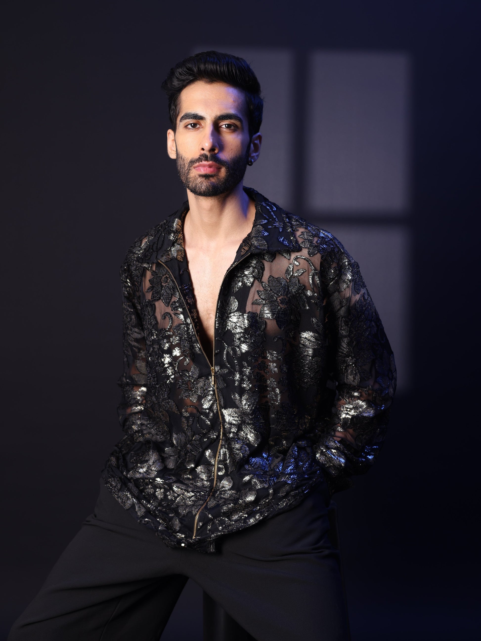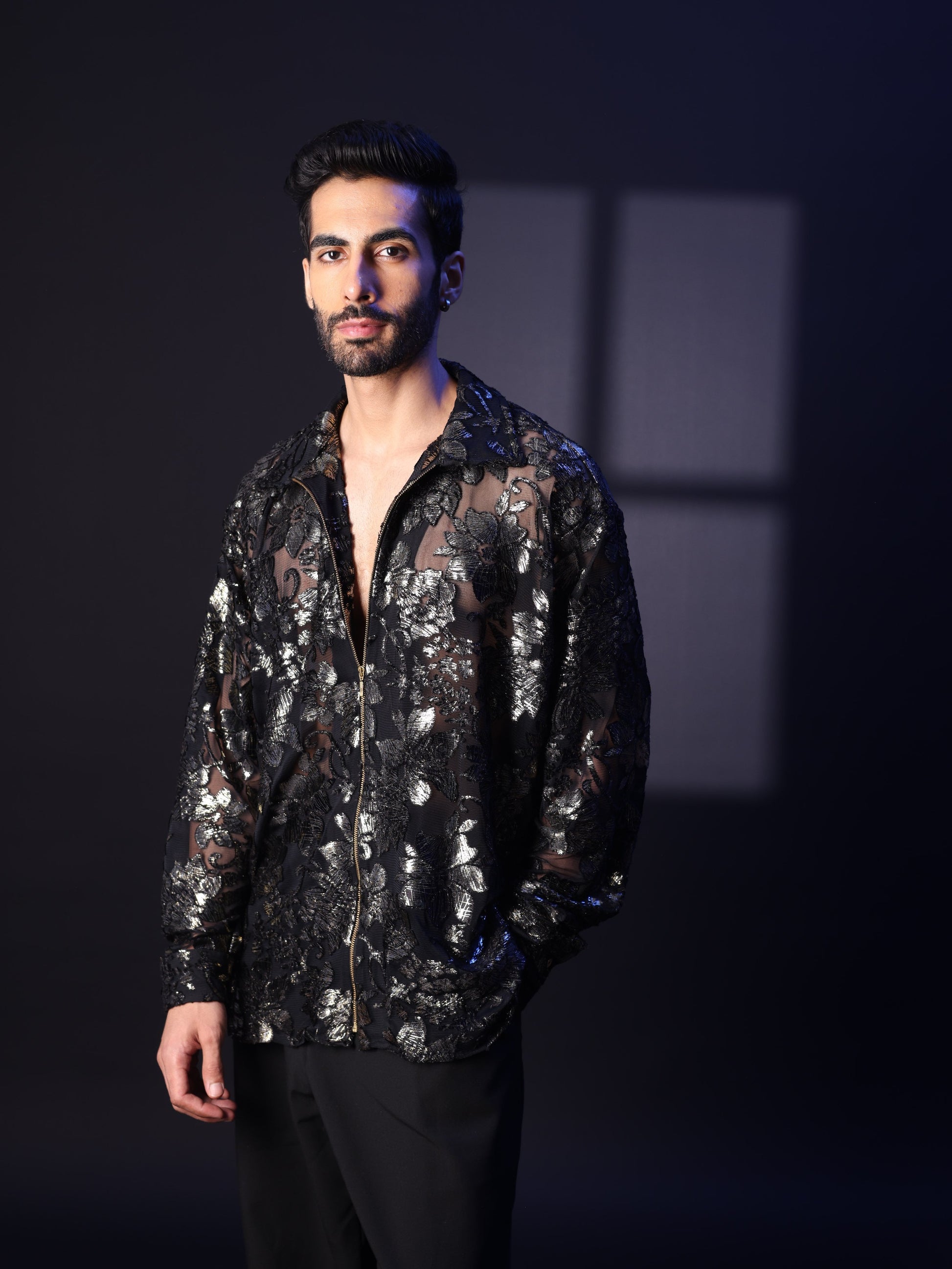 Dramatic, sensual, and opulent — the black venom shirt is designed to turn heads. Crafted from sheer black fabric adorned with metallic floral embroidery, this piece brings together dark romance and modern edge. The relaxed fit, gold-toned front zipper, and effortless silhouette make it an ideal layer for both day and night. Style it over a minimal base for high-impact contrast, or wear it as a statement on its own for evenings that demand attention.