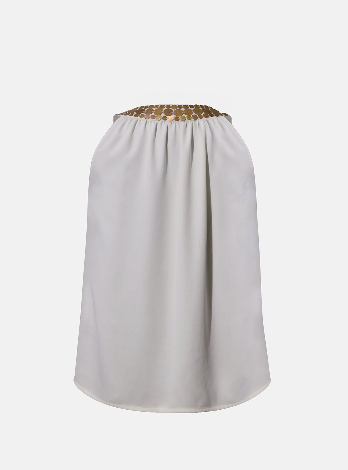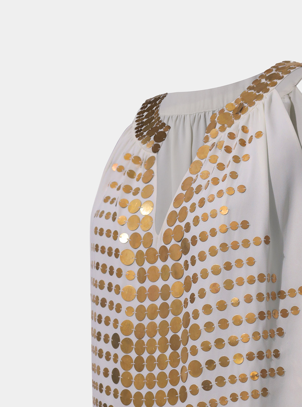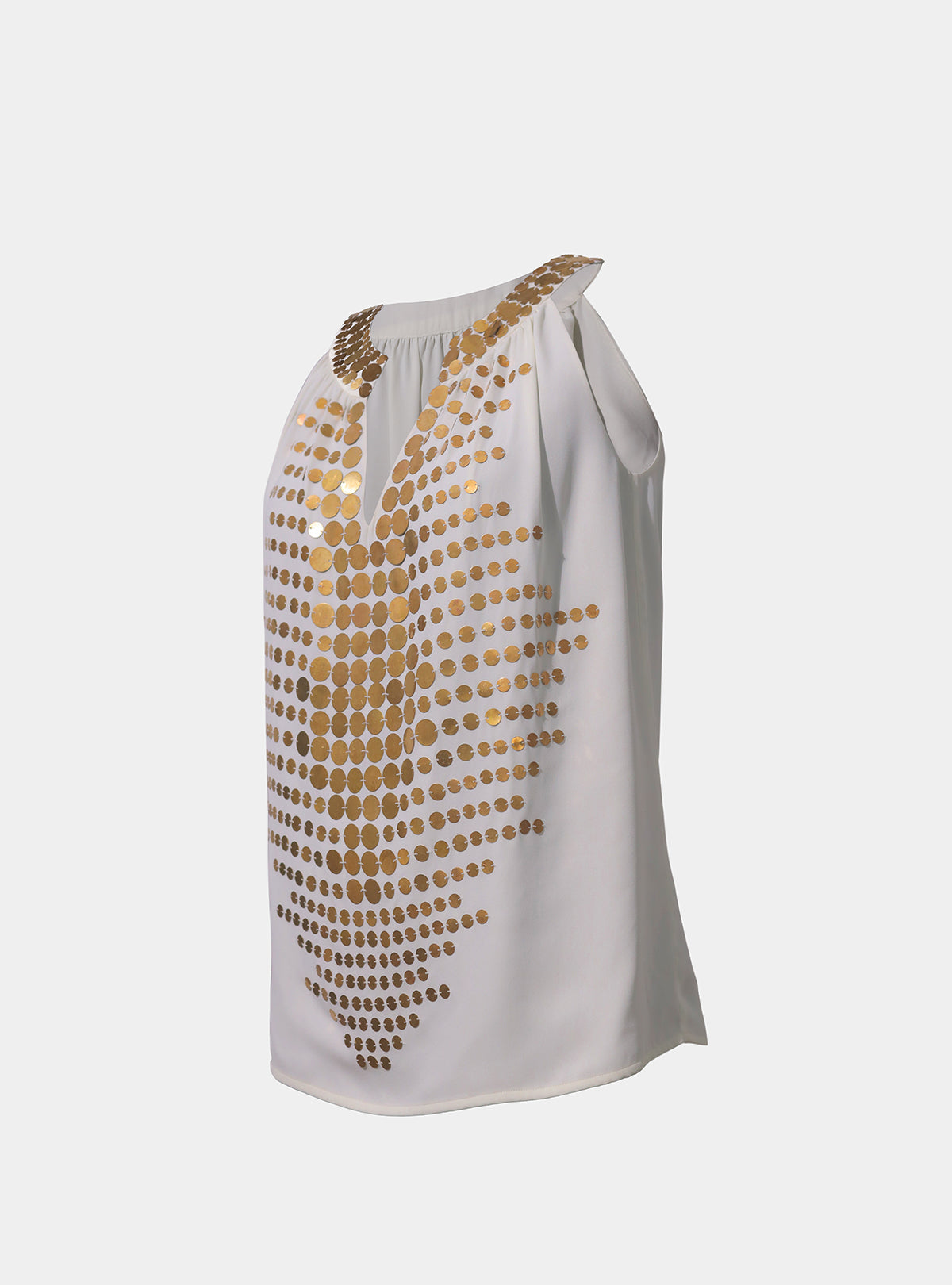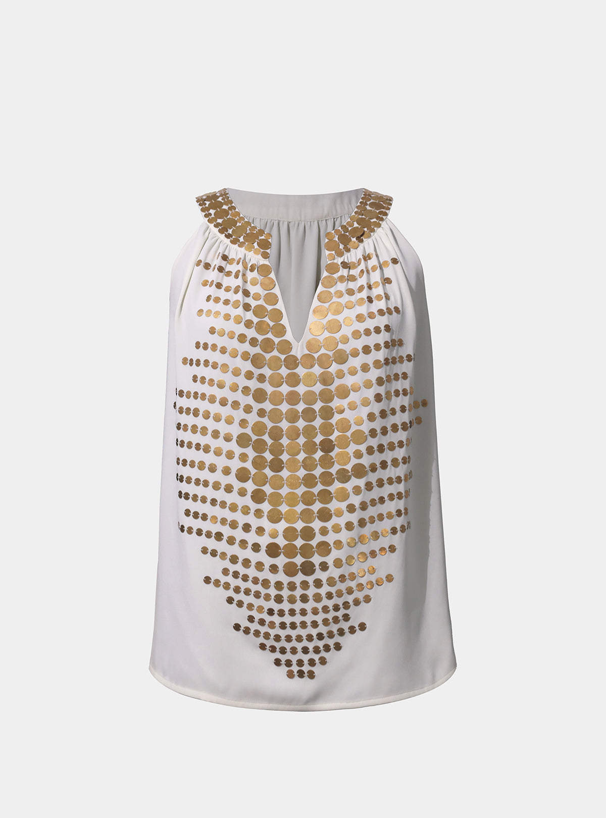 Make a dazzling entrance with this show-stopping georgette top, adorned with a mesmerizing pattern of metallic coins that shimmer and shine in the light. The daring deep V-neckline adds a touch of modern sophistication, elevating this piece to evening wear perfection.