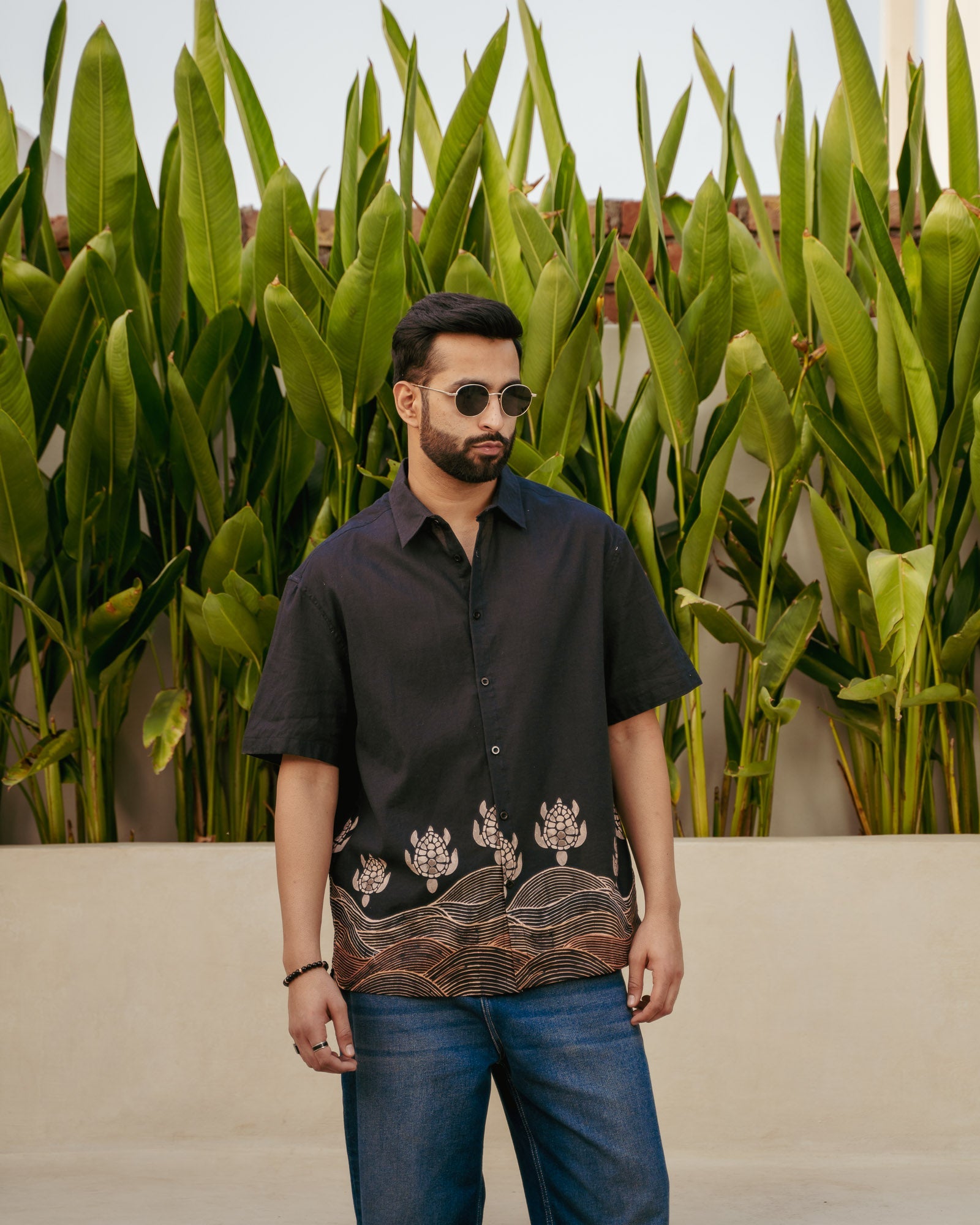 stylish men's linen shirt with turtle print or wave pattern. Perfect for a beach vacation or casual summer look.