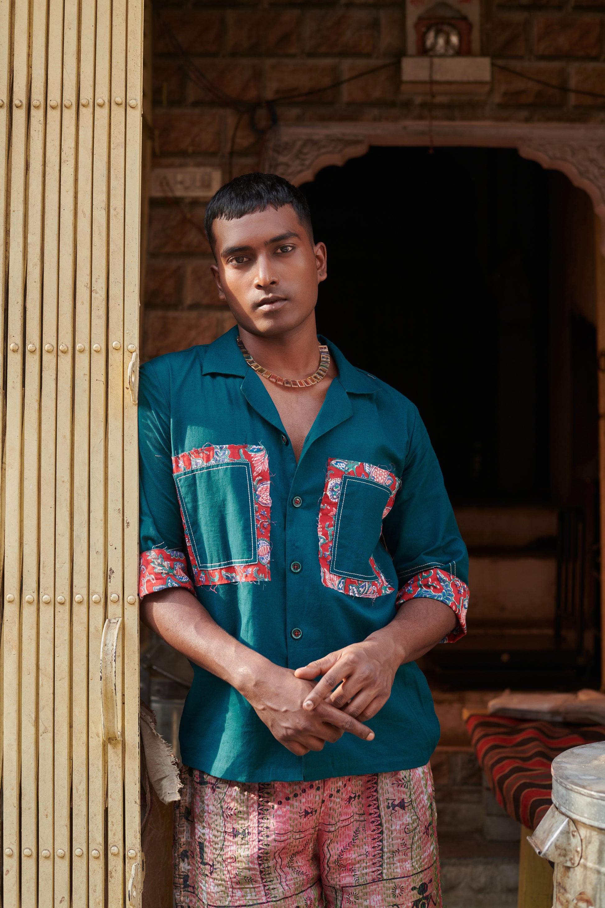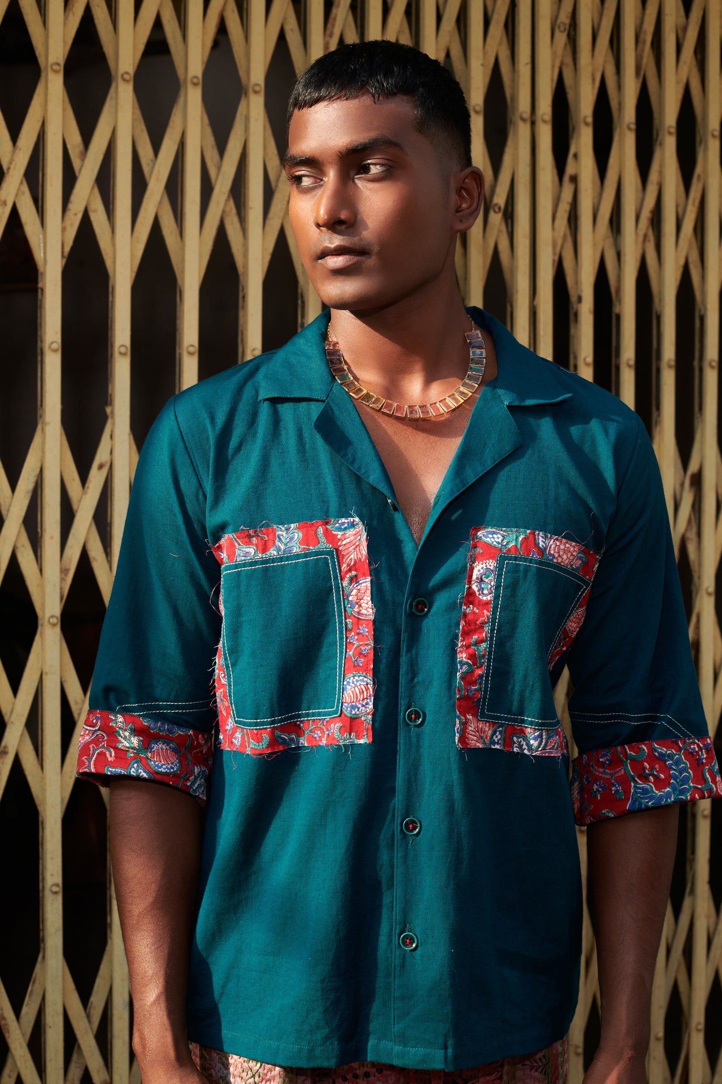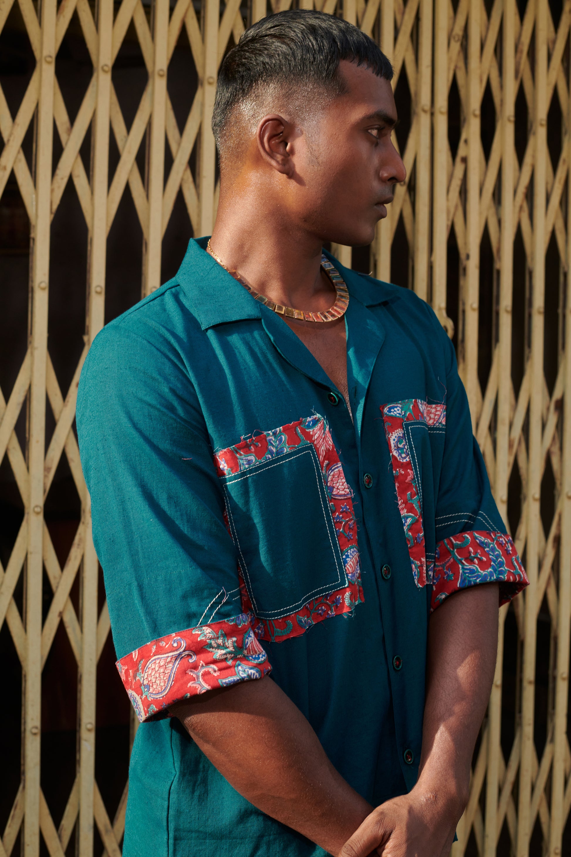 This teal blue shirt, named "Blooming Soul," embodies the essence of personal growth and renewal. The design features vibrant red handblock floral print patchwork on the pockets and back, symbolizing a flourishing garden in full bloom. The Cuban collar and 3/4th sleeves add a classic, stylish touch, while the inside of the sleeves reveals more of the striking red print when folded, enhancing the shirt's dynamic design. "Blooming Soul" represents the journey of growth and the beauty that comes with embracing change and allowing oneself to flourish.