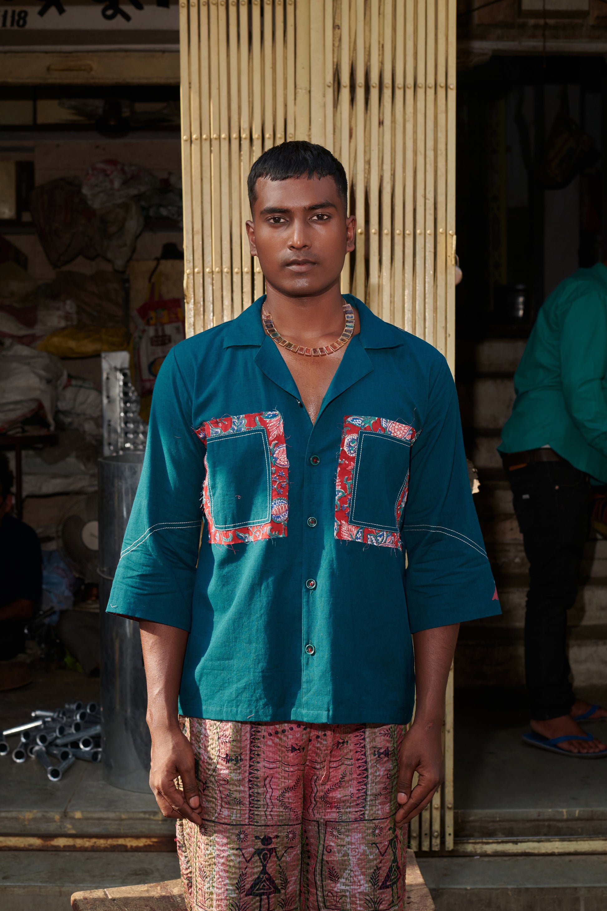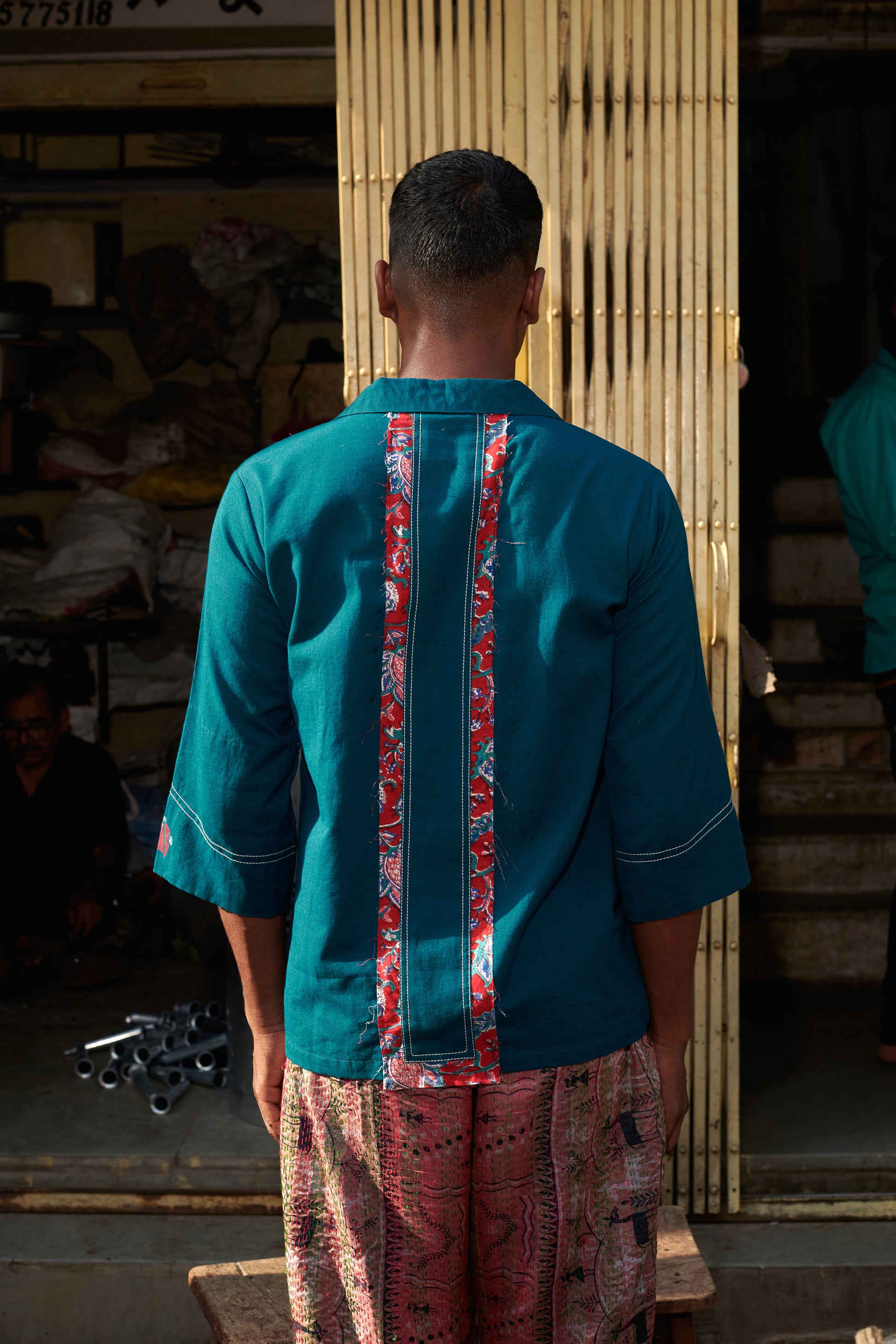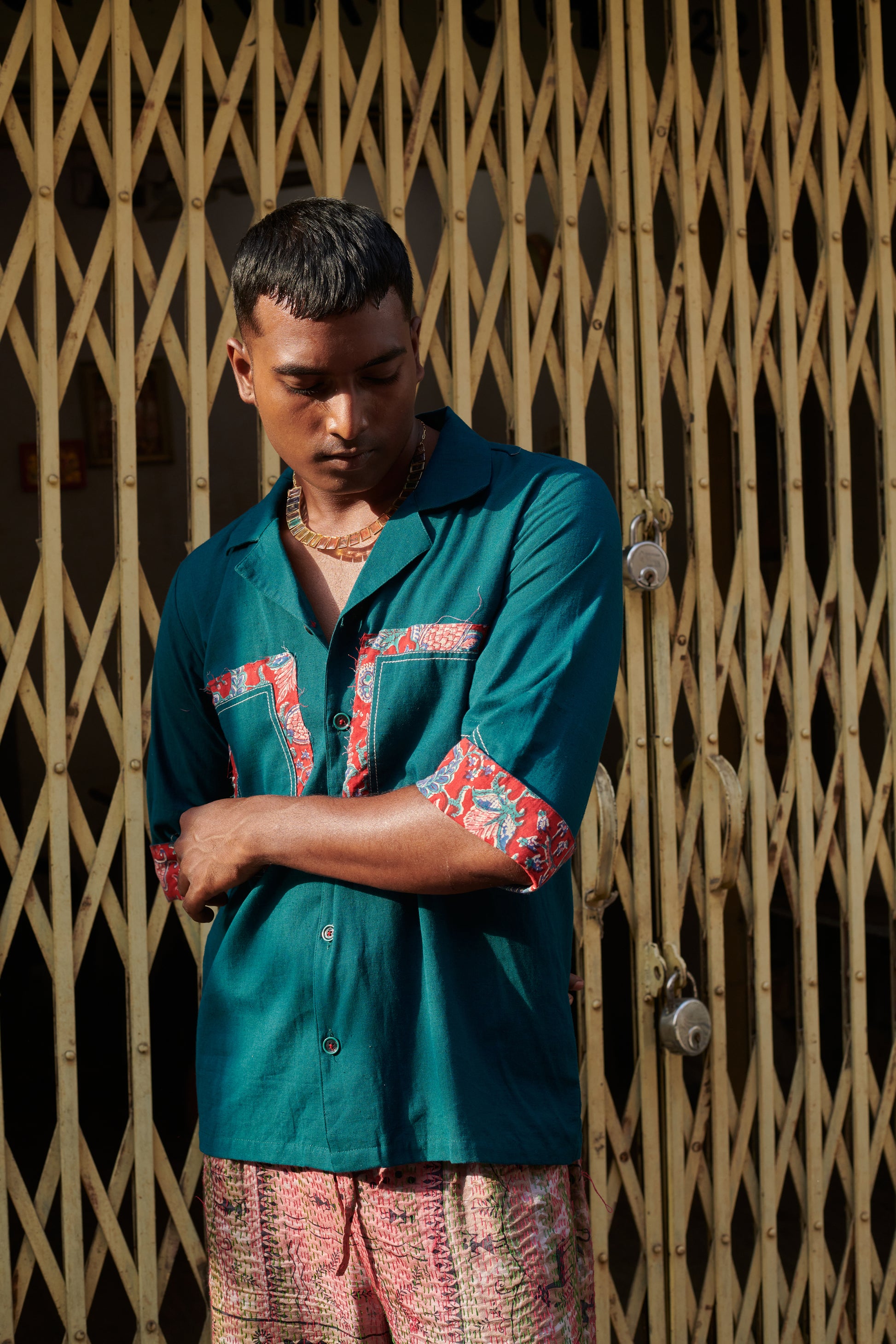 This teal blue shirt, named "Blooming Soul," embodies the essence of personal growth and renewal. The design features vibrant red handblock floral print patchwork on the pockets and back, symbolizing a flourishing garden in full bloom. The Cuban collar and 3/4th sleeves add a classic, stylish touch, while the inside of the sleeves reveals more of the striking red print when folded, enhancing the shirt's dynamic design. "Blooming Soul" represents the journey of growth and the beauty that comes with embracing change and allowing oneself to flourish.