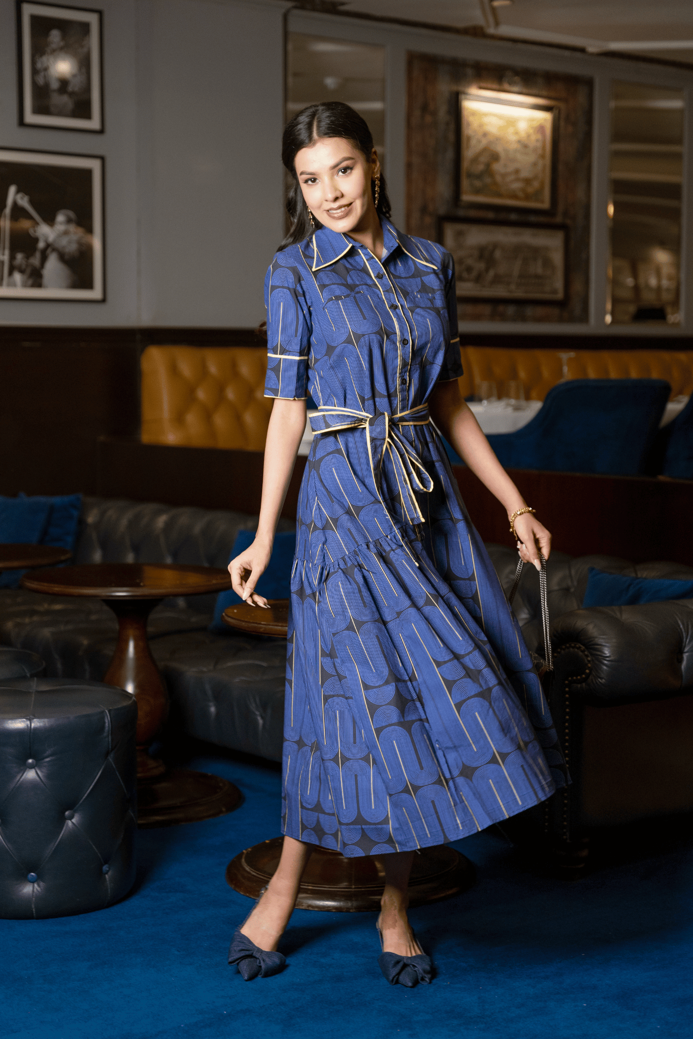 Command attention with the Blue Black Geometric Printed Cotton Dress, designed to offer both style and sophistication. This smart shirt dress features a contrasting yellow band lining that adds a playful touch, while the monochrome belt enhances its sleek silhouette. Perfect for day-to-night transitions, this dress is a wardrobe staple for the modern fashion enthusiast.