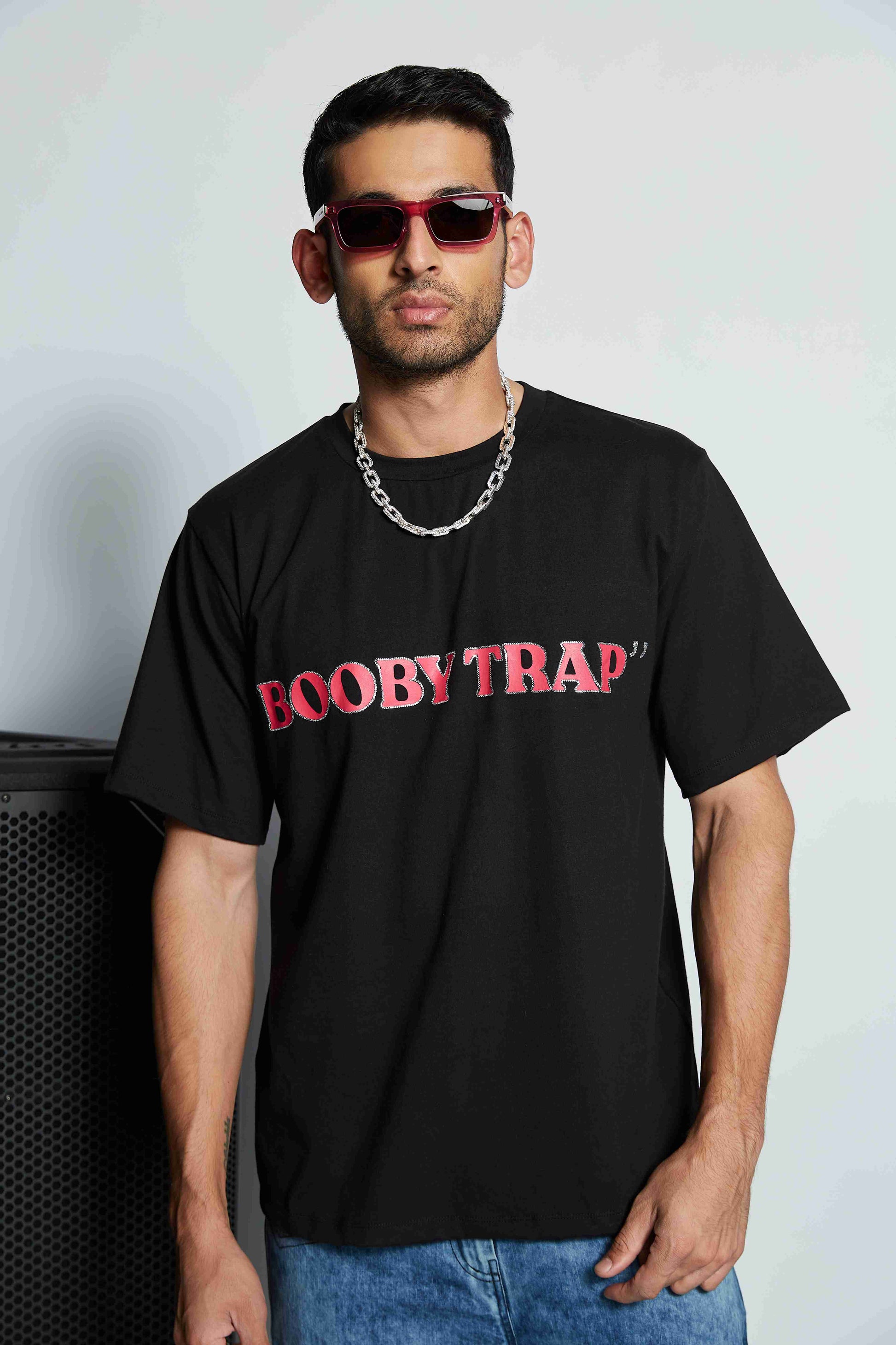 Oversized round neck tee featuring “Booby Trap” graphic print detailed with hand embellished Swarovski crystals. Available in white and black colour.