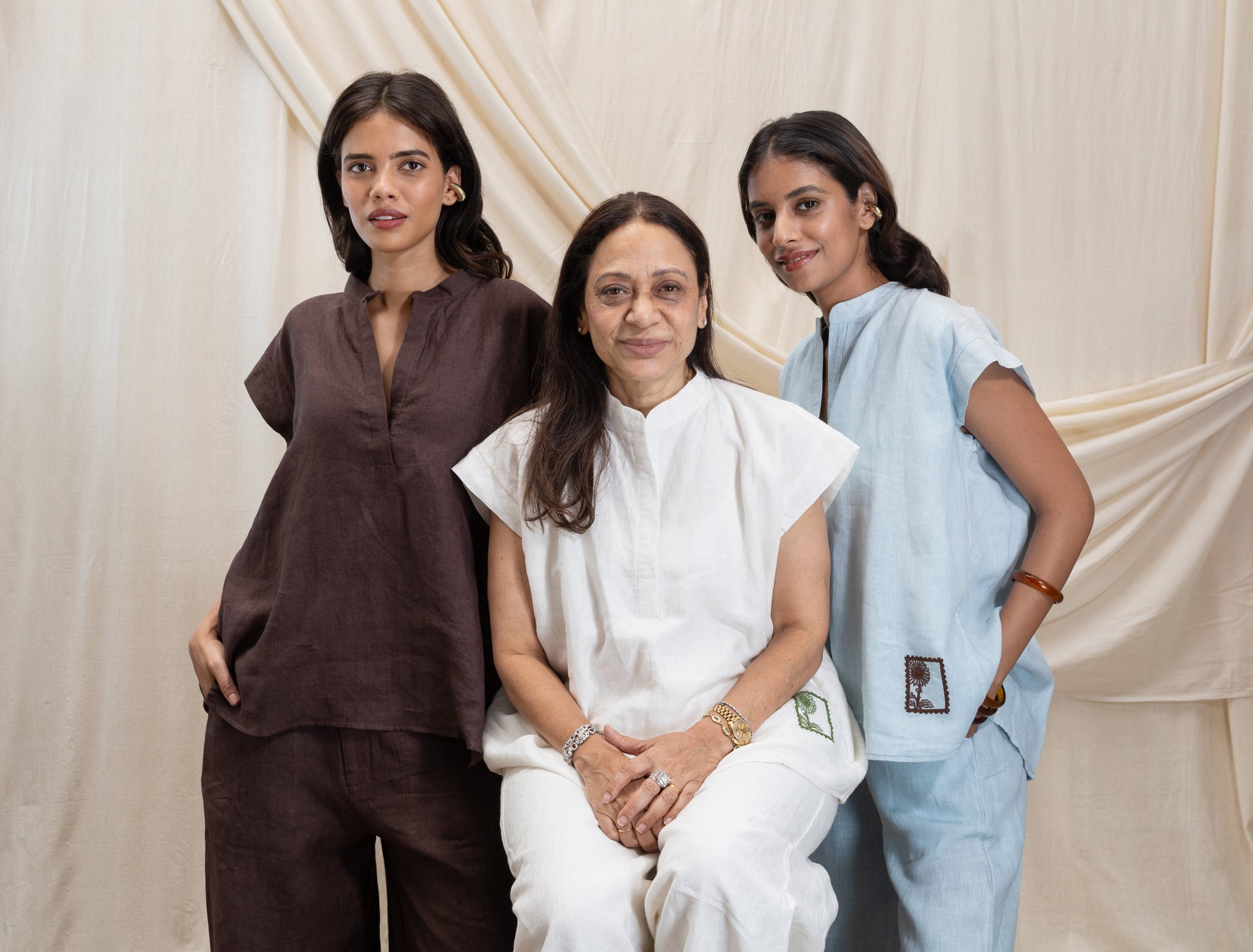 A box-style top with a slit V-neck at both the front and back, paired with a mandarin collar for a clean, modern touch. The back features soft pleats for added volume and ease, while drop shoulders and short sleeves enhance the relaxed feel. The back V-neckline is elevated with our signature line embroidery in a contrasting color, complemented by the Akashi logo in Hindi. Our signature stamp is placed at the front for a subtle yet distinct finish.