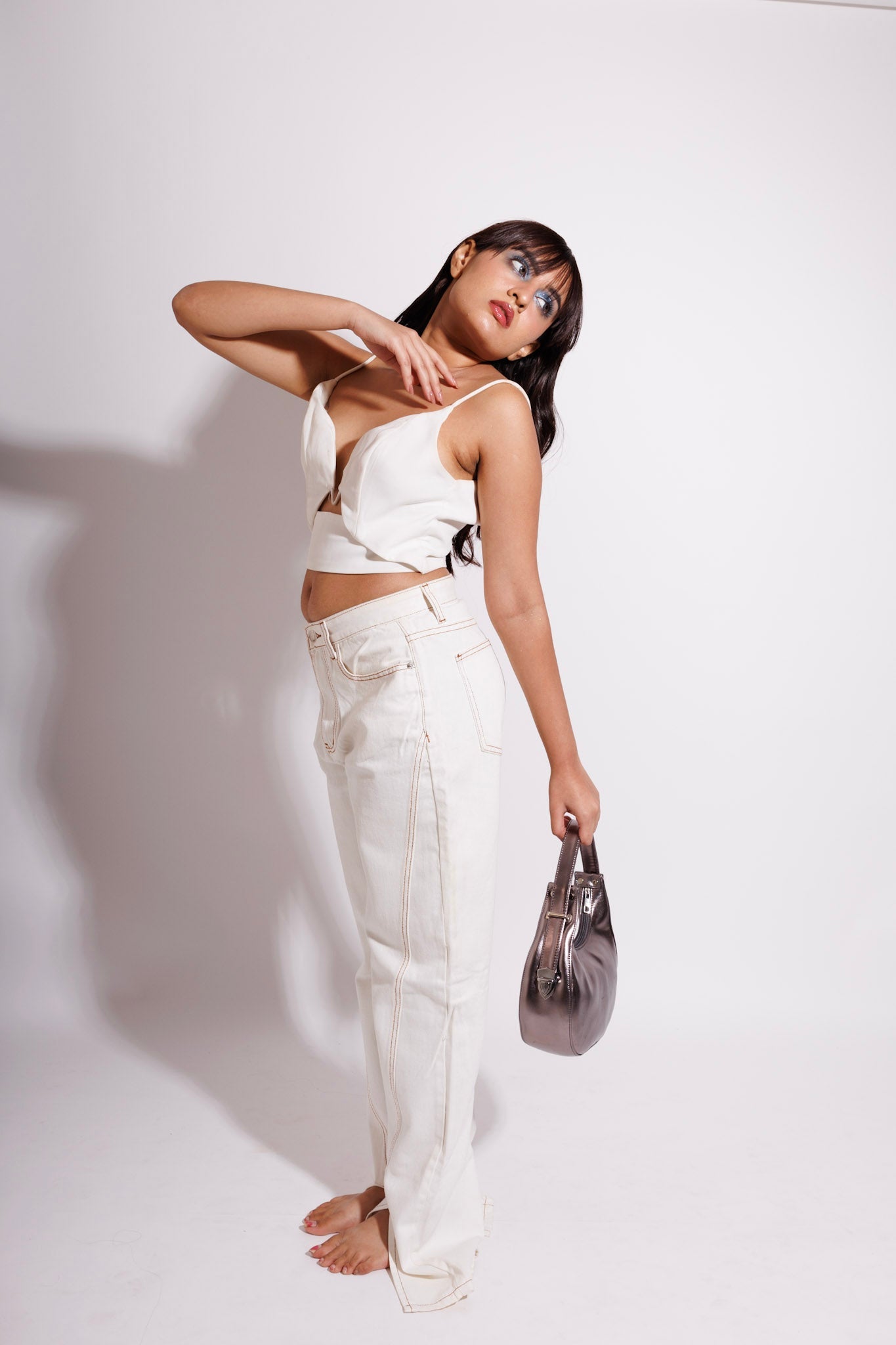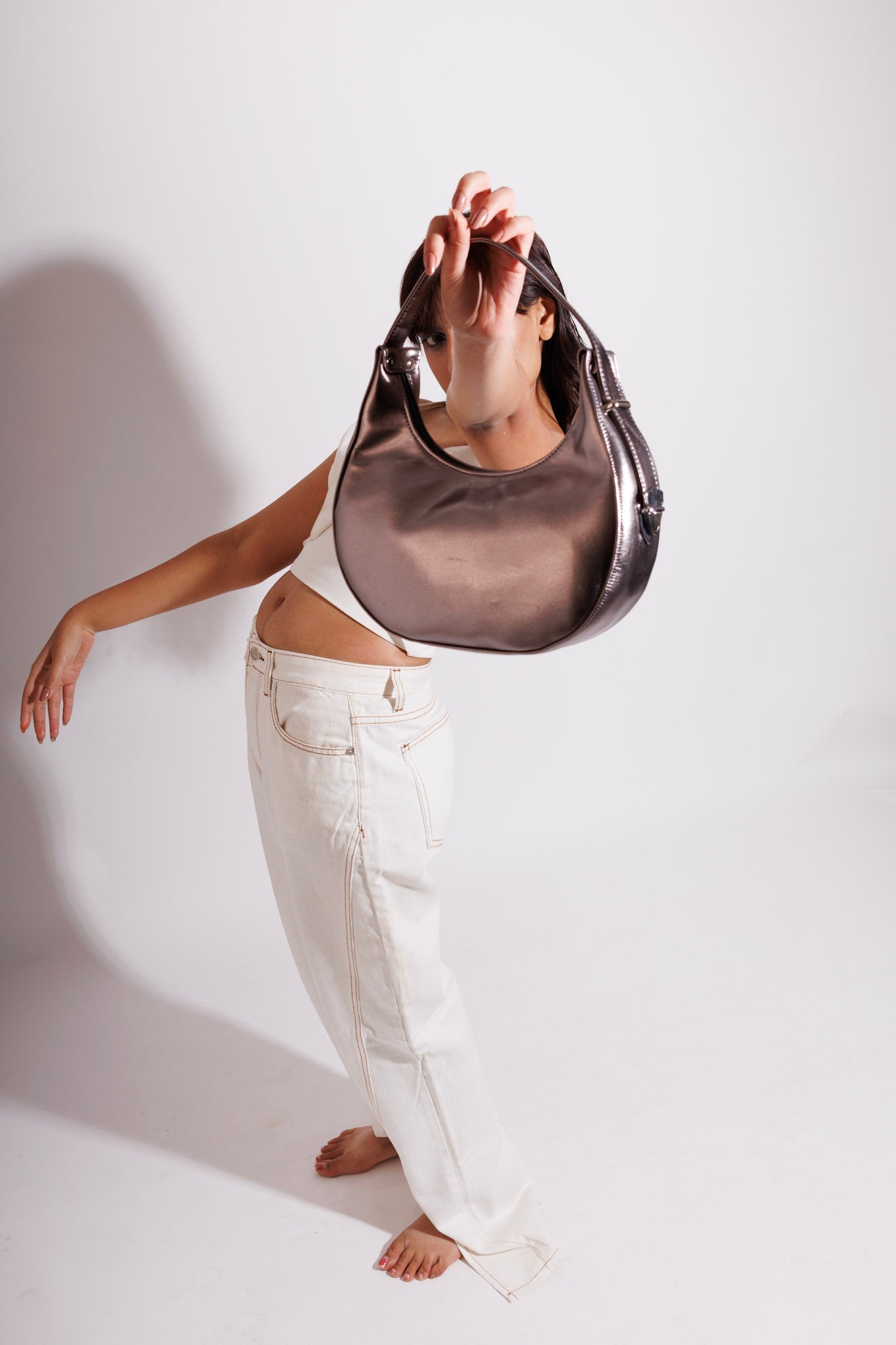 • Vegan Leather shoulder bag • Crafted in smooth PU with metallic finish • Structured silhouette • Zip closure • Cotton lining • Adjustable strap