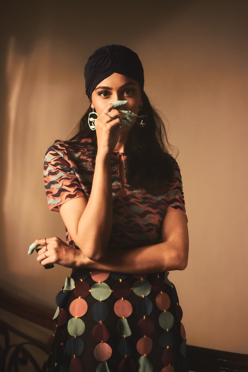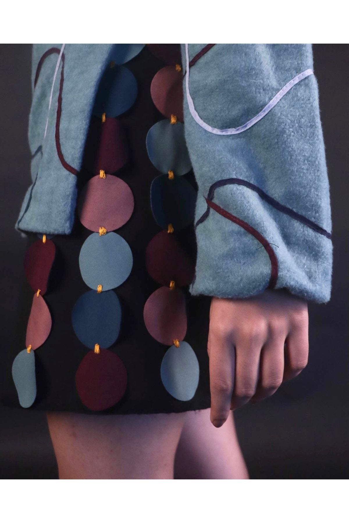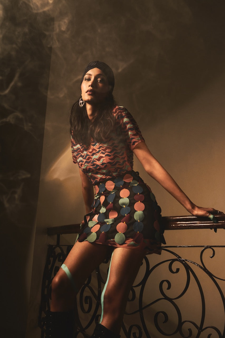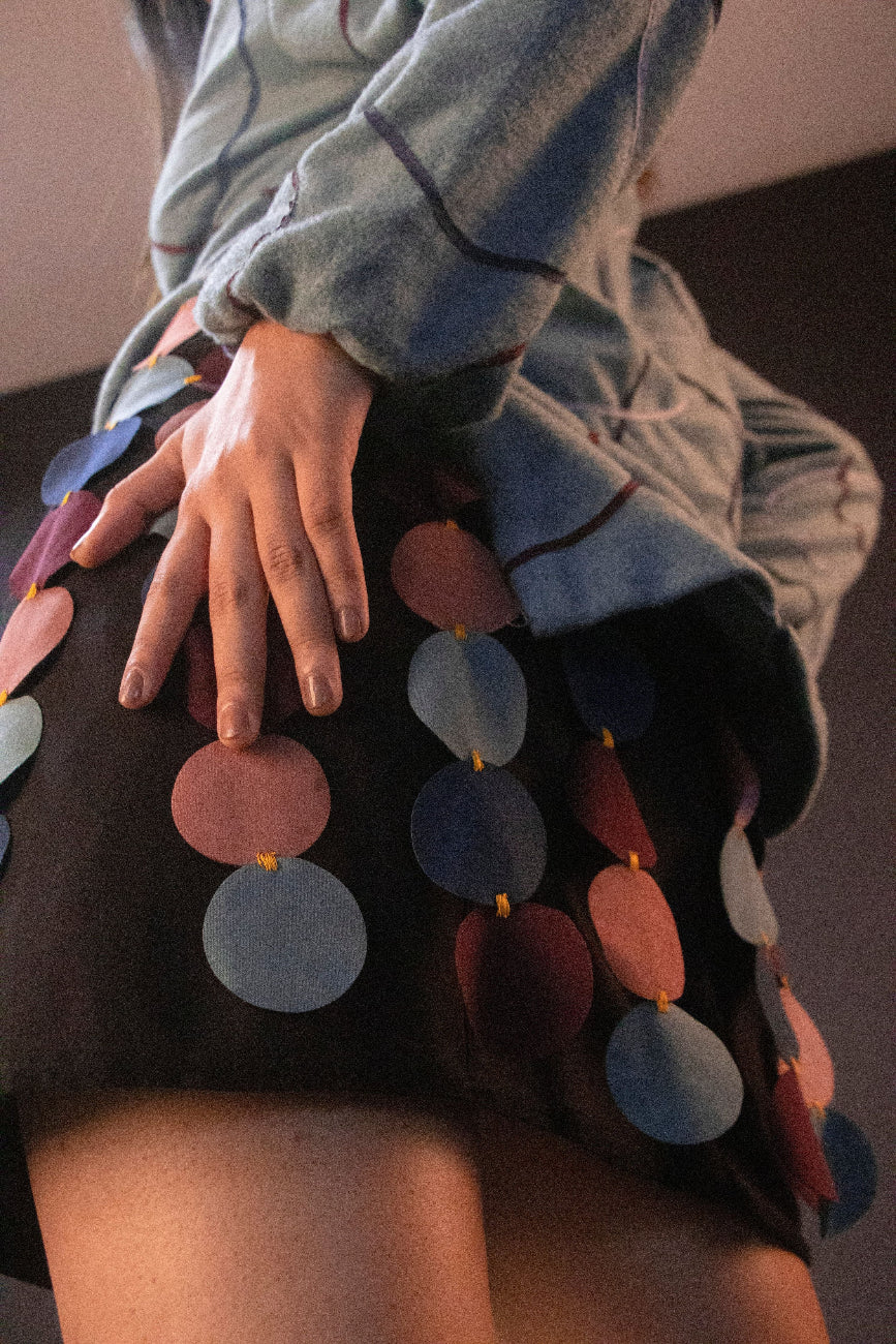 Statement mini skirt featuring bubble-inspired laser-cut circles hand-tacked using contrast resham thread.