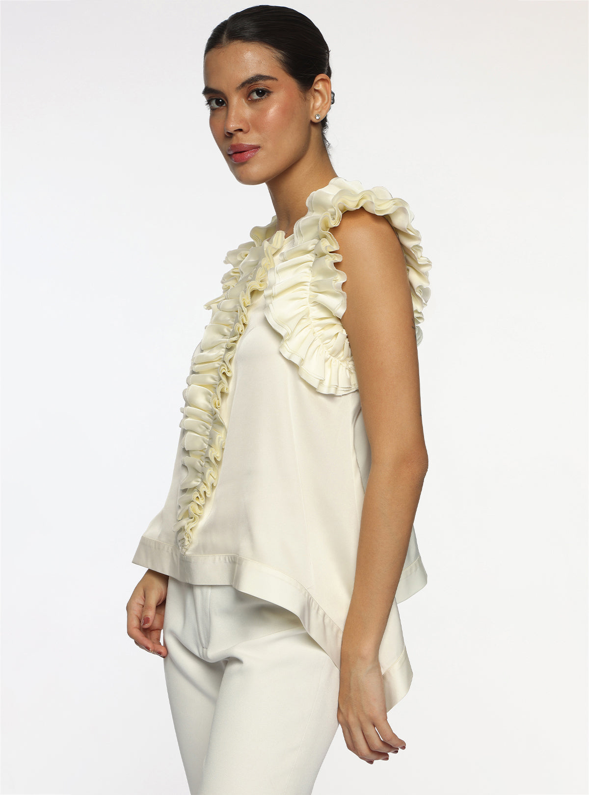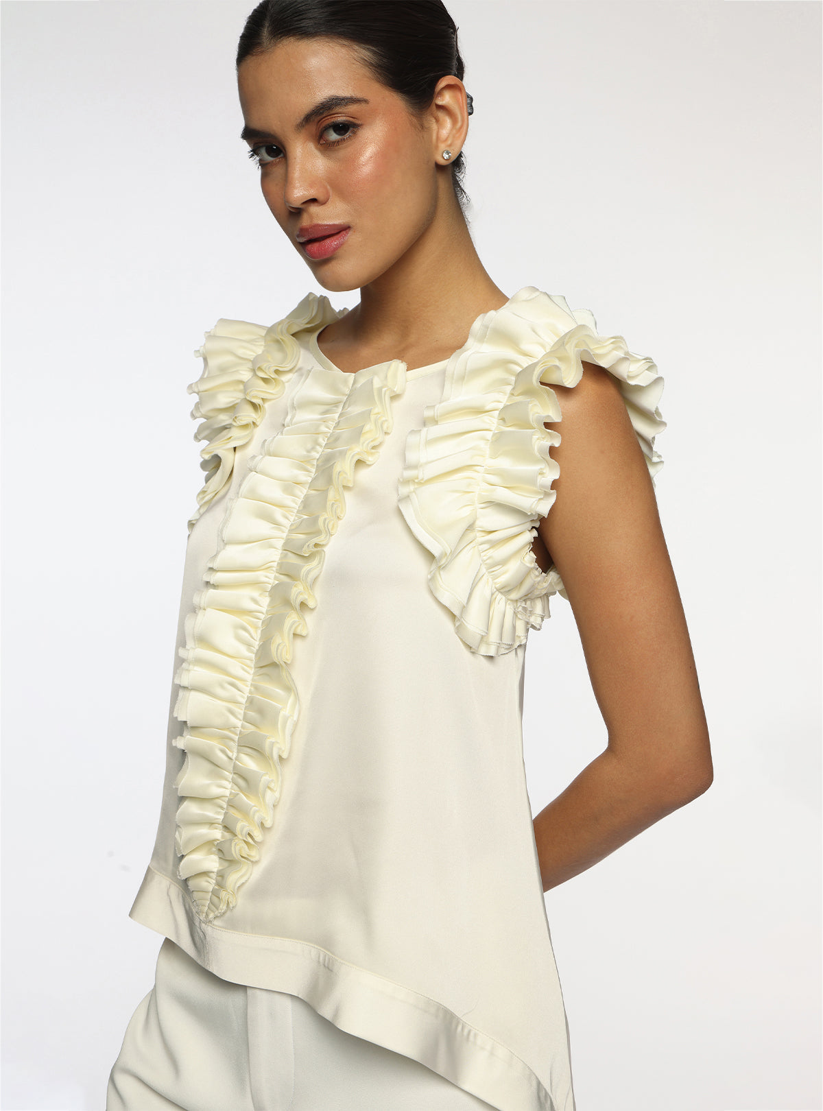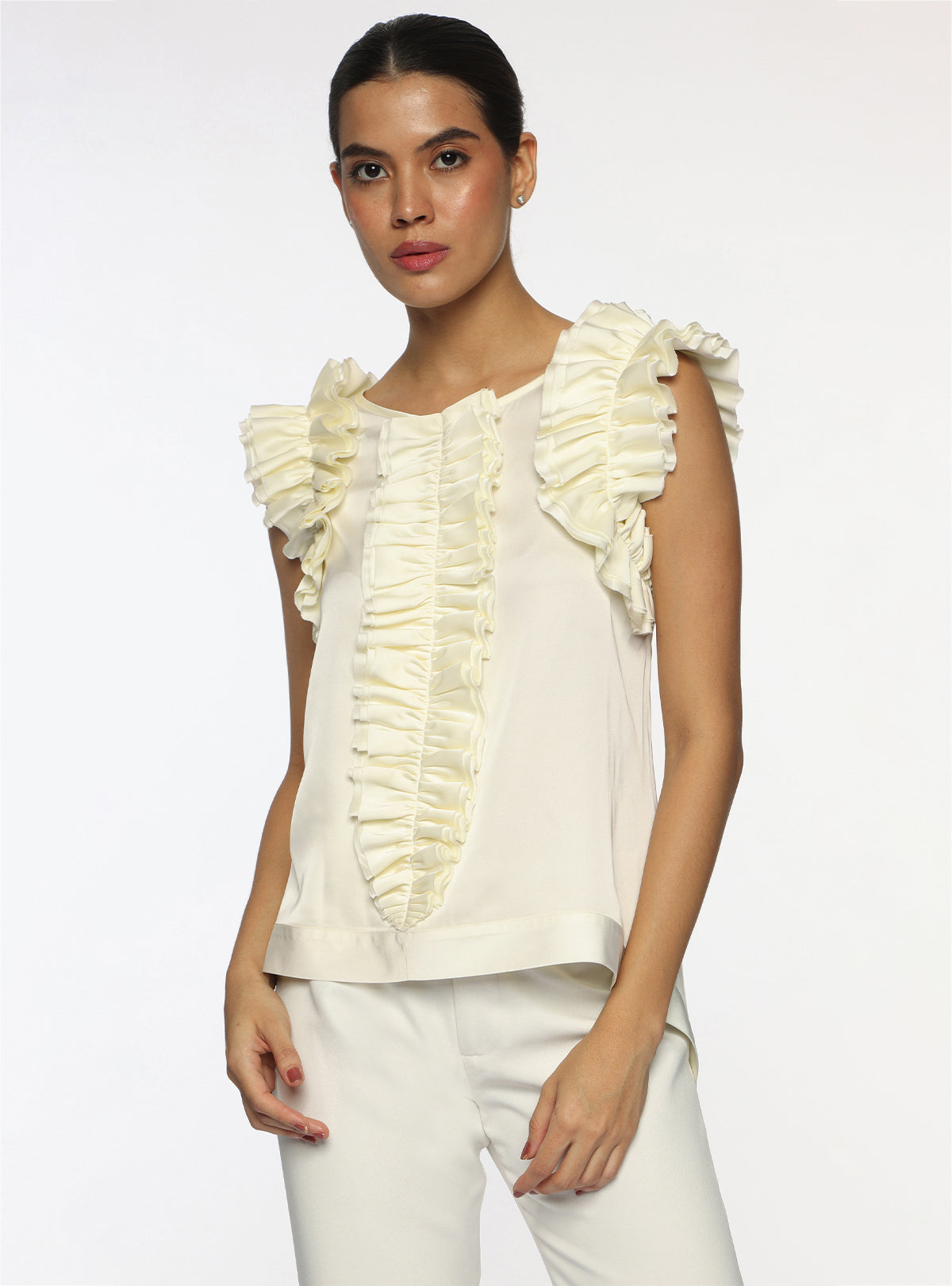 Introducing the captivating sleeveless top, adorned with delicately layered frills that dance across the armholes, center front, and center back. The center back placket adds a touch of elegance, while the bottom finished hem creates a clean, polished silhouette. This charming top is a masterful blend of femininity and sophistication, perfect for making a stylish statement.