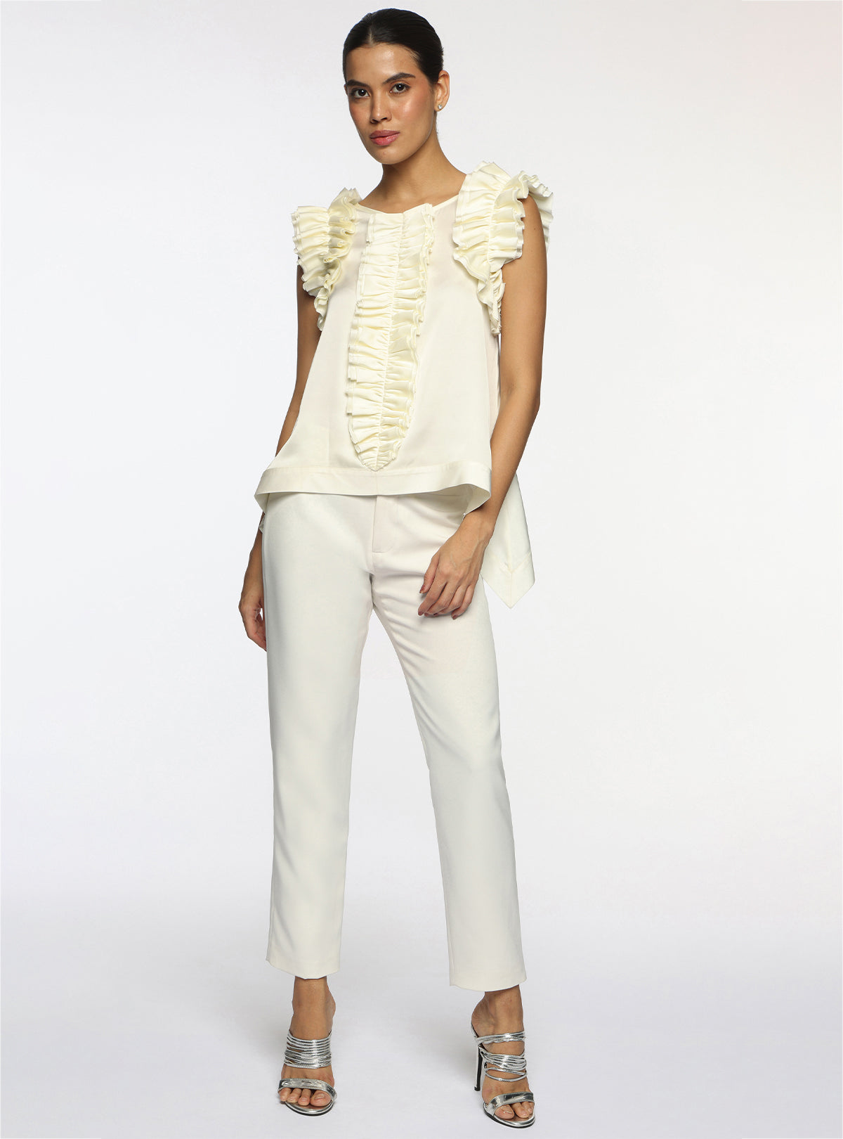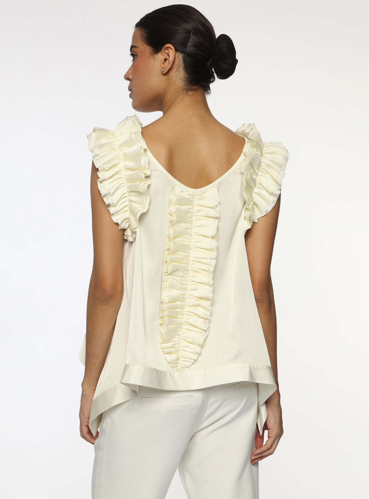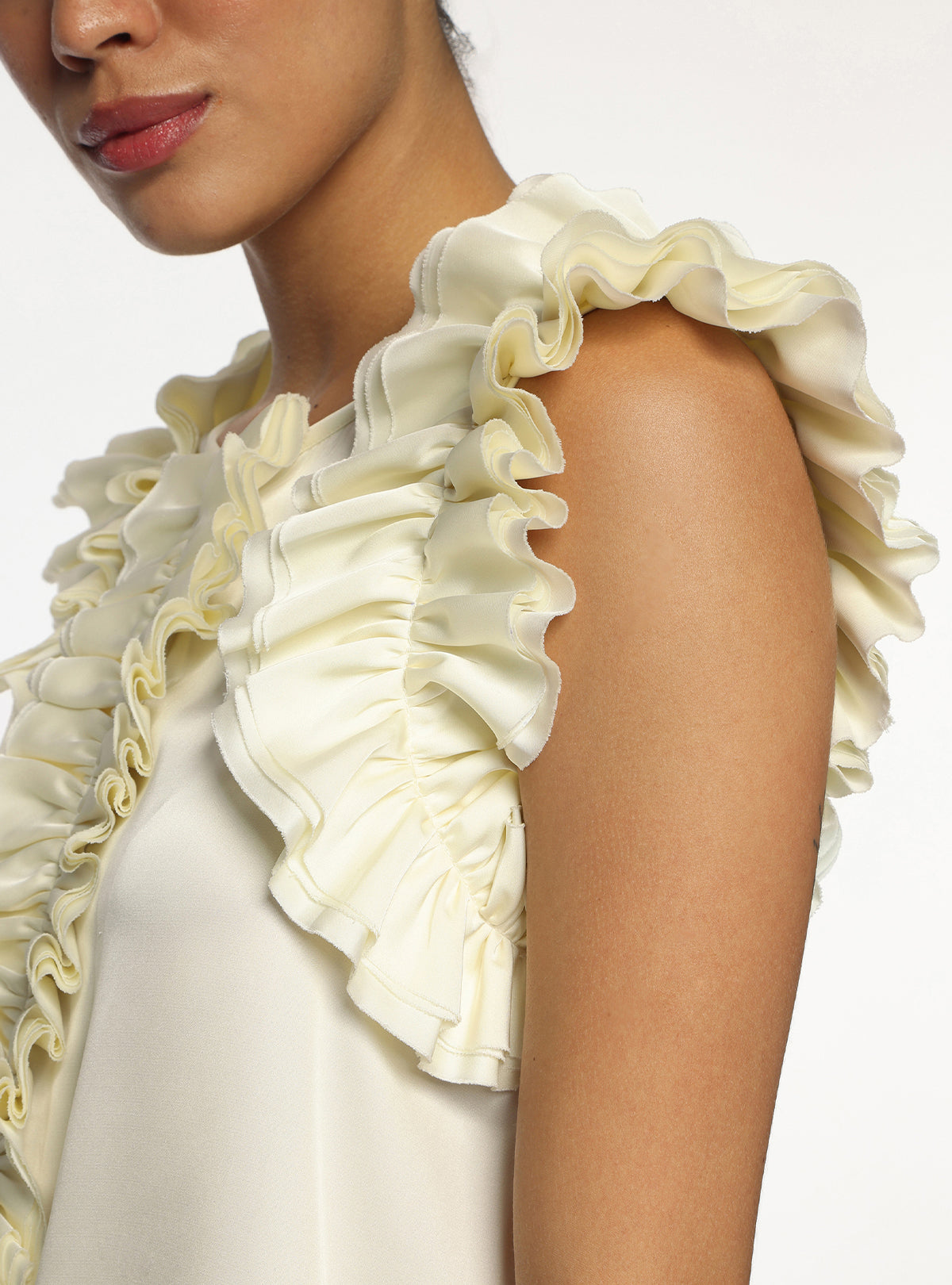 Introducing the captivating sleeveless top, adorned with delicately layered frills that dance across the armholes, center front, and center back. The center back placket adds a touch of elegance, while the bottom finished hem creates a clean, polished silhouette. This charming top is a masterful blend of femininity and sophistication, perfect for making a stylish statement.
