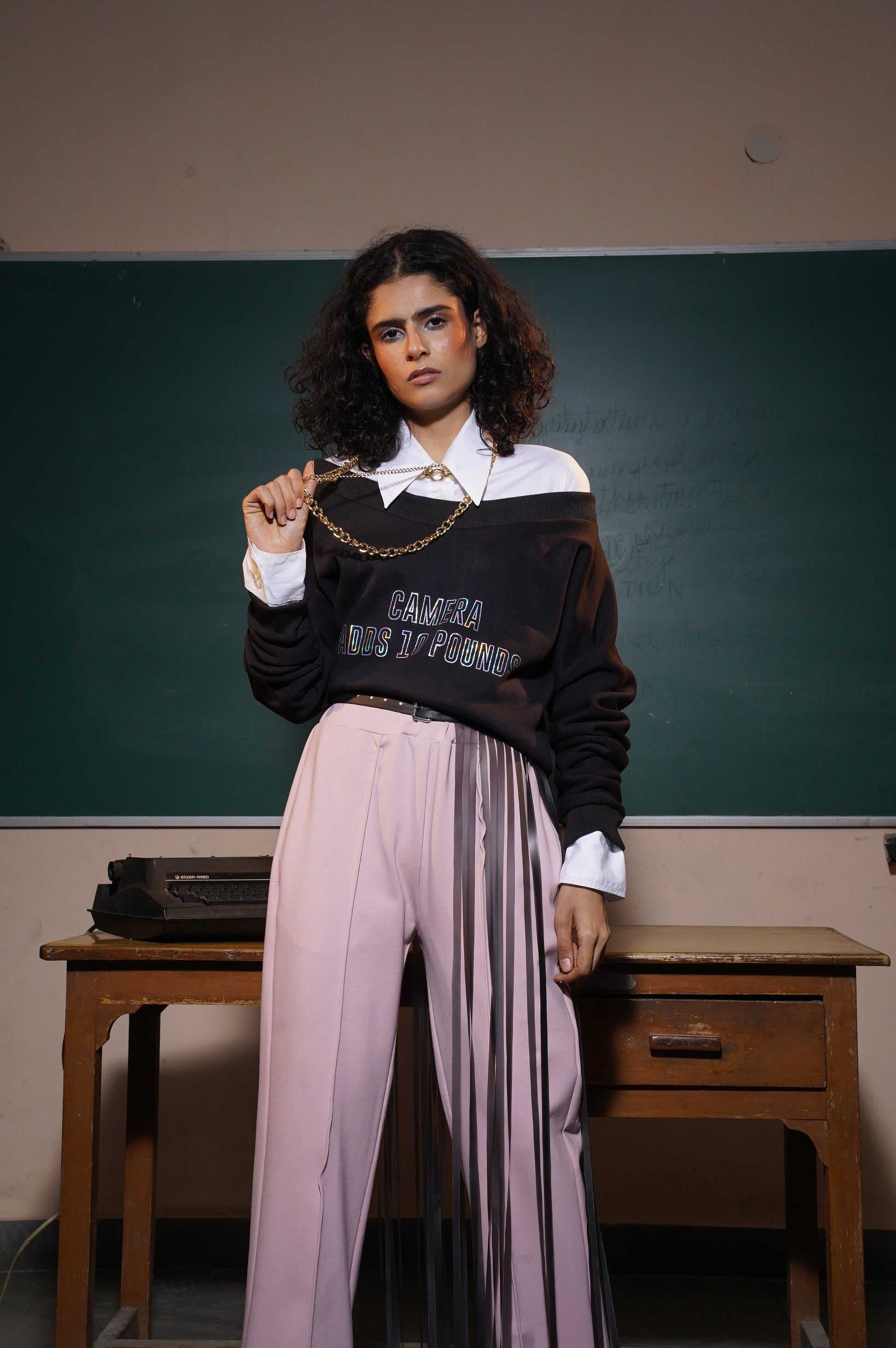 Asymmetric one shoulder sweatshirt featuring holographic print ‘camera adds 10 pounds’ finished with rib trims.
